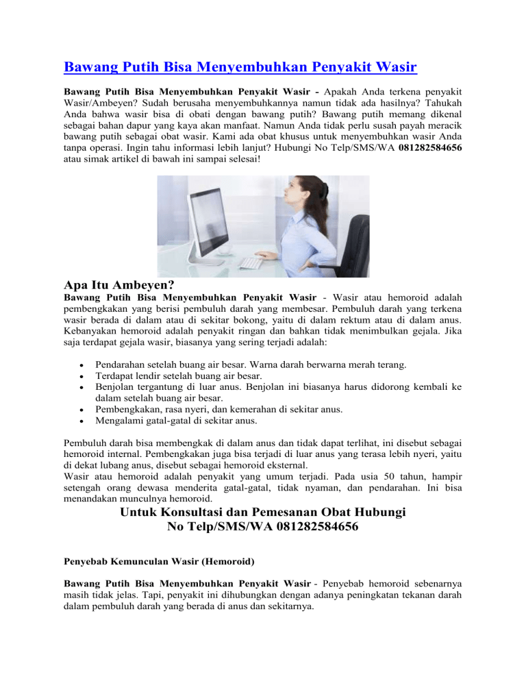 Bawang Putih Bisa Menyembuhkan Penyakit Wasir Bawang Putih Bisa Menyembuhkan Penyakit Wasir - Apakah Anda terkena penyakit Wasir/Ambeyen? Sudah berusaha menyembuhkannya namun tidak ada hasilnya? Tahukah Anda bahwa wasir bisa di obati dengan bawang putih? Bawang putih memang dikenal sebagai bahan dapur yang kaya akan manfaat. Namun Anda tidak perlu susah payah meracik bawang putih sebagai obat wasir. Kami ada obat khusus untuk menyembuhkan wasir Anda tanpa operasi. Ingin tahu informasi lebih lanjut? Hubungi No Telp/SMS/WA 081282584656 atau simak artikel di bawah ini sampai selesai! Apa Itu Ambeyen? Bawang Putih Bisa Menyembuhkan Penyakit Wasir - Wasir atau hemoroid adalah pembengkakan yang berisi pembuluh darah yang membesar. Pembuluh darah yang terkena wasir berada di dalam atau di sekitar bokong, yaitu di dalam rektum atau di dalam anus. Kebanyakan hemoroid adalah penyakit ringan dan bahkan tidak menimbulkan gejala. Jika saja terdapat gejala wasir, biasanya yang sering terjadi adalah: Pendarahan setelah buang air besar. Warna darah berwarna merah terang. Terdapat lendir setelah buang air besar. Benjolan tergantung di luar anus. Benjolan ini biasanya harus didorong kembali ke dalam setelah buang air besar. Pembengkakan, rasa nyeri, dan kemerahan di sekitar anus. Mengalami gatal-gatal di sekitar anus. Pembuluh darah bisa membengkak di dalam anus dan tidak dapat terlihat, ini disebut sebagai hemoroid internal. Pembengkakan juga bisa terjadi di luar anus yang terasa lebih nyeri, yaitu di dekat lubang anus, disebut sebagai hemoroid eksternal. Wasir atau hemoroid adalah penyakit yang umum terjadi. Pada usia 50 tahun, hampir setengah orang dewasa menderita gatal-gatal, tidak nyaman, dan pendarahan. Ini bisa menandakan munculnya hemoroid. Untuk Konsultasi dan Pemesanan Obat Hubungi No Telp/SMS/WA 081282584656 Penyebab Kemunculan Wasir (Hemoroid) Bawang Putih Bisa Menyembuhkan Penyakit Wasir - Penyebab hemoroid sebenarnya masih tidak jelas. Tapi, penyakit ini dihubungkan dengan adanya peningkatan tekanan darah dalam pembuluh darah yang berada di anus dan sekitarnya. Peningkatan tekanan darah di area anus dan rektum bisa disebabkan karena terlalu lama mengejan saat buang air besar. Konstipasi jadi penyebab utama dari orang mengejan. Konstipasi yang terjadi biasanya akibat dari kekurangan nutrisi serat di dalam makanan. Beberapa hal yang meningkatkan risiko Anda terkena hemoroid: Sering mengangkat benda berat secara rutin. Usia semakin tua, yang membuat penopang jaringan tubuh menjadi semakin lemah. Batuk terus menerus atau sering muntah. Kelebihan berat badan. Memiliki riwayat kesehatan keluarga yang sakit hemoroid. Sering duduk dalam waktu lama. Sedang hamil. Sering melakukan hubungan seks melalui anus (anal intercourse). Siapa saja yang berisiko kena wasir? Memiliki pekerjaan yang mengharuskan Anda duduk atau berdiri dalam waktu yang lama. Mengalami diare atau sembelit kronis. Anda mengalami obesitas. Ibu hamil. Sering melakukan seks anal, yakni penetrasi lewat anus. Konsumsi makanan tinggi lemak dan rendah serat. Tingkatan Stadium Wasir Atau Sakit Ambeien Pada Ibu Hamil Wasir stadium 1 : Wasir Jenis ini Biasanya tidak Sampai prolaps. Rasanya Cuma kadang Kurang Nyaman Saat Buang Air Besar. Ambeien stadium 2 : bagian anus sudah bisa diraba ada benjolan, namun bisanya belum ada pendarahan. kadang ada rasa panas dan gatal Wasir stadium 3 : benjolan pada anus sudah besar dan susah masuk lagi harus dibantu dengan jari Ambeien stadium 4 : benjolan vena sudah besar sekali dan sering pendarahan, Obat ambeien alami Untuk Konsultasi dan Pemesanan Obat Hubungi No Telp/SMS/WA 081282584656 Cara mengobati ambeien dengan bawang putih Bawang Putih Bisa Menyembuhkan Penyakit Wasir - Bawang putih tidak hanya berguna sebagai bumbu dapur saja. Meskipun baunya yang tidak enak atau menyengat, bawang putih memiliki banyak manfaat yang baik untuk kesehatan tubuh. Salah satunya adalah sebagai cara mengobati ambeien. Bawang putih banyak mengandung gizi penting yang dibutuhkan oleh tubuh seperti vitamin C, kalsium, besi, karbohidrat, serat, allicin, dan sulfida alili. Kandungan terbesar dalam bawang putih adalah allicin. Kandungan ini memiliki manfaat penting sebagai anti-oksidan dan anti-bakteri. Maka tidak salah jika bawang putih merupakan cara mengobati ambeien yang efektif. Cara mengobati ambeien dengan bawang putih mudah saja : Tumbuk halus 2 siung bawang putih Oleskan pada benjolan yang ada di sekitar anus Untuk melawan bakteri dari dalam, Anda bisa menggunakannya dengan cara meminum jus bawang putih setiap hari Baik mengoleskan pada benjolan ataupun meminumnya harus dilakukan dengan rutin agar benjolan ambeien segera kempes. Pertanyaan yang sering terpikirkan di benak Anda : Jika Saya terlanjur kena wasir bagaimana cara mengobatinya? Bagaimana cara mengobati wasir dengan cepat dan tuntas? Bagaimana berobat yang mudah tanpa perlu malu untuk ke dokter dan tanpa operasi? Jawabannya: semua bisa, asal Anda memilih produk yang tepat, yaitu Ambejoss dan Salep Salwa De Nature. Harga Rp 275.000 Anda ingin sembuh dari wasir? Segera hubungi tlp/sms/whatsapp : 081282584656 Sekedar informasi untuk kenyamanan Konsumen, bahwa Produk dari perusahaan kami ini sudah memiliki: Ijin Resmi Perusahaan dari Kementerian Kesehatan Ijin BPOM, yang artinya sudah lulus uji stabilitas Produk Sertifikat Halal MUI, sehingga halal bisa dipertanggungjawabkan Apoteker yang sudah berpengalaman Sudah melewati Proses Sortir Bahan Baku, Guna Menjaga Mutu Produk Proses Produksi Sesuai Alur CPOTB (Cara Pembuatan Obat Tradisional Yang Baik Dan Benar) Cara Pemesanan Pembayaran terlebih dulu via transfer Bank, setelah transfer SMS-kan konfirmasinya untuk proses pengiriman. Format Pemesanan: Nama, Alamat Lengkap beserta kode Pos, Nama Bank / Rekening anda, Nominal transfer, Nama Obat yg dipesan, No.Hp Anda Agar pesanan Anda bisa segera diproses, segera konfirmasikan pembayaran Anda via Telp/SMS/WA ke 081282584656 Setelah itu barang kami kirim melalui TIKI /