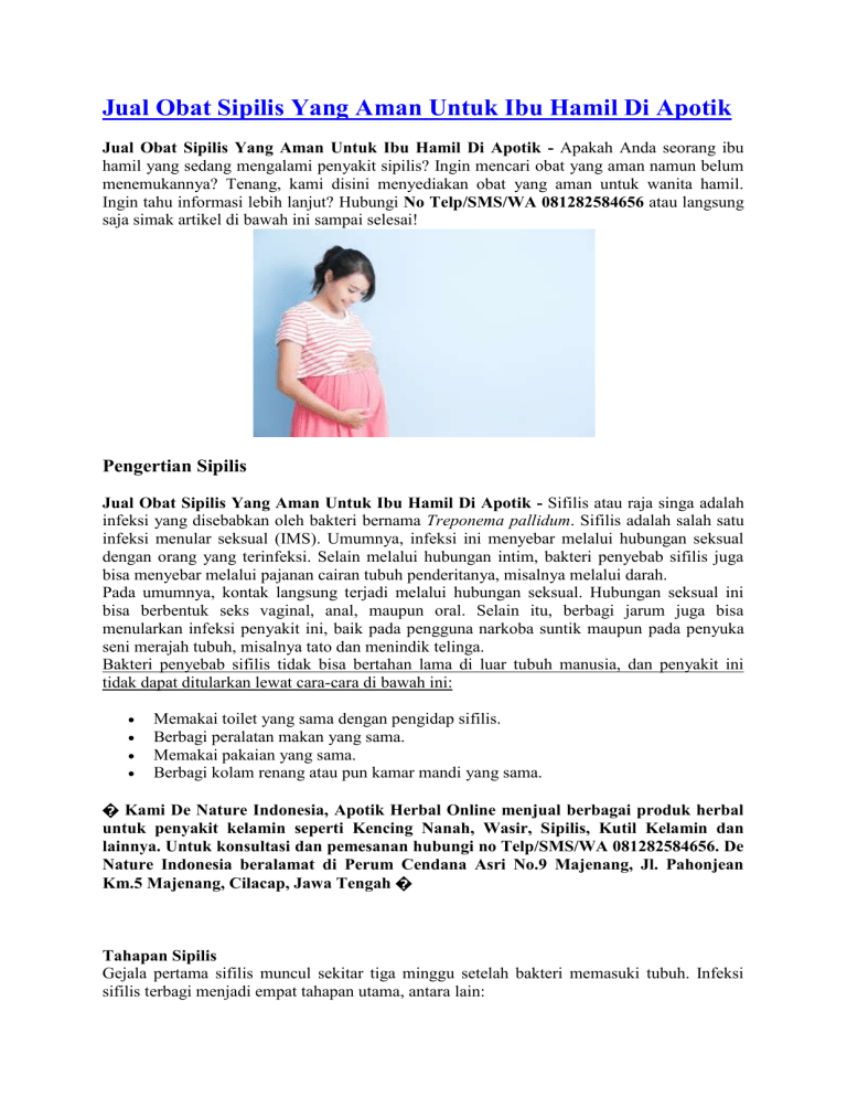 Jual Obat Sipilis Yang Aman Untuk Ibu Hamil Di Apotik Jual Obat Sipilis Yang Aman Untuk Ibu Hamil Di Apotik - Apakah Anda seorang ibu hamil yang sedang mengalami penyakit sipilis? Ingin mencari obat yang aman namun belum menemukannya? Tenang, kami disini menyediakan obat yang aman untuk wanita hamil. Ingin tahu informasi lebih lanjut? Hubungi No Telp/SMS/WA 081282584656 atau langsung saja simak artikel di bawah ini sampai selesai! Pengertian Sipilis Jual Obat Sipilis Yang Aman Untuk Ibu Hamil Di Apotik - Sifilis atau raja singa adalah infeksi yang disebabkan oleh bakteri bernama Treponema pallidum. Sifilis adalah salah satu infeksi menular seksual (IMS). Umumnya, infeksi ini menyebar melalui hubungan seksual dengan orang yang terinfeksi. Selain melalui hubungan intim, bakteri penyebab sifilis juga bisa menyebar melalui pajanan cairan tubuh penderitanya, misalnya melalui darah. Pada umumnya, kontak langsung terjadi melalui hubungan seksual. Hubungan seksual ini bisa berbentuk seks vaginal, anal, maupun oral. Selain itu, berbagi jarum juga bisa menularkan infeksi penyakit ini, baik pada pengguna narkoba suntik maupun pada penyuka seni merajah tubuh, misalnya tato dan menindik telinga. Bakteri penyebab sifilis tidak bisa bertahan lama di luar tubuh manusia, dan penyakit ini tidak dapat ditularkan lewat cara-cara di bawah ini: Memakai toilet yang sama dengan pengidap sifilis. Berbagi peralatan makan yang sama. Memakai pakaian yang sama. Berbagi kolam renang atau pun kamar mandi yang sama. � Kami De Nature Indonesia, Apotik Herbal Online menjual berbagai produk herbal untuk penyakit kelamin seperti Kencing Nanah, Wasir, Sipilis, Kutil Kelamin dan lainnya. Untuk konsultasi dan pemesanan hubungi no Telp/SMS/WA 081282584656. De Nature Indonesia beralamat di Perum Cendana Asri No.9 Majenang, Jl. Pahonjean Km.5 Majenang, Cilacap, Jawa Tengah � Tahapan Sipilis Gejala pertama sifilis muncul sekitar tiga minggu setelah bakteri memasuki tubuh. Infeksi sifilis terbagi menjadi empat tahapan utama, antara lain: Sifilis Primer Penderita sifilis mengalami gejala yang dimulai dengan lesi atau luka pada alat kelamin atau di dalam dan di sekitar mulut. Luka yang terjadi berbentuk seperti gigitan serangga tapi tidak menimbulkan rasa sakit. Pada tahap ini, jika orang yang terinfeksi berhubungan seksual dengan orang lain, penularan sangat mudah terjadi. Luka ini bertahan selama 1-2 bulan. Pada akhirnya, lesi ini akan sembuh tanpa meninggalkan bekas. � Sifilis Sekunder Penderita sifilis sekunder akan mengalami ruam merah serukuran koin kecil dan biasanya ruam ini muncul pada telapak tangan dan telapak kaki. Gejala lain yang mungkin muncul adalah demam, nafsu makan menurun, radang tenggorokan dan kutil kelamin. Fase ini bisa bertahan selama satu hingga tiga bulan. � Sifilis Laten Setelah fase sifilis sekunder, sifilis seakan-akan menghilang dan tidak menimbulkan gejala sama sekali. Masa laten ini bisa bertahan sekitar dua tahun sebelum kemudian lanjut ke masa yang paling berbahaya dalam infeksi sifilis yaitu sifilis tersier. � Sifilis Tersier Jika infeksi tidak terobati, sifilis akan berkembang ke tahapan akhir, yaitu sifilis tersier. Pada tahap ini, infeksi bisa memberi efek yang serius pada tubuh. Beberapa akibat dari infeksi pada tahapan ini adalah kelumpuhan, kebutaan, demensia, masalah pendengaran, impotensi, dan bahkan kematian jika tidak ditangani. Sifilis paling mudah menular pada fase sifilis primer dan sekunder. Jika Anda merasa terinfeksi sifilis, segera periksakan diri ke dokter atau klinik spesialis penyakit kelamin untuk memastikan diagnosis terhadap sifilis. Makin cepat sifilis diobati, makin kecil kemungkinan sifilis berkembang menjadi penyakit yang serius. GEJALA ATAU TANDA PENYAKIT SIPILIS Jual Obat Sipilis Yang Aman Untuk Ibu Hamil Di Apotik - Penyakit sipilis bisa menyebabkan kerusakan organ-organ tubuh. Kerusakan tersebut bisa menimpa syaraf, otak, otot, tulang, mata, serta organ bagian tubuh yang lainnya. Bahkan, jika sudah stadium lajut penyakit ini dapat menyebabkan kematian pada si penderita.Penyakit kelamin yang satu ini memang tidak boleh dianggap remeh. Perlu Anda ketahui bahwa penyakit ini akan menggerogoti sistem kekebalan tubuh penderita sehingga tubuh si penderita akan sangat mudah terkena penyakit dan bertambah parah karena infeksi dari bakteri penyebab penyakit ini menyebar keseluruh tubuh dengan cepat. Untuk itu sebaiknya kita dapat mengenali tandatanda penyakit kelamin ini melalui gejala yang muncul. � Informasi lebih lanjut hubungi Telp/SMS/WA 081282584656 Gejala/Tanda Penyakit Sipilis Pada Wanita 1. Keluarnya cairan tidak normal dari saluran kencing atau liang senggama 2. Timbulnya keputihan yang banyak, berbau amis, dan warnanya cenderung putih kehijauan. 3. Rasa nyeri ketika buang air kecil 4. Rasa nyeri saat berhubungan seksual 5. Timbulnya rasa gatal di alat kelamin atau sekitarnya dan menjadi luka koreng di kelamin. 6. Timbulnya luka kecil (terkadang tidak terasa sakit) disertai pembengkakan kelenjar getah bening. 7. Terjadinya perubahan warna kulit dan mata komplikasi bartolitis, yaitu membengkaknya kelenjar Bartholin mengakibatkan kesulitan berjalan karena rasa nyeri. Gejala/Tanda Penyakit Sipilis Pada Pria Sering nyeri selama hubungan seksual. Nyeri ketika buang air kecil. Keluarnya cairan atau kotoran dari penis laki-laki. Ada luka kerongkongan pada orang-orang melakukan oral sek, sehingga kerongkongan sering terasa sakit. Nyeri pada daerah sekitar anus (hal ini terjadi pada orang-orang melakukan anal sex). Luka memerah tanpa rasa sakit pada daerah kelamin, anus, kerongkongan dan atau lidah. Bintik merah pada kulit dan menjadi luka koreng di kelamin. Timbulnya bersisik pada telapak tangan dan telapak kaki. Urine (air kencing) berwarna cenderung gelap, feses berwarna terang. Mata dan kulit cendrung berwarna kuning. Timbulnya bentuk lepuh kecil pada daerah kelamin, dimana itu bisa berubah menjadi koreng. Pembengkakan pada kelenjar limfe. Timbulnya masalah de