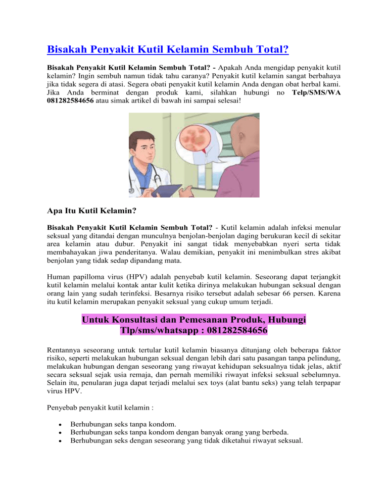 Bisakah Penyakit Kutil Kelamin Sembuh Total? Bisakah Penyakit Kutil Kelamin Sembuh Total? - Apakah Anda mengidap penyakit kutil kelamin? Ingin sembuh namun tidak tahu caranya? Penyakit kutil kelamin sangat berbahaya jika tidak segera di atasi. Segera obati penyakit kutil kelamin Anda dengan obat herbal kami. Jika Anda berminat dengan produk kami, silahkan hubungi no Telp/SMS/WA 081282584656 atau simak artikel di bawah ini sampai selesai! Apa Itu Kutil Kelamin? Bisakah Penyakit Kutil Kelamin Sembuh Total? - Kutil kelamin adalah infeksi menular seksual yang ditandai dengan munculnya benjolan-benjolan daging berukuran kecil di sekitar area kelamin atau dubur. Penyakit ini sangat tidak menyebabkan nyeri serta tidak membahayakan jiwa penderitanya. Walau demikian, penyakit ini menimbulkan stres akibat benjolan yang tidak sedap dipandang mata. Human papilloma virus (HPV) adalah penyebab kutil kelamin. Seseorang dapat terjangkit kutil kelamin melalui kontak antar kulit ketika dirinya melakukan hubungan seksual dengan orang lain yang sudah terinfeksi. Besarnya risiko tersebut adalah sebesar 66 persen. Karena itu kutil kelamin merupakan penyakit seksual yang cukup umum terjadi. Untuk Konsultasi dan Pemesanan Produk, Hubungi Tlp/sms/whatsapp : 081282584656 Rentannya seseorang untuk tertular kutil kelamin biasanya ditunjang oleh beberapa faktor risiko, seperti melakukan hubungan seksual dengan lebih dari satu pasangan tanpa pelindung, melakukan hubungan dengan seseorang yang riwayat kehidupan seksualnya tidak jelas, aktif secara seksual sejak usia remaja, dan pernah memiliki riwayat infeksi seksual sebelumnya. Selain itu, penularan juga dapat terjadi melalui sex toys (alat bantu seks) yang telah terpapar virus HPV. Penyebab penyakit kutil kelamin : Berhubungan seks tanpa kondom. Berhubungan seks tanpa kondom dengan banyak orang yang berbeda. Berhubungan seks dengan seseorang yang tidak diketahui riwayat seksual. Stres dan menderita infeksi virus lainnya seperti HIV atau herpes pada waktu yang sama. Tanda-tanda Ciri Penyakit Kutil Kelamin : Bisakah Penyakit Kutil Kelamin Sembuh Total? - Berikut Ciri ciri kutil kelamin pada wanita (Kondiloma Akuminata) atau jengger ayam ini bisa jadi penyakit paling mematikan dunia jika tidak segera di obati. Tidak hanya wanita sajayang patut mewaspadai tentang penyakit kutil kelamin ini, pria pun harus waspada pada munculnya kutil di kelamin tersebut. Berikut ini tanda-tanda atau ciri -ciri kutil kelamin beserta munculnya penyakit kutil kelamin atau jengger ayam yang patut di waspadai : Munculnya Benjolan di kelamin secara bergerombol Benjolan berisi daging Bentuk benjolan kecil Bengkak Kemerahan Menyerupai Jengger Ayam Menyerupai Kembang Kol Terasa Gatal Tidak Nyaman Pendarahan Nyeri Berbau Perih Kutil bisa berdarah Pada wanita muncul di bibir vagina, serviks, vagina Warna Kutil di kelamin hitam agak kemerahan, abu-abu agak kemerahan, cokelat agak kemerahan dan juga merah. Daerah penyebaran kutil kelamin pada Pria: Batang penis. Ujung kepala penis. Selangkangan. Paha bagian atas. Disekitar anus atau bisa didalamnya. Di dalam Uretra. Daerah penyebaran kutil kelamin pada Wanita: Anus. Vulva. Bagian antara anus dan kelamin. Leher Rahim. Paha bagian atas. Bagaimana cara mencegah Penyakit Kutil Kelamin? Untuk mengurangi risiko infeksi kutil kelamin bisa dilakukan dengan berbagai cara, antara lain : Gunakan kondom dengan benar setiap kali Anda berhubungan seks. Setia terhadap pasangan, jangan berganti-ganti partner seks. Membatasi kontak seksual hanya dengan satu pasangan yang benar-benar steril. Pertanyaan yang sering terpikirkan di benak Anda : Jika Saya terlanjur kena kutil kelamin bagaimana cara mengobatinya? Bagaimana cara mengobati kutil kelamin dengan cepat dan tuntas? Bagaimana berobat yang mudah tanpa perlu malu untuk ke dokter? Jawabannya: semua bisa, asal Anda memilih produk yang tepat, yaitu Gang Jie Gho Siah Pipeca dan Kapsul BD De Nature. Pengobatan Penyakit Kutil Kelamin Bisakah Penyakit Kutil Kelamin Sembuh Total? - Pengobatan Kutil Kelamin secara tradisional yaitu dengan menggunakan Obat Kutil Kelamin dari De Nature. Produk yang terbuat dari bahan herbal alami diramu dengan resep tradisional dan diolah secara teknologi modern, sehingga aman di konsumsi. Jadi anda juga tak perlu khawatir karena Obat Herbal De Nature yang kami tawarkan ini, Alhamdulillah, merupakan obat yang telah banyak menyembuhkan penderitanya baik dari dalam maupun luar negeri. Sudah banyak pasien kami yang merasakan kesembuhannya dengan mengonsumsi obat herbal dari De Nature. Rp 950.000,Pemesanan obat hubungi tlp/sms/whatsapp : 081282584656 Sekedar informasi untuk kenyamanan Konsumen, bahwa Produk dari perusahaan kami ini sudah memiliki: Ijin Resmi Perusahaan dari Kementerian Kesehatan Ijin BPOM, yang artinya sudah lulus uji stabilitas Produk Sertifikat Halal MUI, sehingga halal bisa dipertanggungjawabkan Apoteker yang sudah berpengalaman Sudah melewati Proses Sortir Bahan Baku, Guna Menjaga Mutu Produk Proses Produksi Sesuai Alur CPOTB (Cara Pembuatan Obat Tradisional Yang Baik Dan Benar). Cara Pembelian: Pembayaran terlebih dulu via transfer Bank, setelah transfer SMS-kan konfirmasinya untuk proses pengiriman. Format Pemesanan: Nama, Alamat Lengkap beserta kode Pos, Nama Bank / Rekening anda, Nominal transfer, Nama Obat yg dipesan, No.Hp Anda Agar pesanan Anda bisa segera diproses, segera konfirmasikan pembayaran Anda via Telp/SMS/WA ke 081282584656 Setelah itu barang kami kirim melalui TIKI / JNE / J&T / POS. CONTOH SMS KONFIRMASI: Ahmad Husein, Jl.Raya Perumas Cendana Asri No.95, Kecamatan Majenang, Kabupaten Cilacap, Provinsi Jawa Tengah Kode Pos 53257, Rekening Pentransfer atas Nama Ahmad Husein, Transfer 320rb, Obat Eksim, 081xxxxxxxxx INFO LENGKAP HUBUNGI KAMI: Telp/SMS/WA ke 081282584656 Sistem Pembayaran : Nikmati pembayaran yang aman dan nyaman melalui Bank BRI, BNI, BCA, dan Mandiri. Jasa Pengiriman : Barang Kami Kirim via POS, JNE atau TIKI Sesuai Kesepakatan Dan Permintaa