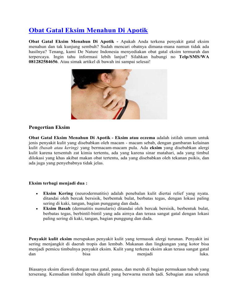 Obat Gatal Eksim Menahun Di Apotik Obat Gatal Eksim Menahun Di Apotik - Apakah Anda terkena penyakit gatal eksim menahun dan tak kunjung sembuh? Sudah mencari obatnya dimana-mana namun tidak ada hasilnya? Tenang, kami De Nature Indonesia menyediakan obat gatal eksim termurah dan terpercaya. Ingin tahu informasi lebih lanjut? Silahkan hubungi no Telp/SMS/WA 081282584656. Atau simak artikel di bawah ini sampai selesai! Pengertian Eksim Obat Gatal Eksim Menahun Di Apotik - Eksim atau eczema adalah istilah umum untuk jenis penyakit kulit yang disebabkan oleh macam - macam sebab, dengan gambaran kelainan kulit (basah atau kering) yang bermacam-macam pula. Ada eksim yang disebabkan alergi kulit karena tersentuh zat kimia tertentu, ada yang karena sinar matahari, ada yang timbul dilokasi yang khas akibat makan obat tertentu, ada yang disebabkan oleh tekanan psikis, dan ada juga yang penyebabnya tidak jelas. Eksim terbagi menjadi dua : Eksim Kering (neurodermatitis) adalah penebalan kulit diertai relief yang nyata. ditandai oleh bercak bersisik, berbentuk bulat, berbatas tegas, dengan lokasi paling sering di kaki, tangan, bagian punggung dan dada. Eksim Basah (dermatitis numularis) ditandai oleh bercak bersisik, berbentuk bulat, berbatas tegas, berbintil-bintil yang ada airnya dan terasa sangat gatal dengan lokasi paling sering di kaki, tangan, bagian punggung dan dada. Penyakit kulit eksim merupakan penyakit kulit yang termasuk alergi turunan. Penyakit ini sering menjangkit di daerah tropis dan lembab. Makanan dan lingkungan yang kotor bisa menjadi pemicu timbulnya penyakit eksim. Kulit yang terkena eksim akan terasa sangat gatal dan bisa menjadi luka. Biasanya eksim diawali dengan rasa gatal, panas, dan merah di bagian permukaan tubuh yang terserang. Kemudian timbul lepuh dikulit yang berwarna merah tadi. Sebagian atau seluruh lepuh dapat berisi nanah yang mudah pecah. Dalam keadaan ini eksim dikenal dengan eksim basah. Lama kelamaan lepuh mengering dan mengeropeng yang disebut eksim kering. Eksim kering dapat berubah lagi menjadi eksim basah jika lepuh bernanah timbul lagi. Harga Rp 295.000 Informasi lebih lanjut hubungi Telp/SMS/WA 081282584656 Apa Saja Gejala Eksim? Obat Gatal Eksim Menahun Di Apotik - Dimanapun lokasi timbulnya eksim, gejala utama yang dirasakan pasien adalah gatal. Terkadang rasa gatal sudah muncul sebelum ada tanda kemerahan pada kulit. Gejala kemerahan biasanya akan muncul pada wajah, lutut, tangan dan kaki, namun tidak menutup kemungkinan kemerahan muncul di daerah lain. Daerah yang terkena akan terasa sangat kering, menebal atau keropeng. Pada orang kulit putih, daerah ini pada mulanya akan berwarna merah muda lalu berubah menjadi cokelat. Sementara itu pada orang dengan kulit lebih gelap, eksim akan mempengaruhi pigmen kulit sehingga daerah eksim akan tampak lebih terang atau lebih gelap. Apa yang Menjadi Penyebab Eksim Obat Gatal Eksim Menahun Di Apotik - Penyebab dari eksim sebenarnya belum diketahui dengan pasti, namun beberapa ahli mencurigai eksim berhubungan dengan aktifitas daya pertahanan tubuh (imun) yang berlebihan. Hal ini menyebabkan tubuh mengalami reaksi berlebihan terhadap bakteri atau iritan yang sebenarnya tidak berbahaya pada kulit. Oleh karena itu, eksim banyak ditemukan pada keluarga dengan riwayat penyakit alergi atau asma. Tiap tiap orang mempunyai pencetus eksim yang berbeda beda. Ada orang yang setelah memegang sabun atau deterjen akan merasakan gatal yang luar biasa, ada pula yang disebabkan oleh bahan atau alat rumah tangga yang lain. Gejala yang timbul pun bervariasi, ada yang gatalnya ringan tetapi rasa panas yang dominan, ada pula yang sebaliknya. Infeksi saluran nafas bagian atas atau flu juga bisa menjadi pencetus timbulnya eksim. Stress yang dialami penderita akan membuat gejala menjadi lebih buruk. Jenis – Jenis Penyakit Gatal Eksim : 1. Dermatitis atopik : salah satu jenis eksim yang paling sering dijumpai dan merupakan penyakit turunan. Dermatitis atopik umumnya dimulai ketika bayi dan masih anakanak dengan gejala berupa gatal, radang kulit, dan pada sebagian penderita sering timbul asma dan demam hay (hay fever). 2. Dermatitis kontak : meliputi dermatitis kontak alergik dan iritan. Dermatitis kontak alergik disebabkan oleh reaksi kekebalan tertunda (delayed immune system) akibat kontak kulit dengan senyawa alergenik sehingga menyebabkan radang kulit dalam 48 jam setelah paparan terjadi. Beberapa agen penyebab eksim jenis ini adalah jelatang, parfum, pengawet kosmetik, metal, dan pewarna. 3. Dermatitis kontak iritan terjadi karena paparan senyawa iritan yang dapat merusak kulit secara kimiawi, contohnya sabun keras, detergen, dan produk pembersih lainnya. Senyawa iritan tersebut dapat menghilangkan minyak dan kelembaban dari lapisan luar kulit, kemudian merusak lapisan pelindung dan memicu terjadinya peradangan. 4. Eksim numular : beberapa plak eksim yang biasanya berhubungan dengan kulit kering dan terjadi pada bagian luar dari kaki, tangan, dan lengan. 5. Eksim stasis : jenis eksim kronis pada daerah bawah kaki bagian dalam yang berkaitan dengan varises. Pertanyaan yang sering terpikirkan di benak Anda : Jika Saya terlanjur kena penyakit eksim, bagaimana cara mengobatinya? Bagaimana cara mengobati penyakit eksim dengan cepat dan tuntas? Bagaimana berobat yang mudah tanpa perlu malu untuk ke dokter? Jawabannya: semua bisa, asal Anda memilih produk yang tepat, yaitu Eximtas, Kapsul BD De Nature dan Salep Exclear. Pengobatan Penyakit Eksim Obat Gatal Eksim Menahun Di Apotik - Pengobatan Eksim secara tradisional yaitu dengan menggunakan Obat Eksim dari De Nature. Produk yang terbuat dari bahan herbal alami diramu dengan resep tradisional dan diolah secara teknologi modern, sehingga aman di konsumsi. Jadi anda juga tak perlu khawatir karena Obat Herbal De Nature yang kami tawarkan ini, Alhamdulillah, merupakan obat yang telah banyak menyembuhkan penderitanya baik dari dalam maupun luar negeri. Sudah banyak pasien kami yang merasakan 