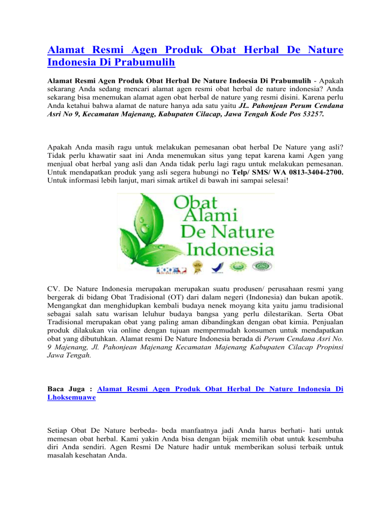 Alamat Resmi Agen Produk Obat Herbal De Nature Indonesia Di Prabumulih Alamat Resmi Agen Produk Obat Herbal De Nature Indoesia Di Prabumulih - Apakah sekarang Anda sedang mencari alamat agen resmi obat herbal de nature indonesia? Anda sekarang bisa menemukan alamat agen obat herbal de nature yang resmi disini. Karena perlu Anda ketahui bahwa alamat de nature hanya ada satu yaitu JL. Pahonjean Perum Cendana Asri No 9, Kecamatan Majenang, Kabupaten Cilacap, Jawa Tengah Kode Pos 53257. Apakah Anda masih ragu untuk melakukan pemesanan obat herbal De Nature yang asli? Tidak perlu khawatir saat ini Anda menemukan situs yang tepat karena kami Agen yang menjual obat herbal yang asli dan Anda tidak perlu lagi ragu untuk melakukan pemesanan. Untuk mendapatkan produk yang asli segera hubungi no Telp/ SMS/ WA 0813-3404-2700. Untuk informasi lebih lanjut, mari simak artikel di bawah ini sampai selesai! CV. De Nature Indonesia merupakan merupakan suatu produsen/ perusahaan resmi yang bergerak di bidang Obat Tradisional (OT) dari dalam negeri (Indonesia) dan bukan apotik. Mengangkat dan menghidupkan kembali budaya nenek moyang kita yaitu jamu tradisional sebagai salah satu warisan leluhur budaya bangsa yang perlu dilestarikan. Serta Obat Tradisional merupakan obat yang paling aman dibandingkan dengan obat kimia. Penjualan produk dilakukan via online dengan tujuan mempermudah konsumen untuk mendapatkan obat yang dibutuhkan. Alamat resmi De Nature Indonesia berada di Perum Cendana Asri No. 9 Majenang, Jl. Pahonjean Majenang Kecamatan Majenang Kabupaten Cilacap Propinsi Jawa Tengah. Baca Juga : Alamat Resmi Agen Produk Obat Herbal De Nature Indonesia Di Lhoksemuawe Setiap Obat De Nature berbeda- beda manfaatnya jadi Anda harus berhati- hati untuk memesan obat herbal. Kami yakin Anda bisa dengan bijak memilih obat untuk kesembuha diri Anda sendiri. Agen Resmi De Nature hadir untuk memberikan solusi terbaik untuk masalah kesehatan Anda. Sekarang Anda bisa mendapatkan obat de nature dengat sangat mudah, Anda cukup duduk nyaman dirumah dan pesan produk obat herbal de nature yang sedang Anda butuhkan saat ini. Hubungi kontak kami, lalu Anda bisa melakukan transaksi pembayaran terlebih dahulu, kemudian barang akan langsung kami kirimkan kealamat yang Anda berikan. Produk- produk De Nature Yang Paling Di Minati 1. PAKET PENGOBATAN WASIR/ AMBEIEN Pengobatan Wasir/ Ambeien yang terkenal yaitu obat Ambejoss dan Salwa, obat ini sudah sangat terkenal ampuh untuk menyembuhkan wasir/ ambeien. Sebelumnya Merk pertama obat ini adalah Ambeclear dan sekarang mejadi Ambejoss. Obat ini sangat banyak sekali peminatnya diseluruh Indonesia. Jenis Obat Wasir/ Ambeien De Nature : AMBEJOSS SALEP SALWA ZIIRZAK ZAITOP 2. PAKET PENGOBATAN SIPILIS, KENCING NANAH, GONORE (BAIK UNTUK PRIA DAN WANITA) Obat Sipilis, Kencing Nanah, Gonore (baik untuk pria dan wanita) karena sudah terbukti khasiatnya, obat jenis ini juga sangat diminati oleh para pasien kami diseluruh Indonesia. Jenis Obat Sipilis, Kencing Nanah, Gonore De Nature : GANG JIE GHO SIAH KAPSUL BD PIPECA SALEP PLUS 3. PAKET PENGOBATAN KUTIL KELAMIN (PADA WANITA DAN PRIA) Obat Kutil Kelamin (untuk wanita dan pria) jenis obat ini sangat terbukti keamannya. De Nature sebagai produsen obat kutil kelamin paling terpercaya, kami menyediakan paket hemat pengobatan kutil kelamin untuk wanita dan pria. Jenis Obat Kutil Kelamin De Nature : GANG JIE GHO SIAH KAPSUL BD PIPECA SALEP PLUS ANTIPILOMA MADU HERBAL OBAT HERBAL DE NATURE INDONESIA TERPERCAYA JL. Pahonjean Perum Cendana Asri No 9, Kecamatan Majenang, Kabupaten Cilacap,Jawa Tengah Kode Pos 53257 Whatsapp/ Telp/ Sms : 0813-3404-2700 Kami Agen Resmi De Nature menyediakan berbagai macam obat herbal de nature sebagai solusi untuk masalah kesehatan Anda. Anda sekarang tidak perlu lagi bingung- bingung untuk mencari obat herbal yang ampuh untuk menyembuhkan penyakit yang sedang Anda derita, setiap penyakit pasti ada obatnya tetapi tidak semua penyakit obatnya sama, jadi Anda harus bijak dalam memilih obat herbal. Obat herbal de nature adalah solusi yang tepat untuk setiap penyakit Anda, Anda tidak perlu ragu untuk mengonsumsi obat herbal de nature, karena de nature dijamin aman dan ampuh untuk segala penyakit Anda. Berikut Daftar Produk Obat Herbal De Nature Indonesia : Obat eksim De Nature Indonesia Obat kencing nanah De Nature Indonesia Obat herpes De Nature Indonesia Obat kanker De Nature Indonesia Obat tumor De Nature Indonesia Obat kista De Nature Indonesia Obat keputihan De Nature Indonesia Obat perawatan miss v De Nature Indonesia Obat perapat miss v de nature Obat gatal De Nature Indonesia Obat fistula ani De Nature Indonesia Obat stroke De Nature Indonesia Obat paru paru De Nature Indonesia Obat batuk berdarah De Nature Indonesia Obat TBC De Nature Indonesia Obat diabetes De Nature Indonesia Obat asam urat De Nature Indonesia Obat kolesterol De Nature Indonesia Obat maag kronis De Nature Indonesia Obat pembesar penis De Nature Indonesia Obat kuat De Nature Indonesia Obat batu ginjal De Nature Indonesia Obat hepatitis De Nature Indonesia Obat penyubur kandungan De Nature Indonesia Obat pelangsing De Nature Indonesia Obat penggemuk badan De Nature Indonesia Obat pembersih darah De Nature Indonesia Obat penyakit kulit De Nature Indonesia Anda bisa sembuh lebih cepat dengan mengonsumsi obat herbal de nature dibandingkan dengan mengonsumsi obat herbal yang ada dipasaran. Karena obat herbal de nature terbuat dari bahan- bahan alami yang sudah terbukti khasiatnya dan diproduksi langsung oleh para ahli yang handal, dan produk kami diterima langsung oleh para konsumen secara langsung. Jadi Anda tidak perlu khawatir untuk melakukan pemesanan produk obat herbal de nature kami Anda cukup duduk dan pesan obat herbal de nature yang Anda butuhkan. Karena de nature tidak dipasarkan di apotik ataupun toko- toko obat manapun. Kami memudahkan Anda dalam membeli obat herbal de nature kami. Oleh sebab itu semua obat De Nature yang Anda cari hanya dij