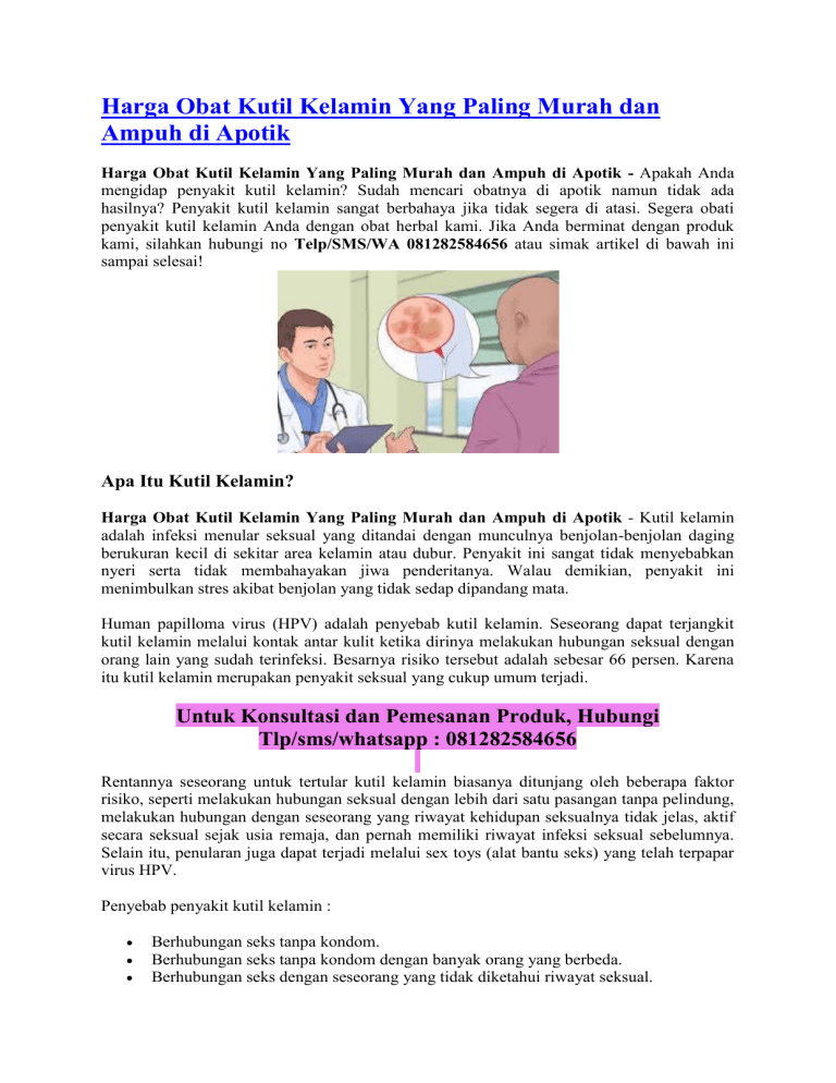 Harga Obat Kutil Kelamin Yang Paling Murah dan Ampuh di Apotik Harga Obat Kutil Kelamin Yang Paling Murah dan Ampuh di Apotik - Apakah Anda mengidap penyakit kutil kelamin? Sudah mencari obatnya di apotik namun tidak ada hasilnya? Penyakit kutil kelamin sangat berbahaya jika tidak segera di atasi. Segera obati penyakit kutil kelamin Anda dengan obat herbal kami. Jika Anda berminat dengan produk kami, silahkan hubungi no Telp/SMS/WA 081282584656 atau simak artikel di bawah ini sampai selesai! Apa Itu Kutil Kelamin? Harga Obat Kutil Kelamin Yang Paling Murah dan Ampuh di Apotik - Kutil kelamin adalah infeksi menular seksual yang ditandai dengan munculnya benjolan-benjolan daging berukuran kecil di sekitar area kelamin atau dubur. Penyakit ini sangat tidak menyebabkan nyeri serta tidak membahayakan jiwa penderitanya. Walau demikian, penyakit ini menimbulkan stres akibat benjolan yang tidak sedap dipandang mata. Human papilloma virus (HPV) adalah penyebab kutil kelamin. Seseorang dapat terjangkit kutil kelamin melalui kontak antar kulit ketika dirinya melakukan hubungan seksual dengan orang lain yang sudah terinfeksi. Besarnya risiko tersebut adalah sebesar 66 persen. Karena itu kutil kelamin merupakan penyakit seksual yang cukup umum terjadi. Untuk Konsultasi dan Pemesanan Produk, Hubungi Tlp/sms/whatsapp : 081282584656 Rentannya seseorang untuk tertular kutil kelamin biasanya ditunjang oleh beberapa faktor risiko, seperti melakukan hubungan seksual dengan lebih dari satu pasangan tanpa pelindung, melakukan hubungan dengan seseorang yang riwayat kehidupan seksualnya tidak jelas, aktif secara seksual sejak usia remaja, dan pernah memiliki riwayat infeksi seksual sebelumnya. Selain itu, penularan juga dapat terjadi melalui sex toys (alat bantu seks) yang telah terpapar virus HPV. Penyebab penyakit kutil kelamin : Berhubungan seks tanpa kondom. Berhubungan seks tanpa kondom dengan banyak orang yang berbeda. Berhubungan seks dengan seseorang yang tidak diketahui riwayat seksual. Stres dan menderita infeksi virus lainnya seperti HIV atau herpes pada waktu yang sama. Tanda-tanda Ciri Penyakit Kutil Kelamin : Harga Obat Kutil Kelamin Yang Paling Murah dan Ampuh di Apotik - Berikut Ciri ciri kutil kelamin pada wanita (Kondiloma Akuminata) atau jengger ayam ini bisa jadi penyakit paling mematikan dunia jika tidak segera di obati. Tidak hanya wanita sajayang patut mewaspadai tentang penyakit kutil kelamin ini, pria pun harus waspada pada munculnya kutil di kelamin tersebut. Berikut ini tanda-tanda atau ciri -ciri kutil kelamin beserta munculnya penyakit kutil kelamin atau jengger ayam yang patut di waspadai : Munculnya Benjolan di kelamin secara bergerombol Benjolan berisi daging Bentuk benjolan kecil Bengkak Kemerahan Menyerupai Jengger Ayam Menyerupai Kembang Kol Terasa Gatal Tidak Nyaman Pendarahan Nyeri Berbau Perih Kutil bisa berdarah Pada wanita muncul di bibir vagina, serviks, vagina Warna Kutil di kelamin hitam agak kemerahan, abu-abu agak kemerahan, cokelat agak kemerahan dan juga merah. Daerah penyebaran kutil kelamin pada Pria: Batang penis. Ujung kepala penis. Selangkangan. Paha bagian atas. Disekitar anus atau bisa didalamnya. Di dalam Uretra. Daerah penyebaran kutil kelamin pada Wanita: Anus. Vulva. Bagian antara anus dan kelamin. Leher Rahim. Paha bagian atas. Bagaimana cara mencegah Penyakit Kutil Kelamin? Untuk mengurangi risiko infeksi kutil kelamin bisa dilakukan dengan berbagai cara, antara lain : Gunakan kondom dengan benar setiap kali Anda berhubungan seks. Setia terhadap pasangan, jangan berganti-ganti partner seks. Membatasi kontak seksual hanya dengan satu pasangan yang benar-benar steril. Pertanyaan yang sering terpikirkan di benak Anda : Jika Saya terlanjur kena kutil kelamin bagaimana cara mengobatinya? Bagaimana cara mengobati kutil kelamin dengan cepat dan tuntas? Bagaimana berobat yang mudah tanpa perlu malu untuk ke dokter? Jawabannya: semua bisa, asal Anda memilih produk yang tepat, yaitu Gang Jie Gho Siah Pipeca dan Kapsul BD De Nature. Pengobatan Penyakit Kutil Kelamin Harga Obat Kutil Kelamin Yang Paling Murah dan Ampuh di Apotik- Pengobatan Kutil Kelamin secara tradisional yaitu dengan menggunakan Obat Kutil Kelamin dari De Nature. Produk yang terbuat dari bahan herbal alami diramu dengan resep tradisional dan diolah secara teknologi modern, sehingga aman di konsumsi. Jadi anda juga tak perlu khawatir karena Obat Herbal De Nature yang kami tawarkan ini, Alhamdulillah, merupakan obat yang telah banyak menyembuhkan penderitanya baik dari dalam maupun luar negeri. Sudah banyak pasien kami yang merasakan kesembuhannya dengan mengonsumsi obat herbal dari De Nature. Rp 950.000,Pemesanan obat hubungi tlp/sms/whatsapp : 081282584656 Sekedar informasi untuk kenyamanan Konsumen, bahwa Produk dari perusahaan kami ini sudah memiliki: Ijin Resmi Perusahaan dari Kementerian Kesehatan Ijin BPOM, yang artinya sudah lulus uji stabilitas Produk Sertifikat Halal MUI, sehingga halal bisa dipertanggungjawabkan Apoteker yang sudah berpengalaman Sudah melewati Proses Sortir Bahan Baku, Guna Menjaga Mutu Produk Proses Produksi Sesuai Alur CPOTB (Cara Pembuatan Obat Tradisional Yang Baik Dan Benar). Cara Pembelian: Pembayaran terlebih dulu via transfer Bank, setelah transfer SMS-kan konfirmasinya untuk proses pengiriman. Format Pemesanan: Nama, Alamat Lengkap beserta kode Pos, Nama Bank / Rekening anda, Nominal transfer, Nama Obat yg dipesan, No.Hp Anda Agar pesanan Anda bisa segera diproses, segera konfirmasikan pembayaran Anda via Telp/SMS/WA ke 081282584656 Setelah itu barang kami kirim melalui TIKI / JNE / J&T / POS. CONTOH SMS KONFIRMASI: Ahmad Husein, Jl.Raya Perumas Cendana Asri No.95, Kecamatan Majenang, Kabupaten Cilacap, Provinsi Jawa Tengah Kode Pos 53257, Rekening Pentransfer atas Nama Ahmad Husein, Transfer 320rb, Obat Eksim, 081xxxxxxxxx INFO LENGKAP HUBUNGI KAMI: Telp/SMS/WA ke 081282584656 Sistem Pembayaran : Nikmati pembayaran yang aman dan nyaman melalui Bank BRI, BNI, B