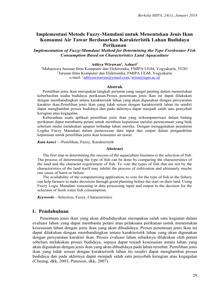 Berkala MIPA, 24(1), Januari 2014 Implementasi Metode Fuzzy-Mamdani untuk Menentukan Jenis Ikan Konsumsi Air Tawar Berdasarkan Karakteristik Lahan Budidaya Perikanan Implementation of Fuzzy-Mamdani Method for Determining the Type Freshwater Fish Consumption Based on Characteristics Land Aquaculture Aditya Wirawan1, Azhari2 Mahasiswa Jurusan Ilmu Komputer dan Elektronika, FMIPA UGM, Yogyakarta, 55281 2 Jurusan Ilmu Komputer dan Elektronika, FMIPA UGM, Yogyakarta e-mail: [email protected],[email protected] 1 Abstrak Pemilihan jenis ikan merupakan langkah pertama yang sangat penting dalam menentukan keberhasilan usaha budidaya perikanan.Proses penentuan jenis ikan ini dapat dilakukan dengan membandingkan antara karakteristik lahan yang akan digunakan dengan persyaratan karakter ikan.Pemilihan jenis ikan yang tidak sesuai dengan karakteristik lahan itu sendiri dapat menghambat proses budidaya dan pada akhirnya dapat menjadi salah satu penyebab kerugian atau kegagalan. Keberadaan suatu aplikasi pemilihan jenis ikan yang terkomputerisasi dalam bidang perikanan dapat membantu petani untuk membuat keputusan melalui perencanaan yang baik sebelum mulai melakukan apapun terhadap lahan mereka. Dengan menggunakan penalaran Logika Fuzzy Mamdani dalam pemrosesan data input dan output dalam pengambilan keputusan untuk pemilihan jenis ikan konsumsi air tawar. Kata kunci —Pemilihan, Fuzzy, Karakteristik Abstract The first step in determining the success of the aquaculture business is the selection of fish. The process of determining the type of fish can be done by comparing the characteristics of the land and the character requirement of fish. To vote the types of fish that are not by the characteristics of the land itself may inhibit the process of cultivation and ultimately maybe one cause of harm or failure. The availability of the computerizing application, to vote for the type of fish in the fishery can help farmers to make decisions through good planning before the start on their land. Using Fuzzy Logic Mamdani reasoning in data processing input and output in the decision for the selection of fresh water fish consumption. Keywords—Selection, Fuzzy, Characteristics 1. Pendahuluan Penentuan jenis ikan yang akan dibudidayakan merupakan salah satu kegiatan dalam evaluasi lahan yang dapat membantu petani atau pelaksana perikanan untuk menentukan kesesuaian lahan dengan jenis ikan yang akan dibudidaya. Proses penentuan jenis ikan ini dapat dilakukan dengan membandingkan antara karakteristik lahan yang akan digunakan dengan persyaratan karakter ikan. Proses evaluasi lahan sebaiknya dilakukan oleh petani sebelum melakukan proses budidaya, supaya dapat terjadi kesesuaian antara lahan yang akan digunakan dengan jenis ikan yang akan dibudidaya pada lahan tersebut. Pemilihan jenis ikan yang tidak sesuai dengan karakteristik lahan itu sendiri dapat menghambat proses budidaya dan pada akhirnya dapat menjadi salah satu penyebab kerugian atau kegagalan (Cheung, dkk, 2003; Paterson, dkk, 2007). 29 Wirawan dan Azhari, Implementasi Metode Fuzzy-Mamdani Keberadaan suatu aplikasi pemilihan jenis ikan yang terkomputerisasi dalam bidang perikanan dapat membantu petani untuk membuat keputusan melalui perencanaan yang baik sebelum mulai melakukan apapun terhadap lahan mereka. 2. Metode Penelitian 2.1 Analisis dan Perancangan Sistem Pada Gambar 1 diperlihatkan diagram rencana dari bagian utama aplikasi perangkat lunak yang akan dikerjakan (Kadir, 2003). Dari gambar terlihat user melakukan input data sesuai dengan 8 parameter meliputi :ketinggian (dpl), suhu air, kedalaman air, pH air, kandungan O2 (mg/liter), kandungan CO2 (mg/liter), kadar garam air (%), Amonium terikat (mg/liter). Pemilihan parameter tersebut berdasarkan informasi dari dinas perikanan yogyakarta bahwa parameter tersebut sudah dapat membantu penentuan ikan yang sesuai. Kemudian sistem akan menghitung menggunakan fuzzy mamdani, yang sebelumnya sudah ada data pendukung komoditas perikanan konsumsi air tawar dalam database yang meliputi 8 komoditas yaitu: 1. bawal ( Pampus Argentus ), 2. gurami ( Osphronemus gouramy ), 3. nila ( Tilapia nilotica ), 4. patin (Pangasius pangasius ), 5. lele (Clarias Batrachus), 6. mas ( Cyprinus carpio ), 7. udang (Macrobanchium rosenbergi), 8. tawes ( Punctius javanicus ). Input Proses Output Lahan budidaya perikanan : · Ketinggian · suhu air · kedalaman air · pH air · kandungan O2 · kadar garam air Penentuan jenis ikan dengan fuzzy mamdani Jenis ikan konsumsi air tawar Gambar 1 Diagram rancangan sistem 2.2 Fuzzy Mamdani Logika fuzzy merupakan pengembangan dari logika primitif yang hanya mengenal keadaan, yaitu “ya” atau “tidak”. Dengan adanya logika fuzzy, dapat mengenal peubahpeubah linguistik seperti “agak besar”, “besar”, “sangat besar”, dan sebagainya.Dengan demikian, aplikasi logika fuzzi akan menyebabkan sistem lebih adaftif (Wang. 1997; Tung and Quek, 2009). Dalam membangun sebuah sistem Fuzzy dikenal beberapa metode penalaran, antara lain: metode Tsukomoto, metode mamdani dan metode Sugeno. Untuk perancangan Sistem Pendukung Keputusan Seleksi Anggota Paduan Suara Kategori Dewasa ini, digunakan metode Mamdani. 30 Berkala MIPA, 24(1), Januari 2014 Metode Mamdani sering juga dikenal dengan nama Metode Max-Min. Untuk mendapatkan output, diperlukan empat tahapan (Roses, 2012; Chen, dkk, 2000): 1. Pembentukan Himpunan Fuzzy 2. Aplikasi Fungsi Implikasi 3. Komponen Aturan 4. Penegasan (defuzzy) Beberapa metode defuzzy pada komposisi aturan metode Mamdani. a. Metode Centroid Pada metode ini, solusi crips diperoleh dengan cara mengambil titik pusat (z*) daerah fuzzy. Secara umum dirumuskan : z* = b. c. d. e. ∑𝑛 𝑗=1 𝑧jµ(zj) (1) ∑𝑛 𝑗=1 µ(zj) Metode Bisektor Metode Min of Maximum (MOM) Metode Smallest of Maximum (SOM) Metode Largest of Maximum (LOM) 3. Hasil dan Pembahasan Pada penelitian ini, digunakan logika fuzzy mamdani untuk mendapatkan keluaran berupa pemilihan jenis ikan ko