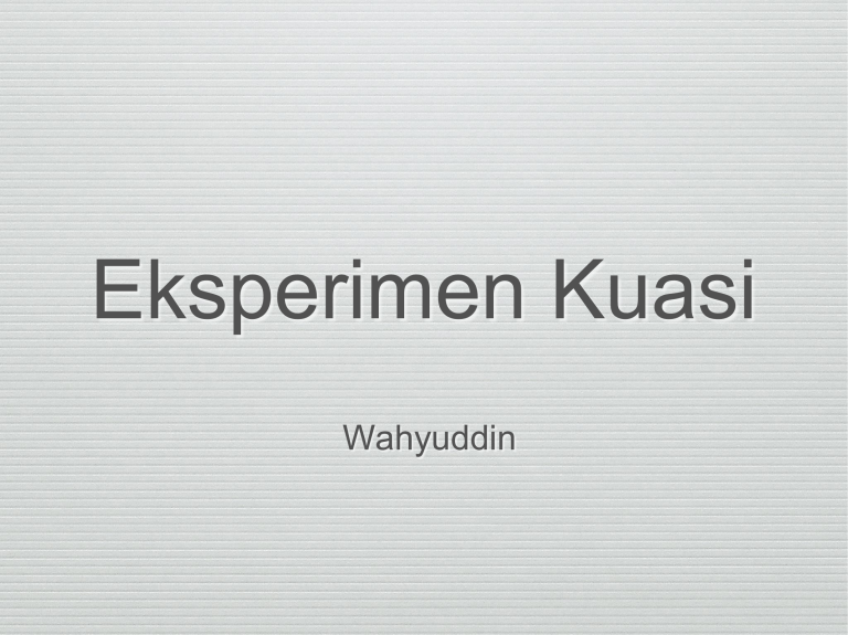 Eksperimen Kuasi Wahyuddin Pendahuluan 2 Pendahuluan • Randomized control/clinical trial (RCT) —> desain optimal tes hipotesis efek sebab akibat • Tidak selalu memungkinkan dilakukan dalam “situasi klinis” • Spesifikasi kriteria inklusi & ekslusi —> menurunkan aspek “generalisasi” & pembatasan subjek 3 Mengapa Eksperimen Kuasi? • Merepresentasikan kontribusi penting terkait penelitian klinis • Akomodasi keterbatasan setting klinis pada RCT EksperimenKuasi • Struktur= desain eksperimental, tanpa randomisasi • Alternatif RCT —> peneliti mengontrol karakteristik, protokol, dan “blinding” sebanyak mungkin • Bias > One Group Designs (One Group Pretest-Posttest Design) 6 One Group Designs (One Group Pretest-Posttest Design) • Pengukuran sebelum & sesudah treatmen pada 1 grup • Efek treatmen ditentukan melalui pengukuran perbedaan skor sebelum & sesudah treatmen • IV= waktu (2 level, pre & post test) • Treatmen bukan IV = semua subjek menerima intervensi 7 One Group Designs (One Group Pretest-Posttest Design) • Peneliti melihat peningkatan pada variabel outcome & menarik kesimpulan • Desain lemah karena tanpa grup pembanding —> terkait tingkat hubungan IV & DV yang bebas dari efek extraneous (internal validity) • Walaupun terlihat perubahan pada DV, dapat terjadi akibat selama “time frame” terjadi perubahan 8 One-Way Repeated Measures Design Over Time 9 One-Way Repeated Measures Design Over Time • Terkait efek treatmen dengan faktor fisiologi & psikologi selama waktu penelitian • Perpanjangan pretest-posttest design untuk melihat trend • Pengukuran berulang pada DV • IV=waktu 10 Time Series Design 11 Time Series Design • Berdasarkan aplikasi pengukuran berulang • Dapat dilakukan pada studi intervensi komunitas, perubahan kebijakan & analisis perilaku pada subjek tunggal 12 Multigroup Design (Nonequivalent Pretest-Posttest Control Group Design) 13 Multigroup Design (Nonequivalent Pretest-Posttest Control Group Design) • = pretest-posttest experimental design, kecuali subjek tidak dirandom • Dapat berupa 1 grup treatmen & 1 grup kontrol atau multi grup treatmen & grup kontrol • Skor pretest digunakan untuk asumsi ekuivalensi DV berdasarkan rata skor & pengukuran variabilitas 14 Nonequivalent Posttest-Only Control Group Design 15 Nonequivalent Posttest-Only Control Group Design • Aspek interpretasi < terkait hanya pengukuran posttest • Dapat/tanpa grup kontrol • Pertimbangkan variabel yang dapat mempengaruhi outcome 16 Nonequivalent Posttest-Only Control Group Design • Identifikasi & analisis confounding factors terkait DV (mis: pada rehab jantung pertimbangkan usia, pendidikan, pekerjaan dll) • Desain lemah: tidak ada evidence terkait ekuivalensi grup sebelum treatmen 17 Terima Kasih