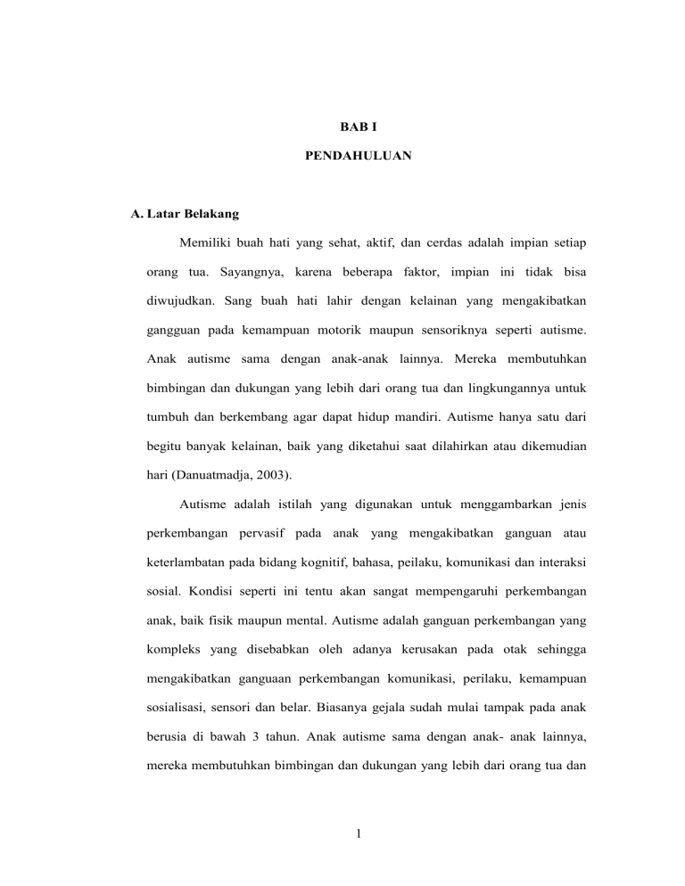 1 BAB I PENDAHULUAN A. Latar Belakang Memiliki buah hati yang sehat, aktif, dan cerdas adalah impian setiap orang tua. Sayangnya, karena beberapa faktor, impian ini tidak bisa diwujudkan. Sang buah hati lahir dengan kelainan yang mengakibatkan gangguan pada kemampuan motorik maupun sensoriknya seperti autisme. Anak autisme sama dengan anak-anak lainnya. Mereka membutuhkan bimbingan dan dukungan yang lebih dari orang tua dan lingkungannya untuk tumbuh dan berkembang agar dapat hidup mandiri. Autisme hanya satu dari begitu banyak kelainan, baik yang diketahui saat dilahirkan atau dikemudian hari (Danuatmadja, 2003). Autisme adalah istilah yang digunakan untuk menggambarkan jenis perkembangan pervasif pada anak yang mengakibatkan ganguan atau keterlambatan pada bidang kognitif, bahasa, peilaku, komunikasi dan interaksi sosial. Kondisi seperti ini tentu akan sangat mempengaruhi perkembangan anak, baik fisik maupun mental. Autisme adalah ganguan perkembangan yang kompleks yang disebabkan oleh adanya kerusakan pada otak sehingga mengakibatkan ganguaan perkembangan komunikasi, perilaku, kemampuan sosialisasi, sensori dan belar. Biasanya gejala sudah mulai tampak pada anak berusia di bawah 3 tahun. Anak autisme sama dengan anak- anak lainnya, mereka membutuhkan bimbingan dan dukungan yang lebih dari orang tua dan 1 2 lingkungan untuk tumbuh dan berkembang agar dapat hidup mandiri, (Ginanjar, 2002). Di Amerika Serikat disebutkan autisme terjadi pada 60.000 - 15.000 anak dibawah 15 tahun. Kepustakaan lain menyebutkan prevalensi autisme 10-20 kasus dalam 10.000 orang, bahkan ada yang mengatakan1 diantra 1000 anak. Di Pensylavia, Amerika Serikat jumlah anak autisme dalam lima tahun terkhir meningkat 500% menjadi 40 dari 10.000 kelahiran. Di California pada tahun 2002 disimpulkan terdapat 9 kasus anak autisme perharinya. Di Inggris pada awal tahun 2002 bahkan dilaporkan angka kejadian autisme meningkat sangat pesat, dicurigai 1 diantra 10 anak menyandang autisme. Beberapa penel;itian di negara berkembang memperkirakan 15-20 dari 1000 anak mengalami gangguan autisme, bahkan dikota kota tertentu angka tersebut mencapai 1/250 anak atau 60 kasus/10000 kelahiran (Judarwanto, 2006). Di Indonesia, dalam suatu wawancara di Koran Kompas; Dr. Melly Budhiman, seorang Psikiater Anak dan Ketua Yayasan Autisme Indonesia menyebutkan adanya peningkatan yang luar biasa. “ Bila seepuluh tahun yang lalu jumlah penyandang autisme diperkirakan 1/5.000 anak, sekarang menjadi 1/500 anak”. Tahun 2000 yang lalu, Dr. Ika Widyawati; staf bagian psikiatri Fakultas Kedokteran Universitas Indonesia memperkirakan terdapat kurang lebih 6.900 anak penyandang autisme di Indonesia (Kompas, 2008). Di Provinsi Bengkulu terdapat beberapa tempat yang membuka layanan terapi autis untuk anak autis diantranya klinik autis RSKJO Seoprapto dan Yayasan Mutiara Bunda. Setelah peneliti melakukan studi pendahuluan 3 didapatkan pada pada tahun 2013 terdapat 139 anak autis dan tahun 2015 terdapat 144 anak. Diantara anak autis yang didata di sub rekam medis, beberapa anak melakukan terapi di klinik autis RSKJO Soeprapto Bengkulu diantanya pada tahun 2014 terdapat 45 anak dengan usia 2-5 tahun ada 18 anak dan 6-10 tahun ada 21 anak. Pada tahun 2015 terdapat 52 anak dengan usia 2-5 tahun ada 41 anak dan 6-10 tahun ada 22 anak. Di Klinik Autis RSKJO Soeprapto Bengkulu dilakukan metode terapi ABA (Applied Behavior Analysis) dan menerima anak dengan udia antara 2-10 tahun (Sub Rekam Medis RSJKO Soeprapto, 2015). Salah satu terapi penting bagi anak autis badalah terapi perilaku ABA. Terapi ini sudah dikenal ini sudah dikenal luas karena hasilnya memuaskan. Terapai ABA sering digunakan untuk penanganan anak autistik. Terapi ini sangat representatif bagi penanggulanagan anak spesial dengan gejala autisme. Sebab, memilki prinsip yang terukur, terarah dan sistematis, juga variasi yang diajarkan luas, sehingga dapat meningkatkan keterampilan komunikasi, sosial dan motorik halus maupun kasar (Danuatmaja, 2003). Terapi ABA adalah metode tatalaksana perilaku yang berkembang sejak puluhan tahun yang lalu, ditemukan oleh seorang psikolog Amerika, Universitas California Los Angles, Amerika Serikat yang bernama Ivar O.Lovaas. Sekitar tahun 1970, ia melalui eksperimen dengan cara mengaplikasikan teori B.F. Skinner Operant Conditioning. Di dalam teori ini disebutkan suatu pola perilaku akan menjadi mantap jika perilaku itu di peroleh 4 si perilaku (penguat positif) karena mengakibatkan hilangnya hal-hal yang tidak diinginkan (penguat negatif). Melalui terapi perilaku ABA, anak autis akan mengalami kemajuan seperti anak normalnya karena metode ini memiliki kelebihan dibandingkan metode lainnya. Metode ini bersifat terstruktur, kurikulumnya yang jelas, dan keberhasilannya dapat dinilai secara objektif (Muslimah, 2009). Berdasarkan uraian di diatas penulis tertarik untuk melakukan penelitian tentang “ Pengaruh terapi ABA (Applied Behavior Analysis) terhadap kemampuan interaksi sosial pada anak autis yang diterapi di klinik autis RSJKO Soeprapto Bengkulu tahun 2016”. B. Rumusan Masalah Berdasarkan latar belakang diatas, maka penulis menetapan rumusan masalah yaitu apakah terdapat pengaruh terapi ABA (Applied Behavior Analysis) terhadap kemampuan interaksi sosial pada anak autis di klinik autis RSJKO Soeprapto Bengkulu tahun 2016 ?. C. Tujuan Penelitian 1. Tujuan Umum Untuk mempelajari pengaruh terapi ABA (Applied Behavior Analysis) terhadap kemampuan interaksi sosial pada anak autis di klinik autis RSJKO Soeprapto Bengkulu tahun 2016. 5 2. Tujuan Khusus a. Untuk mengetahui gambaran interaksi sosial pada anak autis sebelum terapi ABA (Applied Behavior Analysis) di klinik autis RSJKO Soeprapto Bengkulu tahun 2016 b. Untuk mengetahui gambaran interaksi sosial pada anak autis sesudah terapi ABA (Applied Behavior Analysis) di klinik autis RSJKO Soeprapto Bengkulu tahun 2016 c. Untuk mengetahui pengaruh terapi ABA (Applied Behavior Analysis) terhadap kemampuan interaksi s