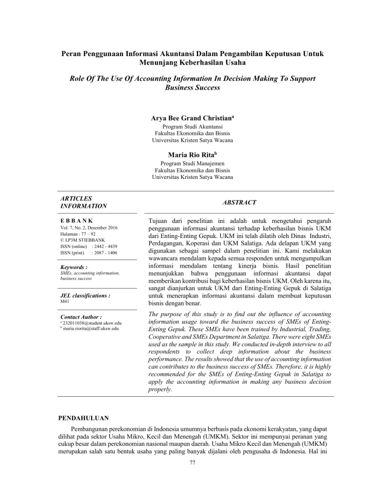 Peran Penggunaan Informasi Akuntansi Dalam Pengambilan Keputusan Untuk Menunjang Keberhasilan Usaha Role Of The Use Of Accounting Information In Decision Making To Support Business Success Arya Bee Grand Christiana Program Studi Akuntansi Fakultas Ekonomika dan Bisnis Universitas Kristen Satya Wacana Maria Rio Ritab Program Studi Manajemen Fakultas Ekonomika dan Bisnis Universitas Kristen Satya Wacana ARTICLES INFORMATION EBBANK Vol. 7, No. 2, Desember 2016 Halaman : 77 – 92 © LP3M STIEBBANK ISSN (online) : 2442 - 4439 ISSN (print) : 2087 - 1406 Keywords : SMEs, accounting information, business success JEL classifications : M41 Contact Author : a b [email protected] [email protected] ABSTRACT Tujuan dari penelitian ini adalah untuk mengetahui pengaruh penggunaan informasi akuntansi terhadap keberhasilan bisnis UKM dari Enting-Enting Gepuk. UKM ini telah dilatih oleh Dinas Industri, Perdagangan, Koperasi dan UKM Salatiga. Ada delapan UKM yang digunakan sebagai sampel dalam penelitian ini. Kami melakukan wawancara mendalam kepada semua responden untuk mengumpulkan informasi mendalam tentang kinerja bisnis. Hasil penelitian menunjukkan bahwa penggunaan informasi akuntansi dapat memberikan kontribusi bagi keberhasilan bisnis UKM. Oleh karena itu, sangat dianjurkan untuk UKM dari Enting-Enting Gepuk di Salatiga untuk menerapkan informasi akuntansi dalam membuat keputusan bisnis dengan benar. The purpose of this study is to find out the influence of accounting information usage toward the business success of SMEs of EntingEnting Gepuk. These SMEs have been trained by Industrial, Trading, Cooperative and SMEs Department in Salatiga. There were eight SMEs used as the sample in this study. We conducted in-depth interview to all respondents to collect deep information about the business performance. The results showed that the use of accounting information can contributes to the business success of SMEs. Therefore, it is highly recommended for the SMEs of Enting-Enting Gepuk in Salatiga to apply the accounting information in making any business decision properly. PENDAHULUAN Pembangunan perekonomian di Indonesia umumnya berbasis pada ekonomi kerakyatan, yang dapat dilihat pada sektor Usaha Mikro, Kecil dan Menengah (UMKM). Sektor ini mempunyai peranan yang cukup besar dalam perekonomian nasional maupun daerah. Usaha Mikro Kecil dan Menengah (UMKM) merupakan salah satu bentuk usaha yang paling banyak dijalani oleh pengusaha di Indonesia. Hal ini 77 Jurnal EBBANK ▪ Vol.7 ▪ No. 2 ▪ Hal. 77-92 ▪ Desember 2016 dikarenakan pengelolaannya yang tidak sulit dan juga mudah untuk dilakukan oleh pihak dari kalangan manapun serta tidak membutuhkan biaya yang besar. Tidak hanya itu keterpurukan perekonomian Indonesia akibat krisis moneter, menjadikan usaha kecil sebagai sektor andalan yang paling diminati oleh berbagai kalangan. Peminat UMKM tersebut berasal dari pihak donatur, pemerintah, maupun lembagalembaga swadaya masyarakat untuk menjadi salah satu pilar ekonomi Indonesia. Setiap kegiatan bisnis tentunya memerlukan pencatatan akuntansi agar setiap transaksi yang terjadi bisa di ketahui secara jelas. Peranan akuntansi adalah memberikan informasi sebagai dasar untuk pengambilan keputusan bisnis. Menurut Pinasti (2007: 322) informasi akuntansi dapat menjadi dasar yang andal bagi pengambilan keputusan-keputusan dalam pengelolaan usaha kecil, antara lain keputusan pengembangan pasar, penetapan harga, dan lain-lain. Pengambilan keputusan yang tepat dapat menentukan keberhasilan dari sebuah usaha. Oleh karena itu, informasi akuntansi memiliki peran yang penting bagi pelaku bisnis dalam mencapai keberhasilan usahanya, termasuk bagi Usaha Mikro, Kecil dan Menengah (UMKM). Mengingat bahwa UMKM menghadapi berbagai permasalahan seperti lemahnya jaringan usaha, keterbatasan kemampuan penetrasi pasar dan diversifikasi pasar, skala ekonomi terlalu kecil sehingga sukar menekan biaya, margin keuntungan sangat kecil, dan lebih jauh lagi UKM tidak memiliki keunggulan kompetitif (Rahmana, 2012:15). Problematika tersebut apabila diperkuat dengan pengambilan keputusan bisnis yang kurang tepat justru akan memperpuruk kondisi UMKM. Suhairi (2004) menyatakan bahwa praktek akuntansi, khususnya akuntansi keuangan pada UMKM di Indonesia masih rendah dan memiliki banyak kelemahan. Kelemahan itu, antara lain disebabkan rendahnya pendidikan, kurangnya pemahaman terhadap Standar Akuntansi Keuangan (SAK) dari manajer pemilik dan karena tidak adanya peraturan yang mewajibkan penyusunan laporan keuangan bagi UMKM. Obyek penelitian ini adalah UMKM yang bergerak di bidang usaha Enting Enting Gepuk di Kota Salatiga. Pemilihan usaha Enting Enting Gepuk di Kota Salatiga sebagai obyek penelitian dikarenakan Enting Enting Gepuk adalah salah satu makanan khas Kota Salatiga sehingga usaha ini menjadi usaha unggulan dan masih eksis di Kota Salatiga, selain itu juga karena adanya tantangan walaupun telah mengalami kenaikan harga bahan baku namun tetap bertahan. Data BPS Kota Salatiga menunjukkan bahwa sektor industri pengolahan pada tahun 2012 mengalami peningkatan sebesar 9,55% dengan kontribusi Produk Domestik Regional Bruto (PDRB) sebesar 16,86% ( http://salatigakota.bps.go.id) Penelitian ini bertujuan untuk mengetahui sejauh mana penggunaan informasi akuntansi oleh UMKM Enting Enting Gepuk di Kota Salatiga, serta membuktikan apakah peran penggunaan informasi akuntansi dalam pengambilan keputusan dapat menunjang keberhasilan usaha. Adapun manfaat yang dapat diperoleh dari penelitian ini antara lain memberikan gambaran tentang informasi akuntansi yang sering digunakan oleh industri pembuatan Enting Enting Gepuk di Kota Salatiga serta dapat menjadi salah satu referensi untuk penelitian serupa terkait dengan penerapan informasi akuntansi dalam menunjang kinerja UMKM. Penggunaan informasi akuntansi berupa catatan keuangan dapat digunakan bagi pemilik UMKM untuk pengambilan keputusan-keputusan dalam pengelolaan usaha untuk mencapai keberhasi