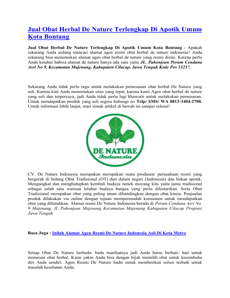 Jual Obat Herbal De Nature Terlengkap Di Apotik Umum Kota Bontang Jual Obat Herbal De Nature Terlengkap Di Apotik Umum Kota Bontang - Apakah sekarang Anda sedang mencari alamat agen resmi obat herbal de nature indonesia? Anda sekarang bisa menemukan alamat agen obat herbal de nature yang resmi disini. Karena perlu Anda ketahui bahwa alamat de nature hanya ada satu yaitu JL. Pahonjean Perum Cendana Asri No 9, Kecamatan Majenang, Kabupaten Cilacap, Jawa Tengah Kode Pos 53257. Sekarang Anda tidak perlu ragu untuk melakukan pemesanan obat herbal De Nature yang asli. Karena kini Anda menemukan situs yang tepat, karena kami Agen obat herbal de nature yang asli dan terpercaya, jadi Anda tidak perlu lagi khawatir untuk melakukan pemesanan. Untuk mendapatkan produk yang asli segera hubungi no Telp/ SMS/ WA 0813-3404-2700. Untuk informasi lebih lanjut, mari simak artikel di bawah ini sampai selesai! CV. De Nature Indonesia merupakan merupakan suatu produsen/ perusahaan resmi yang bergerak di bidang Obat Tradisional (OT) dari dalam negeri (Indonesia) dan bukan apotik. Mengangkat dan menghidupkan kembali budaya nenek moyang kita yaitu jamu tradisional sebagai salah satu warisan leluhur budaya bangsa yang perlu dilestarikan. Serta Obat Tradisional merupakan obat yang paling aman dibandingkan dengan obat kimia. Penjualan produk dilakukan via online dengan tujuan mempermudah konsumen untuk mendapatkan obat yang dibutuhkan. Alamat resmi De Nature Indonesia berada di Perum Cendana Asri No. 9 Majenang, Jl. Pahonjean Majenang Kecamatan Majenang Kabupaten Cilacap Propinsi Jawa Tengah. Baca Juga : Inilah Alamat Agen Resmi De Nature Indonesia Asli Di Kota Metro Setiap Obat De Nature berbeda- beda manfaatnya jadi Anda harus berhati- hati untuk memesan obat herbal. Kami yakin Anda bisa dengan bijak memilih obat untuk kesembuha diri Anda sendiri. Agen Resmi De Nature hadir untuk memberikan solusi terbaik untuk masalah kesehatan Anda. Sekarang Anda bisa mendapatkan obat de nature dengat sangat mudah, Anda cukup duduk nyaman dirumah dan pesan produk obat herbal de nature yang sedang Anda butuhkan saat ini. Hubungi kontak kami, lalu Anda bisa melakukan transaksi pembayaran terlebih dahulu, kemudian barang akan langsung kami kirimkan kealamat yang Anda berikan. Produk- produk De Nature Yang Paling Di Minati 1. PAKET PENGOBATAN WASIR/ AMBEIEN Pengobatan Wasir/ Ambeien yang terkenal yaitu obat Ambejoss dan Salwa, obat ini sudah sangat terkenal ampuh untuk menyembuhkan wasir/ ambeien. Sebelumnya Merk pertama obat ini adalah Ambeclear dan sekarang mejadi Ambejoss. Obat ini sangat banyak sekali peminatnya diseluruh Indonesia. Jenis Obat Wasir/ Ambeien De Nature : AMBEJOSS SALEP SALWA ZIIRZAK ZAITOP 2. PAKET PENGOBATAN SIPILIS, KENCING NANAH, GONORE (BAIK UNTUK PRIA DAN WANITA) Obat Sipilis, Kencing Nanah, Gonore (baik untuk pria dan wanita) karena sudah terbukti khasiatnya, obat jenis ini juga sangat diminati oleh para pasien kami diseluruh Indonesia. Jenis Obat Sipilis, Kencing Nanah, Gonore De Nature : GANG JIE GHO SIAH KAPSUL BD PIPECA SALEP PLUS 3. PAKET PENGOBATAN KUTIL KELAMIN (PADA WANITA DAN PRIA) Obat Kutil Kelamin (untuk wanita dan pria) jenis obat ini sangat terbukti keamannya. De Nature sebagai produsen obat kutil kelamin paling terpercaya, kami menyediakan paket hemat pengobatan kutil kelamin untuk wanita dan pria. Jenis Obat Kutil Kelamin De Nature : GANG JIE GHO SIAH KAPSUL BD PIPECA SALEP PLUS ANTIPILOMA MADU HERBAL OBAT HERBAL DE NATURE INDONESIA AMAN & ALAMI JL. Pahonjean Perum Cendana Asri No 9, Kecamatan Majenang, Kabupaten Cilacap,Jawa Tengah Kode Pos 53257 Whatsapp/ Telp/ Sms : 0813-3404-2700 Agen Resmi De Nature Indonesia menyediakan berbagai macam obat herbal de nature sebagai solusi untuk masalah kesehatan Anda. Anda sekarang tidak perlu lagi bingungbingung untuk mencari obat herbal yang ampuh untuk menyembuhkan penyakit yang sedang Anda derita, setiap penyakit pasti ada obatnya tetapi tidak semua penyakit obatnya sama, jadi Anda harus bijak dalam memilih obat herbal. Obat herbal de nature adalah solusi yang tepat untuk setiap penyakit Anda, Anda tidak perlu ragu untuk mengonsumsi obat herbal de nature, karena de nature dijamin aman dan ampuh untuk segala penyakit Anda. Berikut Daftar Produk Obat Herbal De Nature Indonesia : Obat eksim De Nature Indonesia Obat kencing nanah De Nature Indonesia Obat herpes De Nature Indonesia Obat kanker De Nature Indonesia Obat tumor De Nature Indonesia Obat kista De Nature Indonesia Obat keputihan De Nature Indonesia Obat perawatan miss v De Nature Indonesia Obat perapat miss v de nature Obat gatal De Nature Indonesia Obat fistula ani De Nature Indonesia Obat stroke De Nature Indonesia Obat paru paru De Nature Indonesia Obat batuk berdarah De Nature Indonesia Obat TBC De Nature Indonesia Obat diabetes De Nature Indonesia Obat asam urat De Nature Indonesia Obat kolesterol De Nature Indonesia Obat maag kronis De Nature Indonesia Obat pembesar penis De Nature Indonesia Obat kuat De Nature Indonesia Obat batu ginjal De Nature Indonesia Obat hepatitis De Nature Indonesia Obat penyubur kandungan De Nature Indonesia Obat pelangsing De Nature Indonesia Obat penggemuk badan De Nature Indonesia Obat pembersih darah De Nature Indonesia Obat penyakit kulit De Nature Indonesia Anda bisa sembuh lebih cepat dengan mengonsumsi obat herbal de nature dibandingkan dengan mengonsumsi obat herbal yang ada dipasaran. Karena obat herbal de nature terbuat dari bahan- bahan alami yang sudah terbukti khasiatnya dan diproduksi langsung oleh para ahli yang handal, dan produk kami diterima langsung oleh para konsumen secara langsung. Sekarang Anda tidak perlu khawatir untuk melakukan pemesanan produk obat herbal de nature kami. Anda cukup duduk nyaman kemudian lakukan pesanan obat herbal de nature yang Anda butuhkan. Obat herbal De Nature tidak dipasarkan di apotik ataupun toko- toko obat manapun. Untuk memudahkan Anda dalam membeli obat herbal de nature kami. Oleh sebab itu semua obat De N