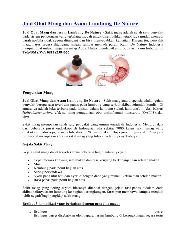 Jual Obat Maag dan Asam Lambung De Nature Jual Obat Maag dan Asam Lambung De Nature - Sakit maag adalah salah satu penyakit pada sistem pencernaan yang terbilang mudah untuk disembuhkan tetapi juga mudah menjadi parah apabila tidak segera ditangani dan bisa menyebabkan kematian. Karena itu, penyakit maag harus segera ditangani, jangan sampai menjadi parah. Kami De Nature Indonesia menjual obat untuk mengatasi maag Anda. Untuk mendapatkan produk asli kami hubungi no Telp/SMS/WA 081282584656. Pengertian Maag Jual Obat Maag dan Asam Lambung De Nature - Sakit maag atau dispepsia adalah gejala penyakit berupa rasa nyeri dan panas pada lambung yang terjadi akibat sejumlah kondisi. Di antaranya adalah luka terbuka pada lapisan dalam lambung (tukak lambung), infeksi bakteri Helicobacter pylori, efek samping penggunaan obat antiinflamasi nonsteroid (OAINS), dan stres. Sakit maag merupakan salah satu penyakit yang umum terjadi di Indonesia. Menurut data dari beberapa pusat endoskopi di Indonesia, ada sekitar 7000 kasus sakit maag yang dilakukan endoskopi, dan lebih dari 85% merupakan dispepsia fungsional. Dispepsia fungsional merupakan kondisi sakit maag yang tidak diketahui penyebabnya. Gejala Sakit Maag Gejala sakit maag dapat terjadi karena beberapa hal, diantaranya yaitu: Cepat merasa kenyang saat makan dan rasa kenyang berkepanjangan setelah makan Mual Kembung pada perut bagian atas Sering bersendawa Nyeri pada ulut hati dan nyeri di tengah dada yang muncul ketika atau setelah makan Rasa panas pada perut bagian atas Sakit maag yang sering terjadi biasanya ditandai dengan gejala rasa panas didalam dada akibat naiknya asam lambung ke bagian kerongkongan. Stres pun membawa dampak menjadi lebih negatif bagi pengidap sakit maag. Berikut 3 komplikasi yang berkaitan dengan penyakit maag: 1. Esofagus barret Esofagus barret disebabkan oleh paparan asam lambung di kerongkongan secara terus menerus, yang menyebabkan perubahan pada sel-sel di lapisan bagian bawah kerongkongan menjadi sel kanker. 2. Stenosis pilorus Komplikasi ini terjadi karena paparan asam lambung pada area pilorus dalam jangka panjang, yang menimbulkan jaringan parut dan mempersempit pilorus. Sehingga mengakibatkan makanan tidak tercerna dengan baik. 3. Penyempitan esofagus Penyempitan esofagus terjadi saat seseorang sering mengalami sakit maag akibat refluks asam. Gejala yang muncul biasanya berupa sulit menelan dan nyeri pada bagian dada. Harga Rp. 295.000 Pemesanan obat hubungi tlp/sms/whatsapp : 081282584656 Penyebab Sakit Maag Jual Obat Maag dan Asam Lambung De Nature - Sebelum kamu mengetahui penyabab sakit maag, kamu harus tahu tentang cara kerja lambung. Pertama-tama, makanan masuk ke lambung lalu dicerna secara kimiawi dengan bantuan dari enzim pepsin dan renin dicampur dengan asam lambung (HCl) . Apabila terjadi gangguan, maka kerusakan pada mukosa akan menimbulkan rasa sakit atau nyeri. Apabila gangguan ini terus menerus terjadi, maka luka pada lapisan mukosa lambung dapat membuat terjadinya maag. Rasa nyeri karena maag akut disebabkan oleh rangsangan yang dibuat oleh asam lambung pada lapisan mukosa lambung, sehingga ujung-ujung syaraf menjadi lebih peka oleh rasa nyeri. Banyak faktor yang dapat menyebabkan sakit maag, seperti: Adanya masalah psikologi. Infeksi bakteri helicobacter pylori. Efek samping menggunakan obat anti inflamasi nonsteroid. Terlalu banyak makan. Kelebihan berat badan. Makan terlalu cepat. Mengonsumsi makanan berminyak, berlemak dan pedas. Terlalu banyak mengonsumsi minuman berkafein dan soda. Mengonsumsi cokelat berlebihan. Sakit maag juga terjadi akibat komplikasi terhadap penyakit, misalnya penyakit batu empedu, radang pancreas, penyumbatan usus dan kanker lambung. Cara mencegah maag kronis Tidak jelas bagaimana H. pylori penyebab infeksi lambung menyebar, tapi ada beberapa bukti bahwa hal itu bisa ditularkan dari orang ke orang atau melalui makanan dan air yang terkontaminasi. Anda dapat mengambil langkah-langkah berikut untuk melindungi diri dari infeksi saluran cerna penyebab maag kronis, seperti : Sering mencuci tangan dengan sabun dan air mengalir. Makan makanan yang telah dimasak dengan matang. Makan teratur, jangan sering menunda-nunda atau telat makan. Tanaman Ampuh Untuk Mengobati Penyakit Maag Kronis Obat Herbal MAAG De Nature Indonesia Jual Obat Maag dan Asam Lambung De Nature - Salah satu alternatif untuk mengobati Penyakit Maag adalah dengan memanfaatkan bahan alami yang bermanfaat membantu pengobatan penyakit anda, kami De Nature Indonesia menyediakan produk obat herbal untuk membantu penderita Penyakit Maag. Zaitop & Moringa dari kami De Nature. Salah satu produk Obat Herbal Alami, diproduksi lebih dari 10 tahun yang sudah dipercaya sampai sekarang. Terbuat dari bahan herbal, sehingga aman dikonsumsi tanpa menimbulkan efek Samping. Segera obati Penyakit Maag anda, dengan izin Alloh SWT mudah-mudahan dapat terobati. Amin. Untuk pemesanan obat herbal Penyakit Maag bisa melakukan kontak dengan kami. Harga Rp. 295.000 Pemesanan obat hubungi tlp/sms/whatsapp : 081282584656 PAKET OBAT MAAG RP 295.000,Paket berisi : :: 1 botol kapsul Zaitop @50 kapsul :: 1 botol kapsul Moringa @50 kapsul Sekedar informasi untuk kenyamanan Konsumen, bahwa Produk dari perusahaan kami ini sudah memiliki: Ijin Resmi Perusahaan dari Kementerian Kesehatan Ijin BPOM, yang artinya sudah lulus uji stabilitas Produk Sertifikat Halal MUI, sehingga halal bisa dipertanggungjawabkan Apoteker yang sudah berpengalaman Sudah melewati Proses Sortir Bahan Baku, Guna Menjaga Mutu Produk Proses Produksi Sesuai Alur CPOTB (Cara Pembuatan Obat Tradisional Yang Baik Dan Benar) Cara Pemesanan Pembayaran terlebih dulu via transfer Bank, setelah transfer SMS-kan konfirmasinya untuk proses pengiriman. Format Pemesanan: Nama, Alamat Lengkap beserta kode Pos, Nama Bank / Rekening anda, Nominal transfer, Nama Obat yg dipesan, No.Hp Anda Agar pesanan Anda bisa segera diproses, segera konfirmasikan pembayaran Anda via Telp/SMS/WA ke 08128258