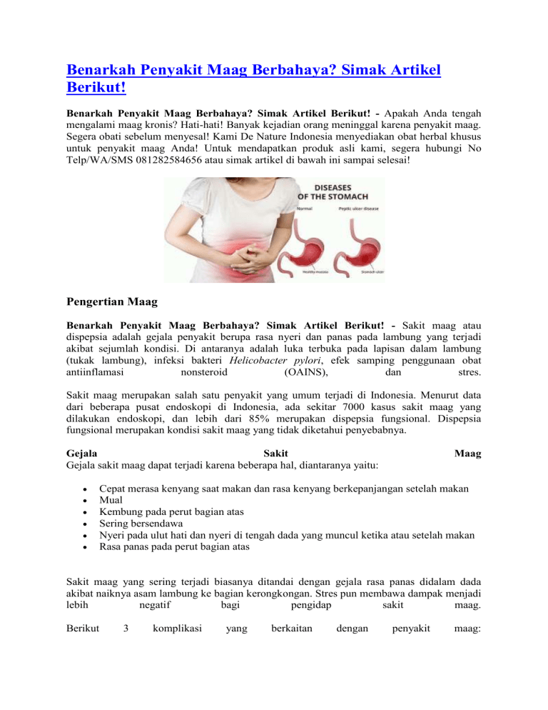 Benarkah Penyakit Maag Berbahaya? Simak Artikel Berikut! Benarkah Penyakit Maag Berbahaya? Simak Artikel Berikut! - Apakah Anda tengah mengalami maag kronis? Hati-hati! Banyak kejadian orang meninggal karena penyakit maag. Segera obati sebelum menyesal! Kami De Nature Indonesia menyediakan obat herbal khusus untuk penyakit maag Anda! Untuk mendapatkan produk asli kami, segera hubungi No Telp/WA/SMS 081282584656 atau simak artikel di bawah ini sampai selesai! Pengertian Maag Benarkah Penyakit Maag Berbahaya? Simak Artikel Berikut! - Sakit maag atau dispepsia adalah gejala penyakit berupa rasa nyeri dan panas pada lambung yang terjadi akibat sejumlah kondisi. Di antaranya adalah luka terbuka pada lapisan dalam lambung (tukak lambung), infeksi bakteri Helicobacter pylori, efek samping penggunaan obat antiinflamasi nonsteroid (OAINS), dan stres. Sakit maag merupakan salah satu penyakit yang umum terjadi di Indonesia. Menurut data dari beberapa pusat endoskopi di Indonesia, ada sekitar 7000 kasus sakit maag yang dilakukan endoskopi, dan lebih dari 85% merupakan dispepsia fungsional. Dispepsia fungsional merupakan kondisi sakit maag yang tidak diketahui penyebabnya. Gejala Sakit Gejala sakit maag dapat terjadi karena beberapa hal, diantaranya yaitu: Maag Cepat merasa kenyang saat makan dan rasa kenyang berkepanjangan setelah makan Mual Kembung pada perut bagian atas Sering bersendawa Nyeri pada ulut hati dan nyeri di tengah dada yang muncul ketika atau setelah makan Rasa panas pada perut bagian atas Sakit maag yang sering terjadi biasanya ditandai dengan gejala rasa panas didalam dada akibat naiknya asam lambung ke bagian kerongkongan. Stres pun membawa dampak menjadi lebih negatif bagi pengidap sakit maag. Berikut 3 komplikasi yang berkaitan dengan penyakit maag: :: Esofagus barret Esofagus barret disebabkan oleh paparan asam lambung di kerongkongan secara terus menerus, yang menyebabkan perubahan pada sel-sel di lapisan bagian bawah kerongkongan menjadi sel kanker. :: Stenosis pilorus Komplikasi ini terjadi karena paparan asam lambung pada area pilorus dalam jangka panjang, yang menimbulkan jaringan parut dan mempersempit pilorus. Sehingga mengakibatkan makanan tidak tercerna dengan baik. :: Penyempitan esofagus Penyempitan esofagus terjadi saat seseorang sering mengalami sakit maag akibat refluks asam. Gejala yang muncul biasanya berupa sulit menelan dan nyeri pada bagian dada. Harga Rp. 295.000 Pemesanan obat hubungi tlp/sms/whatsapp : 081282584656 Penyebab Sakit Maag Benarkah Penyakit Maag Berbahaya? Simak Artikel Berikut! - Sebelum kamu mengetahui penyabab sakit maag, kamu harus tahu tentang cara kerja lambung. Pertamatama, makanan masuk ke lambung lalu dicerna secara kimiawi dengan bantuan dari enzim pepsin dan renin dicampur dengan asam lambung (HCl) Apabila terjadi gangguan, maka kerusakan pada mukosa akan menimbulkan rasa sakit atau nyeri. Apabila gangguan ini terus menerus terjadi, maka luka pada lapisan mukosa lambung dapat membuat terjadinya maag. Rasa nyeri karena maag akut disebabkan oleh rangsangan yang dibuat oleh asam lambung pada lapisan mukosa lambung, sehingga ujung-ujung syaraf menjadi lebih peka oleh rasa nyeri Banyak faktor yang dapat menyebabkan sakit maag, seperti: Adanya masalah psikologi. Infeksi bakteri helicobacter pylori. Efek samping menggunakan obat anti inflamasi nonsteroid. Terlalu banyak makan. Kelebihan berat badan. Makan terlalu cepat. Mengonsumsi makanan berminyak, berlemak dan pedas. Terlalu banyak mengonsumsi minuman berkafein dan soda. Mengonsumsi cokelat berlebihan. Sakit maag juga terjadi akibat komplikasi terhadap penyakit, misalnya penyakit batu empedu, radang pancreas, penyumbatan usus dan kanker lambung. Cara mencegah maag kronis Tidak jelas bagaimana H. pylori penyebab infeksi lambung menyebar, tapi ada beberapa bukti bahwa hal itu bisa ditularkan dari orang ke orang atau melalui makanan dan air yang terkontaminasi. Anda dapat mengambil langkah-langkah berikut untuk melindungi diri dari infeksi saluran cerna penyebab maag kronis, seperti : Sering mencuci tangan dengan sabun dan air mengalir. Makan makanan yang telah dimasak dengan matang. Makan teratur, jangan sering menunda-nunda atau telat makan. Tanaman Ampuh Untuk Mengobati Penyakit Maag Kronis Obat Herbal MAAG De Nature Indonesia Benarkah Penyakit Maag Berbahaya? Simak Artikel Berikut! - Salah satu alternatif untuk mengobati Penyakit Maag adalah dengan memanfaatkan bahan alami yang bermanfaat membantu pengobatan penyakit anda, kami De Nature Indonesia menyediakan produk obat herbal untuk membantu penderita Penyakit Maag. Zaitop & Moringa dari kami De Nature. Salah satu produk Obat Herbal Alami, diproduksi lebih dari 10 tahun yang sudah dipercaya sampai sekarang. Terbuat dari bahan herbal, sehingga aman dikonsumsi tanpa menimbulkan efek Samping. Segera obati Penyakit Maag anda, dengan izin Alloh SWT mudah-mudahan dapat terobati. Amin. Untuk pemesanan obat herbal Penyakit Maag bisa melakukan kontak dengan kami. Harga Rp. 295.000 Pemesanan obat hubungi tlp/sms/whatsapp : 081282584656 PAKET OBAT MAAG RP 295.000,Paket berisi : :: 1 botol kapsul Zaitop @50 kapsul :: 1 botol kapsul Moringa @50 kapsul Sekedar informasi untuk kenyamanan Konsumen, bahwa Produk dari perusahaan kami ini sudah memiliki: Ijin Resmi Perusahaan dari Kementerian Kesehatan Ijin BPOM, yang artinya sudah lulus uji stabilitas Produk Sertifikat Halal MUI, sehingga halal bisa dipertanggungjawabkan Apoteker yang sudah berpengalaman Sudah melewati Proses Sortir Bahan Baku, Guna Menjaga Mutu Produk Proses Produksi Sesuai Alur CPOTB (Cara Pembuatan Obat Tradisional Yang Baik Dan Benar) Cara Pemesanan Pembayaran terlebih dulu via transfer Bank, setelah transfer SMS-kan konfirmasinya untuk proses pengiriman. Format Pemesanan: Nama, Alamat Lengkap beserta kode Pos, Nama Bank / Rekening anda, Nominal transfer, Nama Obat yg dipesan, No.Hp Anda Agar pesanan Anda bisa segera diproses, segera konfirmasikan pembayaran Anda via Telp/SMS/WA ke 