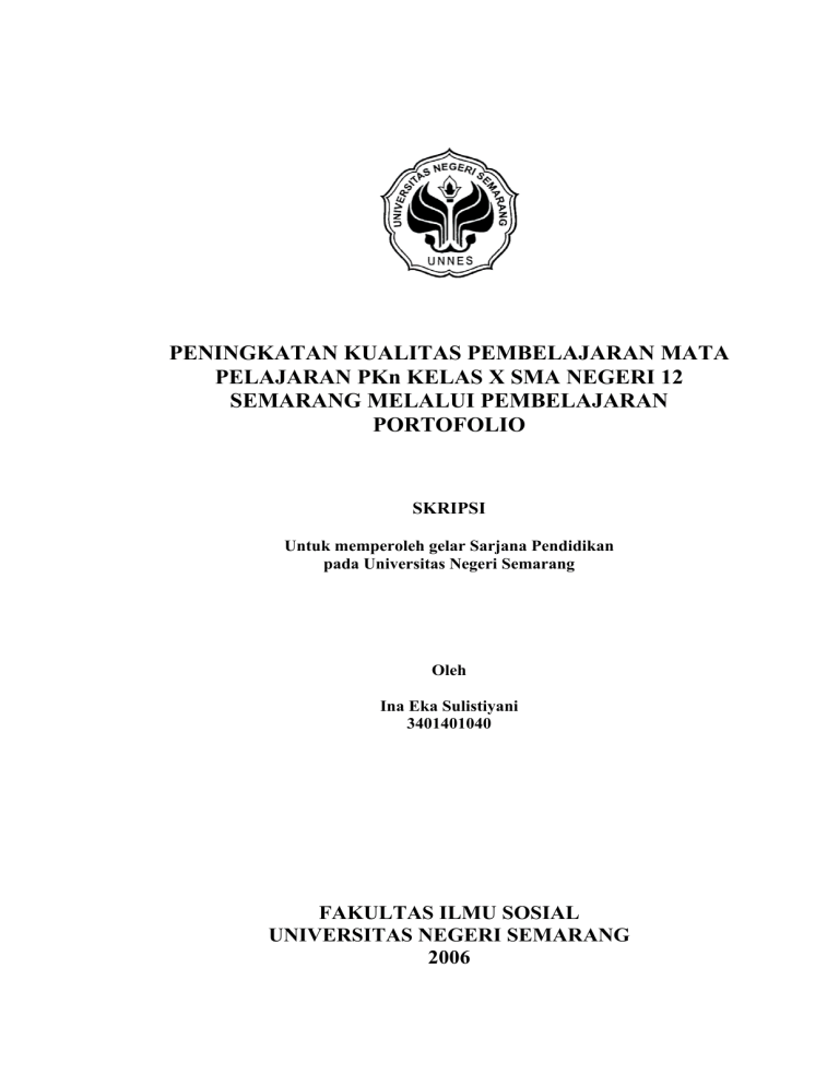 PENINGKATAN KUALITAS PEMBELAJARAN MATA PELAJARAN PKn KELAS X SMA NEGERI 12 SEMARANG MELALUI PEMBELAJARAN PORTOFOLIO SKRIPSI Untuk memperoleh gelar Sarjana Pendidikan pada Universitas Negeri Semarang Oleh Ina Eka Sulistiyani 3401401040 FAKULTAS ILMU SOSIAL UNIVERSITAS NEGERI SEMARANG 2006 SARI Sulistiyani, Ina Eka. 2006. Peningkatan Kualitas Pembelajaran Mata Pelajaran PKn Kelas X SMA Negeri 12 Semarang Melalui Pembelajaran Portofolio. Sarjana Pendidikan Kewarganegaraan. Pembimbing I: Drs. Eko Handoyo M.Si, Pembimbing II: Drs. Setiajid M.Si, dan 63 Halaman. Kata Kunci: Kualitas belajar, Portofolio Undang-Undang Nomor 20 Tahun 2003 tentang Sistem Pendidikan Nasional ini telah merumuskan secara tegas mengenai dasar, fungsi, dan tujuan Pendidikan Nasional. Pasal 2 Undang-Undang Nomor 20 Tahun 2003 tentang Sistem Pendidikan Nasional yang memuat dasar pendidikan nasional, yaitu berdasar Pancasila dan Undang-Undang Dasar 1945, sedang fungsinya yaitu mengembangkan kemampuan dan membentuk watak serta peradaban bangsa yang bermartabat dalam rangka mencerdaskan kehidupan bangsa. Penelitian ini bertujuan untuk meningkatkan proses pembelajaran dan hasil pembelajaran anak sehingga prestasi belajar anak dapat meningkat melalui pendekatan portofolio. Metode penelitian ini ditempuh dengan empat siklus, setiap siklus terdiri dari empat tahap yaitu, perncanaan, pelaksanaan, pengamatan, dan refleksi. Lokasi dan subyek penelitian adalah siswa kelas X SMA Negeri 12 Semarang. Fokus yang diteliti dalam penelitian ini adalah siswa, guru, dan proses pembelajaran. Data dan sumber data untuk dianalisis dalam penelitian ini yaitu (1) Lembar pengamatan proses pembelajaran dan keaktifan siswa. (2) Tugas siswa. (3) Soal tertulis. (4) Angket awal dan akhir tentang proses pembelajaran melalui pembelajaran portofolio. Hasil penelitian menunjukkan bahwa peningkatan proses pembelajaran dari siklus I sampai dengan siklus III dapat dilihat dari hasil angket yang diberikan sebelum dan setelah tindakan. Skor pengamatan yang diberikan oleh guru observer pada siklus I: 25,58; siklus II: 81,39; siklus III: 97,67. Skor pengamatan keaktifan siswa juga meningkat dari siklus I sampai siklus III. Hasil pengamatan salah seorang siswa sebagai kolaborator dan wawancara secara tertulis kepada guru kolaborator dan siswa juga menunjukkan adanya proses pembelajaran yang berlangsung kondusif. Peningkatan kedisiplinan siswa selama tindakan kelas dari siklus I sampai dengan siklus III dapat dilihat dari hasil angket, sebelum dan sesudah tindakan menunjukkan adanya peningkatan. Kedisiplinan siswa dengan tugas portofolio yang dikumpulkan sangat kreatif dan semua mengumpulkan. Ketuntasan belajar siswa pada siklus I, II, dan III mengalami peningkatan yang sangat signifikan sehingga sangat berpengaruh pada nilai akhir yang didapat oleh siswa. Saran yang dapat diajukan adalah sebagai berikut: (1) Guru hendaknya membuat model pembelajaran di kelas dengan kreatif melalui pembelajaran portofolio ini, sehingga dapat dijadikan modifikasi dalam pembelajaran. (2) Guru dapat memanfaatkan pendekatan portofolio untuk diterapkan pada materi yang lain, karena pembelajaran yang bertumpu pada masalah, sehingga lebih menarik dan menantang. ii PERSETUJUAN PEMBIMBING Skripsi ini telah disetujui oleh Pembimbing untuk diajukan ke sidang panitia ujian skripsi. Semarang, 2006 Pembimbing I Pembimbing II Drs. Eko Handoyo M.Si NIP. 131764048 Drs. Setiajid M.Si NIP. 131813656 Mengetahui, Ketua Jurusan Hukum dan Kewarganegaraan Drs. Eko Handoyo M.Si NIP. 131764048 iii PERNYATAAN Saya menyatakan bahwa yang tertulis di dalam skripsi ini benar-benar hasil karya saya sendiri, bukan jiplakan dari karya tulis orang lain. Pendapat atau temuan yang terdapat dalam skripsi ini dikutip atau dirujuk berdasarkan kode etik ilmiah. Semarang, Maret 2006 Ina Eka Sulistiyani iv HALAMAN PENGESAHAN Skripsi ini telah dipertahankan dalam sidang Panitia Ujian Skripsi Jurusan Pendidikan Kewarganegaraan Fakultas Ilmu Sosial, Universitas Negeri Semarang pada : Hari : Tanggal : Penguji Skripsi Drs. Slamet Sumarto,M.Pd NIP. 131570070 Anggota I Anggota II Drs. Eko Handoyo,M.Si NIP. 131764048 Drs. Setiajid,M.Si NIP. 131813656 Mengetahui, Dekan Fakultas Ilmu Sosial Drs. Sunardi,M.M NIP. 130367998 v MOTTO DAN PERSEMBAHAN MOTTO : 1. “Dan setiap kesungguhan hati adalah tujuan untuk mencapai cita yang diinginkan“ 2. “Manusia paling utama yaitu orang mukmin yang berilmu, yang jika dibutuhkan bisa memberikan manfaat dan jika tidak dibutuhkan bisa mencukupi dirinya “ (Al-Ikhlas :15) Skripsi ini penyusun peruntukkan kepada : 1. Bapak dan Ibu tersayang yang senantiasa mengiringi langkah ini dengan do’a, senyum, ridho, serta cucuran keringat dan kasih sayang. 2. Ma’e yang selalu memberikan semangat yang tak akan pernah padam. 3. Adik-adikku, dik Elfi, dik Lilis, dik Alvin imut yang selalu senantiasa melimpahkan kasihnya, motivasinya dan selalu memberikan inspirasi, kalian adalah anugerah terindah dalam hidupku. 4. Teruntuk saudara-saudaraku di jalan Alloh, Sungguh indah hidup dalam barisan dakwah. vi KATA PENGANTAR Ungkapan rasa syukurku padaMu ya Alloh, Tuhan semesta alam, atas segala limpahan kasih sayang, nikmat Islam dan Iman di jalanMu sehingga tugas belajar selama 5 tahun ini dapat terselesaikan dengan banyak kemudahan dan pertolongan. Penulis menyadari bahwa dalam pembuatan skripsi ini tidak lepas dari peran serta berbagai pihak yang mendukung dan membantu sehingga skripsi ini dapat terselesaikan. Penulis hanya dapat menyampaikan ucapan terimakasih dan penghargaan yang sebesarbesarnya atas bantuan dan perannya pada penyelesaian skripsi ini, yaitu kepada: 1. Dr. A. T. Soegito, SH.,MM., Rektor Unnes, 2. Dekan FIS Drs. Sunardi, M.M. 3. Drs. Eko Handoyo, M.Si., Ketua Jurusan HKn Unnes, 4. Drs. Eko Handoyo, M.Si., dosen pembimbing I yang telah memberikan ilmu, bimbingan, perhatian, masukan dan motivasi dalam penyusunan skripsi ini, 5. Drs. Setiajid, M.Si., dosen pembimbing II yang telah memberikan ilmu,
