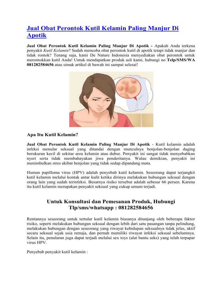 Jual Obat Perontok Kutil Kelamin Paling Manjur Di Apotik Jual Obat Perontok Kutil Kelamin Paling Manjur Di Apotik - Apakah Anda terkena penyakit Kutil Kelamin? Sudah mencoba obat perontok kutil di apotik tetapi tidak manjur dan tidak rontok? Tenang saja, kami De Nature Indonesia menyediakan obat perontok untuk merontokkan kutil Anda! Untuk mendapatkan produk asli kami, hubungi no Telp/SMS/WA 081282584656 atau simak artikel di bawah ini sampai selesai! Apa Itu Kutil Kelamin? Jual Obat Perontok Kutil Kelamin Paling Manjur Di Apotik - Kutil kelamin adalah infeksi menular seksual yang ditandai dengan munculnya benjolan-benjolan daging berukuran kecil di sekitar area kelamin atau dubur. Penyakit ini sangat tidak menyebabkan nyeri serta tidak membahayakan jiwa penderitanya. Walau demikian, penyakit ini menimbulkan stres akibat benjolan yang tidak sedap dipandang mata. Human papilloma virus (HPV) adalah penyebab kutil kelamin. Seseorang dapat terjangkit kutil kelamin melalui kontak antar kulit ketika dirinya melakukan hubungan seksual dengan orang lain yang sudah terinfeksi. Besarnya risiko tersebut adalah sebesar 66 persen. Karena itu kutil kelamin merupakan penyakit seksual yang cukup umum terjadi. Untuk Konsultasi dan Pemesanan Produk, Hubungi Tlp/sms/whatsapp : 081282584656 Rentannya seseorang untuk tertular kutil kelamin biasanya ditunjang oleh beberapa faktor risiko, seperti melakukan hubungan seksual dengan lebih dari satu pasangan tanpa pelindung, melakukan hubungan dengan seseorang yang riwayat kehidupan seksualnya tidak jelas, aktif secara seksual sejak usia remaja, dan pernah memiliki riwayat infeksi seksual sebelumnya. Selain itu, penularan juga dapat terjadi melalui sex toys (alat bantu seks) yang telah terpapar virus HPV. Penyebab penyakit kutil kelamin : Berhubungan seks tanpa kondom. Berhubungan seks tanpa kondom dengan banyak orang yang berbeda. Berhubungan seks dengan seseorang yang tidak diketahui riwayat seksual. Stres dan menderita infeksi virus lainnya seperti HIV atau herpes pada waktu yang sama. Tanda-tanda Ciri Penyakit Kutil Kelamin : Jual Obat Perontok Kutil Kelamin Paling Manjur Di Apotik - Berikut Ciri ciri kutil kelamin pada wanita (Kondiloma Akuminata) atau jengger ayam ini bisa jadi penyakit paling mematikan dunia jika tidak segera di obati. Tidak hanya wanita sajayang patut mewaspadai tentang penyakit kutil kelamin ini, pria pun harus waspada pada munculnya kutil di kelamin tersebut. Berikut ini tanda-tanda atau ciri -ciri kutil kelamin beserta munculnya penyakit kutil kelamin atau jengger ayam yang patut di waspadai : Munculnya Benjolan di kelamin secara bergerombol Benjolan berisi daging Bentuk benjolan kecil Bengkak Kemerahan Menyerupai Jengger Ayam Menyerupai Kembang Kol Terasa Gatal Tidak Nyaman Pendarahan Nyeri Berbau Perih Kutil bisa berdarah Pada wanita muncul di bibir vagina, serviks, vagina Warna Kutil di kelamin hitam agak kemerahan, abu-abu agak kemerahan, cokelat agak kemerahan dan juga merah. Daerah penyebaran kutil kelamin pada Pria: Batang penis. Ujung kepala penis. Selangkangan. Paha bagian atas. Disekitar anus atau bisa didalamnya. Di dalam Uretra. Daerah penyebaran kutil kelamin pada Wanita: Anus. Vulva. Bagian antara anus dan kelamin. Leher Rahim. Paha bagian atas. Bagaimana cara mencegah Penyakit Kutil Kelamin? Untuk mengurangi risiko infeksi kutil kelamin bisa dilakukan dengan berbagai cara, antara lain : Gunakan kondom dengan benar setiap kali Anda berhubungan seks. Setia terhadap pasangan, jangan berganti-ganti partner seks. Membatasi kontak seksual hanya dengan satu pasangan yang benar-benar steril. Pertanyaan yang sering terpikirkan di benak Anda : Jika Saya terlanjur kena kutil kelamin bagaimana cara mengobatinya? Bagaimana cara mengobati kutil kelamin dengan cepat dan tuntas? Bagaimana berobat yang mudah tanpa perlu malu untuk ke dokter? Jawabannya: semua bisa, asal Anda memilih produk yang tepat, yaitu Gang Jie Gho Siah Pipeca dan Kapsul BD De Nature. Pengobatan Penyakit Kutil Kelamin Jual Obat Perontok Kutil Kelamin Paling Manjur Di Apotik- Pengobatan Kutil Kelamin secara tradisional yaitu dengan menggunakan Obat Kutil Kelamin dari De Nature. Produk yang terbuat dari bahan herbal alami diramu dengan resep tradisional dan diolah secara teknologi modern, sehingga aman di konsumsi. Jadi anda juga tak perlu khawatir karena Obat Herbal De Nature yang kami tawarkan ini, Alhamdulillah, merupakan obat yang telah banyak menyembuhkan penderitanya baik dari dalam maupun luar negeri. Sudah banyak pasien kami yang merasakan kesembuhannya dengan mengonsumsi obat herbal dari De Nature. Rp 950.000,Pemesanan obat hubungi tlp/sms/whatsapp : 081282584656 Sekedar informasi untuk kenyamanan Konsumen, bahwa Produk dari perusahaan kami ini sudah memiliki: Ijin Resmi Perusahaan dari Kementerian Kesehatan Ijin BPOM, yang artinya sudah lulus uji stabilitas Produk Sertifikat Halal MUI, sehingga halal bisa dipertanggungjawabkan Apoteker yang sudah berpengalaman Sudah melewati Proses Sortir Bahan Baku, Guna Menjaga Mutu Produk Proses Produksi Sesuai Alur CPOTB (Cara Pembuatan Obat Tradisional Yang Baik Dan Benar). Cara Pembelian: Pembayaran terlebih dulu via transfer Bank, setelah transfer SMS-kan konfirmasinya untuk proses pengiriman. Format Pemesanan: Nama, Alamat Lengkap beserta kode Pos, Nama Bank / Rekening anda, Nominal transfer, Nama Obat yg dipesan, No.Hp Anda Agar pesanan Anda bisa segera diproses, segera konfirmasikan pembayaran Anda via Telp/SMS/WA ke 081282584656 Setelah itu barang kami kirim melalui TIKI / JNE / J&T / POS. CONTOH SMS KONFIRMASI: Ahmad Husein, Jl.Raya Perumas Cendana Asri No.95, Kecamatan Majenang, Kabupaten Cilacap, Provinsi Jawa Tengah Kode Pos 53257, Rekening Pentransfer atas Nama Ahmad Husein, Transfer 320rb, Obat Eksim, 081xxxxxxxxx INFO LENGKAP HUBUNGI KAMI: Telp/SMS/WA ke 081282584656 Sistem Pembayaran : Nikmati pembayaran yang aman dan nyaman melalui Bank BRI, BNI, BCA, dan Mandiri. Jasa Pengiriman : Barang Kami Kirim via PO