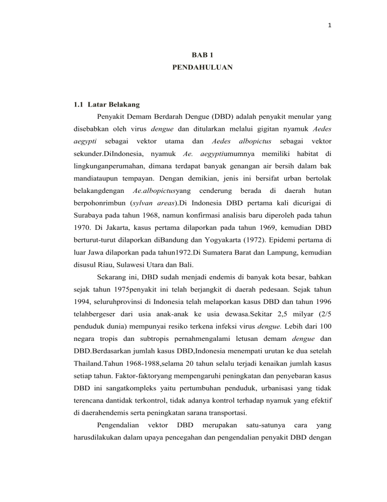 1 BAB 1 PENDAHULUAN 1.1 Latar Belakang Penyakit Demam Berdarah Dengue (DBD) adalah penyakit menular yang disebabkan oleh virus dengue dan ditularkan melalui gigitan nyamuk Aedes aegypti sebagai vektor utama dan Aedes albopictus sebagai vektor sekunder.DiIndonesia, nyamuk Ae. aegyptiumumnya memiliki habitat di lingkunganperumahan, dimana terdapat banyak genangan air bersih dalam bak mandiataupun tempayan. Dengan demikian, jenis ini bersifat urban bertolak belakangdengan Ae.albopictusyang cenderung berada di daerah hutan berpohonrimbun (sylvan areas).Di Indonesia DBD pertama kali dicurigai di Surabaya pada tahun 1968, namun konfirmasi analisis baru diperoleh pada tahun 1970. Di Jakarta, kasus pertama dilaporkan pada tahun 1969, kemudian DBD berturut-turut dilaporkan diBandung dan Yogyakarta (1972). Epidemi pertama di luar Jawa dilaporkan pada tahun1972.Di Sumatera Barat dan Lampung, kemudian disusul Riau, Sulawesi Utara dan Bali. Sekarang ini, DBD sudah menjadi endemis di banyak kota besar, bahkan sejak tahun 1975penyakit ini telah berjangkit di daerah pedesaan. Sejak tahun 1994, seluruhprovinsi di Indonesia telah melaporkan kasus DBD dan tahun 1996 telahbergeser dari usia anak-anak ke usia dewasa.Sekitar 2,5 milyar (2/5 penduduk dunia) mempunyai resiko terkena infeksi virus dengue. Lebih dari 100 negara tropis dan subtropis pernahmengalami letusan demam dengue dan DBD.Berdasarkan jumlah kasus DBD,Indonesia menempati urutan ke dua setelah Thailand.Tahun 1968-1988,selama 20 tahun selalu terjadi kenaikan jumlah kasus setiap tahun. Faktor-faktoryang mempengaruhi peningkatan dan penyebaran kasus DBD ini sangatkompleks yaitu pertumbuhan penduduk, urbanisasi yang tidak terencana dantidak terkontrol, tidak adanya kontrol terhadap nyamuk yang efektif di daerahendemis serta peningkatan sarana transportasi. Pengendalian vektor DBD merupakan satu-satunya cara yang harusdilakukan dalam upaya pencegahan dan pengendalian penyakit DBD dengan 2 tujuanmemutus mata rantai penularan DBD,sebabhingga sekarang obat antivirus denguedan vaksin DBD belum ditemukan.Terdapat beberapa macam pengendalian vektor DBD yang telah dilakukan dan memberikan hasil yang menjanjikan (promising), antara lain pengendalian dengan menggunakan 1%Abate/Temefos berbentuk granula pasir (sand granules) pada stadium larva dan4% malation dalam bentuk asap (fog) pada stadium dewasa.Selain itu, dilakukan pengasapan dan abatesasi masal yang dapat berhasil menekanpopulasi vektor DBD, namun hal tersebut tidak mungkin dilakukan secara terus-menerus sebab biaya operasional yang mahal dan juga kemungkinan penggunaaninsektisida dengan dosis yang kurang tepat (sublethal dosage) akan mengakibatkantimbulnya resistensi nyamuk terhadap insektisida yang digunakan. Di samping itu,juga akan menyebabkan timbulnya pencemaran lingkungan. Pemerintah Indonesia melalui Departemen Kesehatan telah memilih carapengendalian vektor DBD yang murah, mudah, aman dan dapat dilakukan olehmasyarakat sendiri, yaitu dengan Pemberantasan Sarang Nyamuk (PSN) yangbertujuan menekan serendah-rendahnya populasi Ae. aegypti. Kegiatan PSNyang dilakukan yaitu melalui 3 M. Selain itu, pemasangan ovitrap di rumahrumah dan di tempat-tempat umum juga merupakan kegiatan PSN untuk mengendalikanpopulasi nyamuk Ae.aegypti. Salah satu upaya untuk memutus siklus perkembangan nyamuk dapat dengan menggunakan ovitrap atau perangkap telur dan larva nyamuk, khususnya untuk Ae. aegypti.Ovitrap telah umum digunakan dan diproduksi secara massal di Singapura dan Malaysia. Disana ovitrap dikenal dengan namaMosquito Larvae Trapping Device (MLTD). Ovitrap berarti perangkap telur (ovum = telur, trap = perangkap) terbukti menekan pertumbuhan nyamuk hingga 50%. Ovitrap mudah dibuat, murah dan efektif.Ovitrap merupakan suatu perangkap telur nyamuk yang berupa tabung botol (plastik/kaleng/tanah liat dan lain-lain) yang diisi air dan diberi kertas/kain/tongkat kayu untuk meletakkan telur.Ovitrap terdiri atas beberapa bagian, yaitu ram kawat dan bagian penampung air. Air dapat ditambah rendaman jerami padi dan ragi untuk pertumbuhan bakteri sebagai pakan jentik nyamuk.Menggunakan jerami padi karena mengandung beberapa unsur mineral namun aedes tidak suka yang mengandung 3 banyak mineral tapi O2. Ovitrap dicat hitam dan disimpan di tempat lembap agar disukai nyamuk. Alat sederhana ini harus dapat memancing nyamuk agar bertelur di sana. Nyamuk dewasa akan bertelur pada permukaan atas ovitrap. Kemudian, telur akanmasuk ke dalam air di penampung. Larva dan pupa masih dapat hidup di ovitrap itu, namun saat berkembang menjadi dewasa, nyamuk tak akan dapat keluar dari ovitrap karena terhalang ram kawat hingga akhirnya mati. Metode perangkap nyamuk dengan ovitrap ini lebih efektif jika diterapkan pada daerah yang sering menjadi sarang nyamuk Ae. aegypti. Dalam praktikum kesehatan lingkungan ini akan dilakukan pembuatanovitrap dan membandingkanovitrap menggunakan 10% air rendaman jerami padi dengan campuran gula pasir dan bubuk ragi serta mengidentifikasikan jentik nyamuk Ae.aegypti.Gula pasir dan bubuk ragi digunakan karena campuran tersebut dapat menjadi media berkembangnya larva dan pupa Ae. aegypti. 1.2 Rumusan Masalah 1. Bagaimana cara pembuatan ovitrap menggunakan campuran gula pasir dan bubuk ragi? 2. Bagaimana cara pemeriksaan jentik nyamukAe. aegypti? 1.3 Tujuan 1.3.1 Tujuan Umum Mempraktikkan pembuatan ovitrap dan pemeriksaan jentik nyamuk Ae.aegypti. 1.3.2 Tujuan Khusus 1. Mempraktikkan pembuatan ovitrap dengan 10% air rendaman jerami padi dan campuran gula pasir dengan bubuk ragi. 2. Mengetahui jenis air yang disukai nyamuk Ae. Aegypti untuk bertelur. 1.4 Manfaat Adapun manfaat yang dapat diperoleh dari praktikum sebagai berikut. 1. Dapat melakukan proses pembuatan ovitrap. 2. Mengetahui jenis air yang disukai nyamuk Ae. aegyptidalam bertelur. 4 3. Menambah pengetahuan mengenai tempat perindukan nyamuk Ae. aegypti. 4. Menambah wawasan dalam pemeriksaan jentik nyamuk Ae. aegyptidan analisisnya. 5 BAB 2 TINJAU