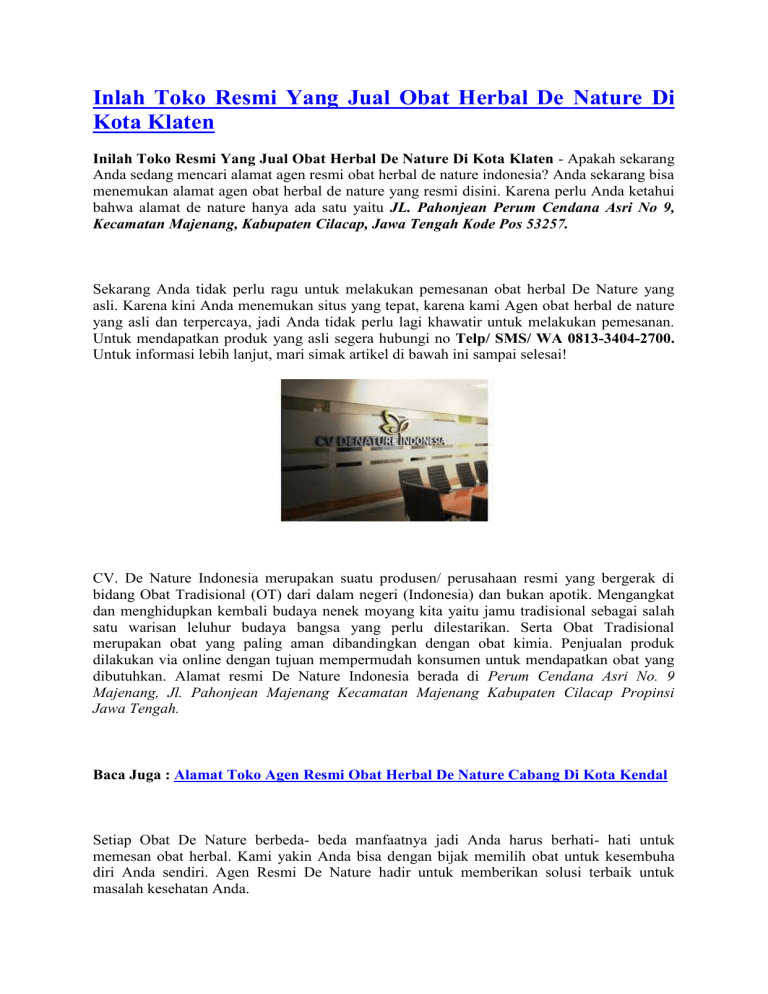 Inlah Toko Resmi Yang Jual Obat Herbal De Nature Di Kota Klaten Inilah Toko Resmi Yang Jual Obat Herbal De Nature Di Kota Klaten - Apakah sekarang Anda sedang mencari alamat agen resmi obat herbal de nature indonesia? Anda sekarang bisa menemukan alamat agen obat herbal de nature yang resmi disini. Karena perlu Anda ketahui bahwa alamat de nature hanya ada satu yaitu JL. Pahonjean Perum Cendana Asri No 9, Kecamatan Majenang, Kabupaten Cilacap, Jawa Tengah Kode Pos 53257. Sekarang Anda tidak perlu ragu untuk melakukan pemesanan obat herbal De Nature yang asli. Karena kini Anda menemukan situs yang tepat, karena kami Agen obat herbal de nature yang asli dan terpercaya, jadi Anda tidak perlu lagi khawatir untuk melakukan pemesanan. Untuk mendapatkan produk yang asli segera hubungi no Telp/ SMS/ WA 0813-3404-2700. Untuk informasi lebih lanjut, mari simak artikel di bawah ini sampai selesai! CV. De Nature Indonesia merupakan suatu produsen/ perusahaan resmi yang bergerak di bidang Obat Tradisional (OT) dari dalam negeri (Indonesia) dan bukan apotik. Mengangkat dan menghidupkan kembali budaya nenek moyang kita yaitu jamu tradisional sebagai salah satu warisan leluhur budaya bangsa yang perlu dilestarikan. Serta Obat Tradisional merupakan obat yang paling aman dibandingkan dengan obat kimia. Penjualan produk dilakukan via online dengan tujuan mempermudah konsumen untuk mendapatkan obat yang dibutuhkan. Alamat resmi De Nature Indonesia berada di Perum Cendana Asri No. 9 Majenang, Jl. Pahonjean Majenang Kecamatan Majenang Kabupaten Cilacap Propinsi Jawa Tengah. Baca Juga : Alamat Toko Agen Resmi Obat Herbal De Nature Cabang Di Kota Kendal Setiap Obat De Nature berbeda- beda manfaatnya jadi Anda harus berhati- hati untuk memesan obat herbal. Kami yakin Anda bisa dengan bijak memilih obat untuk kesembuha diri Anda sendiri. Agen Resmi De Nature hadir untuk memberikan solusi terbaik untuk masalah kesehatan Anda. Sekarang Anda bisa mendapatkan obat de nature dengat sangat mudah, Anda cukup duduk nyaman dirumah dan pesan produk obat herbal de nature yang sedang Anda butuhkan saat ini. Hubungi kontak kami, lalu Anda bisa melakukan transaksi pembayaran terlebih dahulu, kemudian barang akan langsung kami kirimkan kealamat yang Anda berikan. Produk- produk De Nature Yang Paling Di Minati 1. PAKET PENGOBATAN WASIR/ AMBEIEN Pengobatan Wasir/ Ambeien yang terkenal yaitu obat Ambejoss dan Salwa, obat ini sudah sangat terkenal ampuh untuk menyembuhkan wasir/ ambeien. Sebelumnya Merk pertama obat ini adalah Ambeclear dan sekarang mejadi Ambejoss. Obat ini sangat banyak sekali peminatnya diseluruh Indonesia. Jenis Obat Wasir/ Ambeien De Nature : AMBEJOSS SALEP SALWA ZIIRZAK ZAITOP 2. PAKET PENGOBATAN SIPILIS, KENCING NANAH, GONORE (BAIK UNTUK PRIA DAN WANITA) Obat Sipilis, Kencing Nanah, Gonore (baik untuk pria dan wanita) karena sudah terbukti khasiatnya, obat jenis ini juga sangat diminati oleh para pasien kami diseluruh Indonesia. Jenis Obat Sipilis, Kencing Nanah, Gonore De Nature : GANG JIE GHO SIAH KAPSUL BD PIPECA SALEP PLUS 3. PAKET PENGOBATAN KUTIL KELAMIN (PADA WANITA DAN PRIA) Obat Kutil Kelamin (untuk wanita dan pria) jenis obat ini sangat terbukti keamannya. De Nature sebagai produsen obat kutil kelamin paling terpercaya, kami menyediakan paket hemat pengobatan kutil kelamin untuk wanita dan pria. Jenis Obat Kutil Kelamin De Nature : GANG JIE GHO SIAH KAPSUL BD PIPECA SALEP PLUS ANTIPILOMA MADU HERBAL OBAT HERBAL DE NATURE INDONESIA AMAN & ALAMI JL. Pahonjean Perum Cendana Asri No 9, Kecamatan Majenang, Kabupaten Cilacap,Jawa Tengah Kode Pos 53257 Whatsapp/ Telp/ Sms : 0813-3404-2700 Agen Resmi De Nature Indonesia menyediakan berbagai macam obat herbal de nature sebagai solusi untuk masalah kesehatan Anda. Anda sekarang tidak perlu lagi bingungbingung untuk mencari obat herbal yang ampuh untuk menyembuhkan penyakit yang sedang Anda derita, setiap penyakit pasti ada obatnya tetapi tidak semua penyakit obatnya sama, jadi Anda harus bijak dalam memilih obat herbal. Obat herbal de nature adalah solusi yang tepat untuk setiap penyakit Anda, Anda tidak perlu ragu untuk mengonsumsi obat herbal de nature, karena de nature dijamin aman dan ampuh untuk segala penyakit Anda. Berikut Daftar Produk Obat Herbal De Nature Indonesia : Obat eksim De Nature Indonesia Obat kencing nanah De Nature Indonesia Obat herpes De Nature Indonesia Obat kanker De Nature Indonesia Obat tumor De Nature Indonesia Obat kista De Nature Indonesia Obat keputihan De Nature Indonesia Obat perawatan miss v De Nature Indonesia Obat perapat miss v de nature Obat gatal De Nature Indonesia Obat fistula ani De Nature Indonesia Obat stroke De Nature Indonesia Obat paru paru De Nature Indonesia Obat batuk berdarah De Nature Indonesia Obat TBC De Nature Indonesia Obat diabetes De Nature Indonesia Obat asam urat De Nature Indonesia Obat kolesterol De Nature Indonesia Obat maag kronis De Nature Indonesia Obat pembesar penis De Nature Indonesia Obat kuat De Nature Indonesia Obat batu ginjal De Nature Indonesia Obat hepatitis De Nature Indonesia Obat penyubur kandungan De Nature Indonesia Obat pelangsing De Nature Indonesia Obat penggemuk badan De Nature Indonesia Obat pembersih darah De Nature Indonesia Obat penyakit kulit De Nature Indonesia Anda bisa sembuh lebih cepat dengan mengonsumsi obat herbal de nature dibandingkan dengan mengonsumsi obat herbal yang ada dipasaran. Karena obat herbal de nature terbuat dari bahan- bahan alami yang sudah terbukti khasiatnya dan diproduksi langsung oleh para ahli yang handal, dan produk kami diterima langsung oleh para konsumen secara langsung. Sekarang Anda tidak perlu khawatir untuk melakukan pemesanan produk obat herbal de nature kami. Anda cukup duduk nyaman kemudian lakukan pesanan obat herbal de nature yang Anda butuhkan. Obat herbal De Nature tidak dipasarkan di apotik ataupun toko- toko obat manapun. Untuk memudahkan Anda dalam membeli obat herbal de nature kami. Oleh sebab itu semua obat De Nature yang
