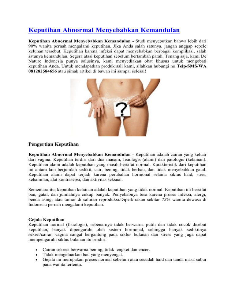 Keputihan Abnormal Menyebabkan Kemandulan Keputihan Abnormal Menyebabkan Kemandulan - Studi menyebutkan bahwa lebih dari 90% wanita pernah mengalami keputihan. Jika Anda salah satunya, jangan anggap sepele keluhan tersebut. Keputihan karena infeksi dapat menyebabkan berbagai komplikasi, salah satunya kemandulan. Segera atasi keputihan sebelum bertambah parah. Tenang saja, kami De Nature Indonesia punya solusinya, kami menyediakan obat khusus untuk mengobati keputihan Anda. Untuk mendapatkan produk asli kami, silahkan hubungi no Telp/SMS/WA 081282584656 atau simak artikel di bawah ini sampai selesai! Pengertian Keputihan Keputihan Abnormal Menyebabkan Kemandulan - Keputihan adalah cairan yang keluar dari vagina. Keputihan terdiri dari dua macam, fisiologis (alami) dan patologis (kelainan). Keputihan alami adalah keputihan yang masih bersifat normal. Karakteristik dari keputihan ini antara lain berjumlah sedikit, cair, bening, tidak berbau, dan tidak menyebabkan gatal. Keputihan alami dapat terjadi karena perubahan hormonal selama siklus haid, stres, kehamilan, alat kontrasepsi, dan aktivitas seksual. Sementara itu, keputihan kelainan adalah keputihan yang tidak normal. Keputihan ini bersifat bau, gatal, dan jumlahnya cukup banyak. Penyebabnya bisa karena proses infeksi, alergi, benda asing, atau tumor di saluran reproduksi.Diperkirakan sekitar 75% wanita dewasa di Indonesia pernah mengalami keputihan. Gejala Keputihan Keputihan normal (fisiologis), sebenarnya tidak berwarna putih dan tidak cocok disebut keputihan, banyak dipengaruhi oleh sistem hormonal, sehingga banyak sedikitnya sekret/cairan vagina sangat bergantung pada siklus bulanan dan stress yang juga dapat mempengaruhi siklus bulanan itu sendiri. Cairan sekresi berwarna bening, tidak lengket dan encer. Tidak mengeluarkan bau yang menyengat. Gejala ini merupakan proses normal sebelum atau sesudah haid dan tanda masa subur pada wanita tertentu. Pada bayi perempuan yang baru lahir, dalam waktu satu hingga sepuluh hari, dari vaginanya dapat keluar cairan akibat pengaruh hormon yang dihasilkan oleh plasenta atau uri. Gadis muda kadang-kadang juga mengalami keputihan sesaat sebelum masa pubertas, biasanya gejala ini akan hilang dengan sendirinya. Biasanya keputihan yang normal tidak disertai dengan rasa gatal. Keputihan juga dapat dialami oleh wanita yang terlalu lelah atau yang daya tahan tubuhnya lemah. Sebagian besar cairan tersebut berasal dari leher rahim, walaupun ada yang berasal dari vagina yang terinfeksi, atau alat kelamin luar. Pada wanita hamil keputihan lebih sering timbul, karena pada ssat wanita hamil, maka kekebaln tubuhnya akan menurun. Pada waktu menopause dimana keseimbangan hormonalnya terganggu. Pada orang tua dimana kekebalan tubuhnya sudah menurun dapat pula timbul Keputihan Tanda-tanda keputihan tidak normal :: Berbau Umumnya keputihan yang normal tidaklah bau. Ketika keputihan Anda berbau bahkan menyengat dan hampir dikatakan seperti bau busuk, maka bisa jadi ada kuman yang bersarang dan berkembang biak di miss V Anda. ::Berwarna Ketika normal, warna keputihan adalah bening dan transparan. Namun jika sudah hijau pekat, kuning, atau bahkan disertai dengan darah, ini masuk dalam kategori keputihan yang tidak normal. ::Menimbulkan gatal Area V Anda gatal dan ketika mengalami keputihan? Ini juga merupakan salah satu ciri miss V dalam masalah. :: Nyeri ketika kencing Nyeri ketika kencing merupakan tanda bahaya ketika Anda sedang mengalami keputihan. Ini tanda bahwa kuman sudah sampai di kandung kemih Anda. Penyebab keputihan Penyebab keputihan secara umum adalah: Ketidakseimbangan hormon Gejala suatu penyakit tertentu Rusaknya keseimbangan biologis dan keasaman (pH) lingkungan vagina. Hal-hal yang bisa terjadinya infeksi Sering memakai tissue saat membasuh bagian kewanitaan, sehabis buang air kecil maupun buang air besar Memakai pakaian dalam yang ketat dari bahan sintetis (bukan katun), sehingga berkeringat dan memudahkan timbulnya jamur Sering menggunakan toilet umum yang kotor Tidak mengganti panty liner Membilas vagina dari arah yang salah, yaitu dari arah anus ke arah depan vagina Sering bertukar celana dalam/handuk dengan orang lain Kurang menjaga kebersihan vagina Kelelahan yang amat sangat Stres Tidak segera mengganti pembalut saat menstruasi Sering membasuh vagina, yang harus dibasuh adalah vulva (bagian yang menggembung) dan bukan vaginanya Tidak mejalani pola hidup sehat (makan tidak teratur, tidak pernah olahraga, tidur kurang) Lingkungan sanitasi yang kotor. Sering mandi berendam dengan air hangat dan panas. Jamur yang menyebabkan keputihan lebih mungkin tumbuh di kondisi hangat. Sering berganti pasangan dalam berhubungan seks Kadar gula darah tinggi Sering menggaruk vagina � Kami De Nature Indonesia, Apotik Herbal Online menjual berbagai produk herbal untuk penyakit kelamin seperti Kencing Nanah, Wasir, Sipilis, Kutil Kelamin dan lainnya. Untuk konsultasi dan pemesanan hubungi no Telp/SMS/WA 081282584656. De Nature Indonesia beralamat di Perum Cendana Asri No.9 Majenang, Jl. Pahonjean Km.5 Majenang, Cilacap, Jawa Tengah � Jenis-jenis Keputihan yang Tidak Normal Keputihan yang tidak normal umumnya terjadi karena infeksi. Kondisi ini juga terkadang dapat menjadi indikasi dari penyakit-penyakit tertentu sehingga sebaiknya diwaspadai. Berikut ini adalah penjelasan jenis-jenis keputihan yang tidak normal: :: Keputihan dengan lendir berwarna cokelat atau mengandung darah Keputihan ini umumnya disebabkan oleh siklus menstruasi yang tidak teratur. Tetapi tetap perlu diwaspadai karena walau jarang, kondisi ini bisa menjadi indikasi dari kanker serviks atau rahim. :: Keputihan disertai rasa nyeri atau pendarahan Rasa nyeri pada tulang panggul atau saat buang air kecil serta munculnya pendarahan di luar siklus menstruasi atau setelah berhubungan seks yang menyertai keputihan, dapat mengindikasikan gonore atau chlamydia (klamidia). Jika dibiarkan, kedua penyakit menular seksual ini dapat memicu infeksi serius 