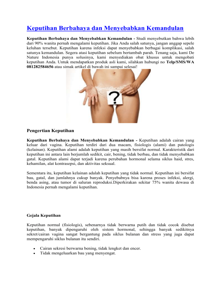 Keputihan Berbahaya dan Menyebabkan Kemandulan Keputihan Berbahaya dan Menyebabkan Kemandulan - Studi menyebutkan bahwa lebih dari 90% wanita pernah mengalami keputihan. Jika Anda salah satunya, jangan anggap sepele keluhan tersebut. Keputihan karena infeksi dapat menyebabkan berbagai komplikasi, salah satunya kemandulan. Segera atasi keputihan sebelum bertambah parah. Tenang saja, kami De Nature Indonesia punya solusinya, kami menyediakan obat khusus untuk mengobati keputihan Anda. Untuk mendapatkan produk asli kami, silahkan hubungi no Telp/SMS/WA 081282584656 atau simak artikel di bawah ini sampai selesai! Pengertian Keputihan Keputihan Berbahaya dan Menyebabkan Kemandulan - Keputihan adalah cairan yang keluar dari vagina. Keputihan terdiri dari dua macam, fisiologis (alami) dan patologis (kelainan). Keputihan alami adalah keputihan yang masih bersifat normal. Karakteristik dari keputihan ini antara lain berjumlah sedikit, cair, bening, tidak berbau, dan tidak menyebabkan gatal. Keputihan alami dapat terjadi karena perubahan hormonal selama siklus haid, stres, kehamilan, alat kontrasepsi, dan aktivitas seksual. Sementara itu, keputihan kelainan adalah keputihan yang tidak normal. Keputihan ini bersifat bau, gatal, dan jumlahnya cukup banyak. Penyebabnya bisa karena proses infeksi, alergi, benda asing, atau tumor di saluran reproduksi.Diperkirakan sekitar 75% wanita dewasa di Indonesia pernah mengalami keputihan. Gejala Keputihan Keputihan normal (fisiologis), sebenarnya tidak berwarna putih dan tidak cocok disebut keputihan, banyak dipengaruhi oleh sistem hormonal, sehingga banyak sedikitnya sekret/cairan vagina sangat bergantung pada siklus bulanan dan stress yang juga dapat mempengaruhi siklus bulanan itu sendiri. Cairan sekresi berwarna bening, tidak lengket dan encer. Tidak mengeluarkan bau yang menyengat. Gejala ini merupakan proses normal sebelum atau sesudah haid dan tanda masa subur pada wanita tertentu. Pada bayi perempuan yang baru lahir, dalam waktu satu hingga sepuluh hari, dari vaginanya dapat keluar cairan akibat pengaruh hormon yang dihasilkan oleh plasenta atau uri. Gadis muda kadang-kadang juga mengalami keputihan sesaat sebelum masa pubertas, biasanya gejala ini akan hilang dengan sendirinya. Biasanya keputihan yang normal tidak disertai dengan rasa gatal. Keputihan juga dapat dialami oleh wanita yang terlalu lelah atau yang daya tahan tubuhnya lemah. Sebagian besar cairan tersebut berasal dari leher rahim, walaupun ada yang berasal dari vagina yang terinfeksi, atau alat kelamin luar. Pada wanita hamil keputihan lebih sering timbul, karena pada ssat wanita hamil, maka kekebaln tubuhnya akan menurun. Pada waktu menopause dimana keseimbangan hormonalnya terganggu. Pada orang tua dimana kekebalan tubuhnya sudah menurun dapat pula timbul Keputihan Tanda-tanda keputihan tidak normal :: Berbau Umumnya keputihan yang normal tidaklah bau. Ketika keputihan Anda berbau bahkan menyengat dan hampir dikatakan seperti bau busuk, maka bisa jadi ada kuman yang bersarang dan berkembang biak di miss V Anda. ::Berwarna Ketika normal, warna keputihan adalah bening dan transparan. Namun jika sudah hijau pekat, kuning, atau bahkan disertai dengan darah, ini masuk dalam kategori keputihan yang tidak normal. ::Menimbulkan gatal Area V Anda gatal dan ketika mengalami keputihan? Ini juga merupakan salah satu ciri miss V dalam masalah. :: Nyeri ketika kencing Nyeri ketika kencing merupakan tanda bahaya ketika Anda sedang mengalami keputihan. Ini tanda bahwa kuman sudah sampai di kandung kemih Anda. Penyebab keputihan Penyebab keputihan secara umum adalah: Ketidakseimbangan hormon Gejala suatu penyakit tertentu Rusaknya keseimbangan biologis dan keasaman (pH) lingkungan vagina. Hal-hal yang bisa terjadinya infeksi Sering memakai tissue saat membasuh bagian kewanitaan, sehabis buang air kecil maupun buang air besar Memakai pakaian dalam yang ketat dari bahan sintetis (bukan katun), sehingga berkeringat dan memudahkan timbulnya jamur Sering menggunakan toilet umum yang kotor Tidak mengganti panty liner Membilas vagina dari arah yang salah, yaitu dari arah anus ke arah depan vagina Sering bertukar celana dalam/handuk dengan orang lain Kurang menjaga kebersihan vagina Kelelahan yang amat sangat Stres Tidak segera mengganti pembalut saat menstruasi Sering membasuh vagina, yang harus dibasuh adalah vulva (bagian yang menggembung) dan bukan vaginanya Tidak mejalani pola hidup sehat (makan tidak teratur, tidak pernah olahraga, tidur kurang) Lingkungan sanitasi yang kotor. Sering mandi berendam dengan air hangat dan panas. Jamur yang menyebabkan keputihan lebih mungkin tumbuh di kondisi hangat. Sering berganti pasangan dalam berhubungan seks Kadar gula darah tinggi Sering menggaruk vagina � Kami De Nature Indonesia, Apotik Herbal Online menjual berbagai produk herbal untuk penyakit kelamin seperti Kencing Nanah, Wasir, Sipilis, Kutil Kelamin dan lainnya. Untuk konsultasi dan pemesanan hubungi no Telp/SMS/WA 081282584656. De Nature Indonesia beralamat di Perum Cendana Asri No.9 Majenang, Jl. Pahonjean Km.5 Majenang, Cilacap, Jawa Tengah � Jenis-jenis Keputihan yang Tidak Normal Keputihan yang tidak normal umumnya terjadi karena infeksi. Kondisi ini juga terkadang dapat menjadi indikasi dari penyakit-penyakit tertentu sehingga sebaiknya diwaspadai. Berikut ini adalah penjelasan jenis-jenis keputihan yang tidak normal: :: Keputihan dengan lendir berwarna cokelat atau mengandung darah Keputihan ini umumnya disebabkan oleh siklus menstruasi yang tidak teratur. Tetapi tetap perlu diwaspadai karena walau jarang, kondisi ini bisa menjadi indikasi dari kanker serviks atau rahim. :: Keputihan disertai rasa nyeri atau pendarahan Rasa nyeri pada tulang panggul atau saat buang air kecil serta munculnya pendarahan di luar siklus menstruasi atau setelah berhubungan seks yang menyertai keputihan, dapat mengindikasikan gonore atau chlamydia (klamidia). Jika dibiarkan, kedua penyakit menular seksual ini dapat memicu 
