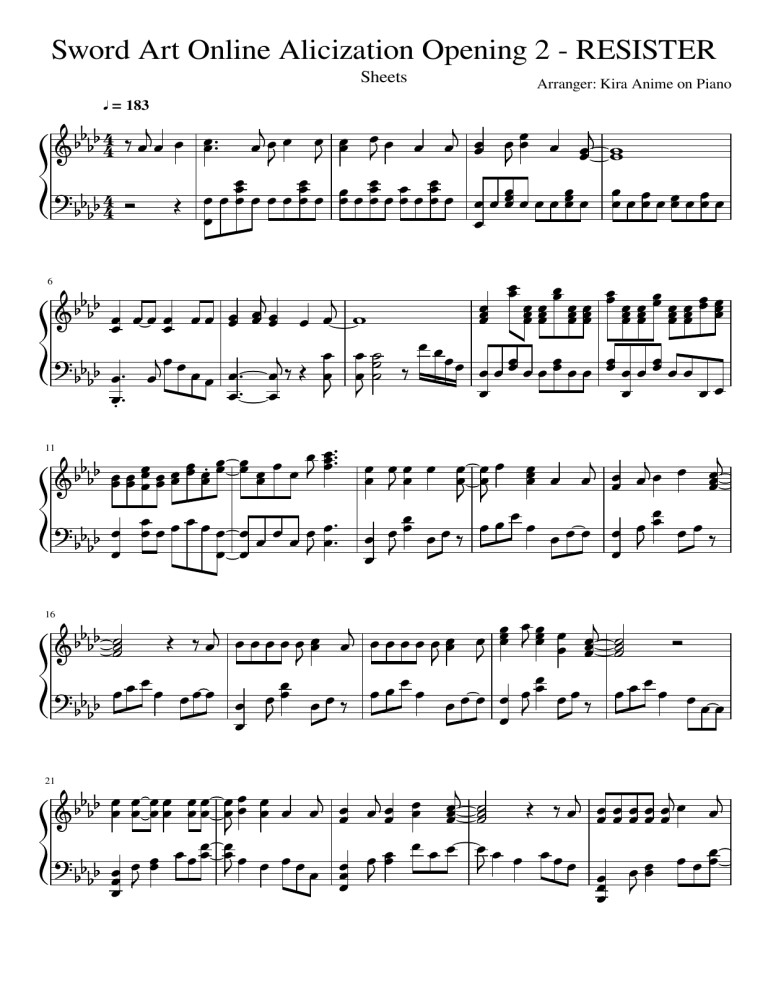 Sword Art Online Alicization Opening 2 - RESISTER Sheets Arranger: Kira Anime on Piano = 183 4 4 44 6 11 16 21 26 31 35 39 44 48 2 52 57 61 65 3