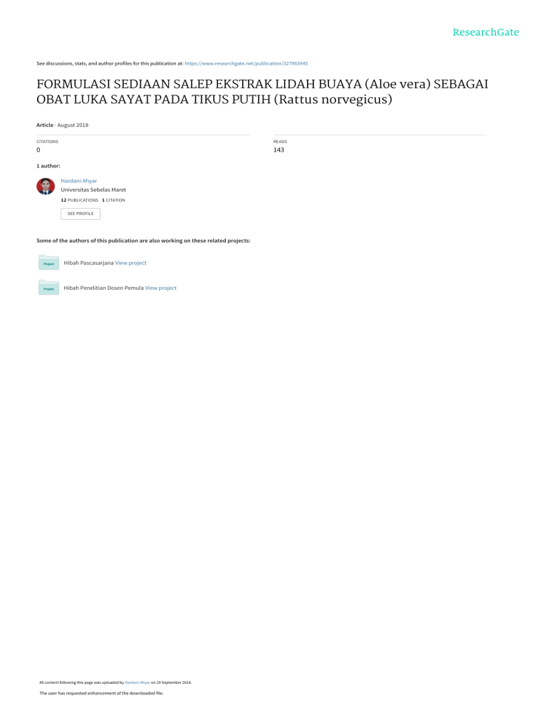 See discussions, stats, and author profiles for this publication at: https://www.researchgate.net/publication/327965945 FORMULASI SEDIAAN SALEP EKSTRAK LIDAH BUAYA (Aloe vera) SEBAGAI OBAT LUKA SAYAT PADA TIKUS PUTIH (Rattus norvegicus) Article · August 2018 CITATIONS READS 0 143 1 author: Hardani Ahyar Universitas Sebelas Maret 12 PUBLICATIONS 1 CITATION SEE PROFILE Some of the authors of this publication are also working on these related projects: Hibah Pascasarjana View project Hibah Penelitian Dosen Pemula View project All content following this page was uploaded by Hardani Ahyar on 29 September 2018. The user has requested enhancement of the downloaded file. FORMULASI SEDIAAN SALEP EKSTRAK LIDAH BUAYA (Aloe vera) SEBAGAI OBAT LUKA SAYAT PADA TIKUS PUTIH (Rattus norvegicus) Nurul Ainingsih1,a, Ajeng Dian Pertiwi2*,b, Hardani3,c DIII Farmasi Politeknik Medica Farma Husada Mataram 2,3 Dosen Farmasi Politeknik Medica Farma Husada Mataram Email: [email protected], [email protected], [email protected] 1 ABSTRAK Aloe vera merupakan tanaman yang memiliki banyak manfaat, tanaman ini terkadang dikenal sebagai tanaman ajaib. Kandungan yang terkandung dalam lidah buaya adalah tanin, saponin dan flavanoid. Tujuan penelitian ini adalah untuk mengetahui formulasi sediaan salep ekstrak lidah buaya (aloe vera) sebagai obat luka sayat pada tikus putih (rattus norvegicus). Metode ekstraksi yang digunakan adalah metode maserasi menggunakan pelarut etanol 70%. Formulasi sediaan salep dibuat dalam tiga formulasi. Formulasi 1 dengan konsentrasi 10%, formulasi 2 dengan konsentrasi 30%, dan formulasi 3 dengan konsentrasi 50%. Kontrol negatif menggunakan dasar salep dan kontrol positif menggunakan betadine (povidone iodine). Data yang diperoleh berupa uji organoletik, uji ph, uji daya lekat dan homogenitas, dan uji in vivo. Dari hasil uji organoleptik menunjukkan bahwa formulasi sesuai dengan spesifikasi salep. Nilai pH sesuai dengan pH kulit yaitu 5, memiliki daya lekat yang baik, dan uji homogenitas menunjukkan tidak ada butiran kasar yang terkandung dalam tiga formulasi. Hasil uji in vivo menunjukkan bahwa formulasi salep 50% memiliki persentase tertinggi penyembuhan luka yaitu sebesar 64,3%. Kata Kunci : Salep, Lidah Buaya, Luka Sayat. PENDAHULUAN Luka adalah hilang atau rusaknya sebagian jaringan tubuh. Penyebab luka dapat berasal dari tusukan /goresan benda tajam benturan benda tumpul, kecelakaan, terkena tembakan, gigitan hewan, bahan kimia, air panas, uap air, terkena api atau terbakar, listrik dan petir (Murtutik dan Marjiyanto, 2013). Luka diklasifikasikan dalam dua bagian yaitu luka akut dan luka kronik. Luka akut memiliki serangan yang cepat dan penyembuhannya sesuai dengan waktu yang diperkirakan. Contoh luka akut adalah jahit karena pembedahan, luka sayat, luka bakar, luka tusuk. Sedangkan luka kronik, luka yang gagal sembuh pada waktu yang diperkirakan. Contoh ulkus diabetes, ulkus venous (PerdanaKusuma, 2007). Luka sayat dikategorikan ke dalam luka akut yang berupa trauma, baru, mendadak dan cepat penyembuhannya (Perdana Kusuma, 2007). Upaya untuk menyembuhkan luka tersebut, maka dipilih ektrak lidah buaya yang mempunyai aktivitas sebagai penyembuhasn luka. Tanaman lidah buaya merupakan semak tahunan. Semak tahunan ini tumbuh tegak, tinggi 30-50 cm. Batangnya bulat, warna putih, tidak berkayu. Daunnya panjang 30-50 cm, lebar 3-5 cm, berdaging tebal, bergetah ISBN : 978-602-50761-9-0 | Prosiding Seminar Nasional Kesehatan 93 kuning, hijau. Bunga majemuk, bentuk mulai dari ujung batang, daun pelindung panjang 8-15 mm, benang sari enam, putik menyembul keluar atau melekat pada pangkal kepala sari, tangkai putik bentuk benang, kepala putik kecil, ujung tajuk melebar berwarna jingga atau merah. Buahnya kotak, panjang 1422 cm, berkatub, warna hijau keputihputihan. Bijinya kecil berwarna hitam. Akarnya serabut berwarna kuning (Hutapea, 2000). Salep merupakan sediaan semipadat yang mudah dioeleskan yang di dalamnya terkandung berbagai zat kimia dan berbagai obat, yang umumnya digunakan secara topikal pada bagian kulit yang mengalami ngangguan, seperti luka, pegal-pegal, maupun gatal-gatal (Anief, 2005). Basis utama yang biasa digunakan untuk salep dapat dikelompokkan ke dalam basis berlemak, basis larut air, dan basis emulsi. Salep dengan basis berbentuk emulsi biasanya dikenal sebagai krim, yang diklarifikasikan dalam krim minyak dalam air (M/A), dan air dalam minyak (A/M), menurut basis yang digunakan (Goeswin Agoes, 2008). Berdasarkan penjelasan diatas, penulis tertarik meneliti apakah ekstrak Lidah Buaya (Aloe Vera) dapat mengobati luka sayat. Karena, belum pernah ada penelitian tentang lidah buaya (Aloe vera) untuk luka yang dibuat dalam bentuk sediaan topikal seperti salep. Penulis tertarik dengan sediaan salep karena stabilitas baik, berupa sediaan halus, mudah digunakan, mampu menjaga kelembapan kulit. Pengujian efektivitas penyembuhan luka terbuka dilakukan terhadap hewan percobaan yaitu tikus putih (Rattus norvegicus) ( Rini Puspitasari, Sunyoto, Muchson Arrosyid, 2012). METODE PENELITIAN Penelitian ini merupakan penelitian eksperimen di Laboratorium. Penelitian eksperimen (percobaan) adalah suatu penelitian dengan melakukan kegiatan percobaan yang bertujuan untuk mengetahui gejala atau pengaruh yang timbul, sebagai akibat dari adanya perlakuan tertentu atau eksperimen tersebut. (Natoatmodjo. 2012:50). Sesuai dengan teori di atas jenis penelitian yaitu dengan cara mengelompokkan sediaan salep ekstrak lidah buayam( 10%,30%,50% ) lalu di beri perlakuan ke pada hewan uji ( tikus putih ). Penelitian ini dilaksanakan di Laboratorium Biologi Politeknik Medica Farma Husada Mataram dan Laboratorium Imunobiologi Universitas Mataram. Waktu penelitian dilaksanakan pada bulan mei dan juni 2018. Populasi yang di jadikan objek penelitian ini adalah semua bagian dari tanaman lidah buaya yang di peroleh di bendungan yang berlokasi di sakra barat kecamatan sakra , Lombok timur. Sedang kan sampel yang di gu