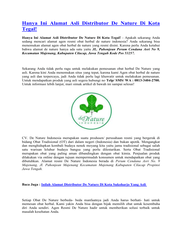 Hanya Ini Alamat Asli Distributor De Nature Di Kota Tegal! Hanya Ini Alamat Asli Distributor De Nature Di Kota Tegal! - Apakah sekarang Anda sedang mencari alamat agen resmi obat herbal de nature indonesia? Anda sekarang bisa menemukan alamat agen obat herbal de nature yang resmi disini. Karena perlu Anda ketahui bahwa alamat de nature hanya ada satu yaitu JL. Pahonjean Perum Cendana Asri No 9, Kecamatan Majenang, Kabupaten Cilacap, Jawa Tengah Kode Pos 53257. Sekarang Anda tidak perlu ragu untuk melakukan pemesanan obat herbal De Nature yang asli. Karena kini Anda menemukan situs yang tepat, karena kami Agen obat herbal de nature yang asli dan terpercaya, jadi Anda tidak perlu lagi khawatir untuk melakukan pemesanan. Untuk mendapatkan produk yang asli segera hubungi no Telp/ SMS/ WA : 0813-3404-2700. Untuk informasi lebih lanjut, mari simak artikel di bawah ini sampai selesai! CV. De Nature Indonesia merupakan suatu produsen/ perusahaan resmi yang bergerak di bidang Obat Tradisional (OT) dari dalam negeri (Indonesia) dan bukan apotik. Mengangkat dan menghidupkan kembali budaya nenek moyang kita yaitu jamu tradisional sebagai salah satu warisan leluhur budaya bangsa yang perlu dilestarikan. Serta Obat Tradisional merupakan obat yang paling aman dibandingkan dengan obat kimia. Penjualan produk dilakukan via online dengan tujuan mempermudah konsumen untuk mendapatkan obat yang dibutuhkan. Alamat resmi De Nature Indonesia berada di Perum Cendana Asri No. 9 Majenang, Jl. Pahonjean Majenang Kecamatan Majenang Kabupaten Cilacap Propinsi Jawa Tengah. Baca Juga : Inilah Alamat Distributor De Nature Di Kota Sukoharjo Yang Asli Setiap Obat De Nature berbeda- beda manfaatnya jadi Anda harus berhati- hati untuk memesan obat herbal. Kami yakin Anda bisa dengan bijak memilih obat untuk kesembuha diri Anda sendiri. Agen Resmi De Nature hadir untuk memberikan solusi terbaik untuk masalah kesehatan Anda. Sekarang Anda bisa mendapatkan obat de nature dengat sangat mudah, Anda cukup duduk nyaman dirumah dan pesan produk obat herbal de nature yang sedang Anda butuhkan saat ini. Hubungi kontak kami, lalu Anda bisa melakukan transaksi pembayaran terlebih dahulu, kemudian barang akan langsung kami kirimkan kealamat yang Anda berikan. Produk- produk De Nature Yang Paling Di Minati 1. PAKET PENGOBATAN WASIR/ AMBEIEN Pengobatan Wasir/ Ambeien yang terkenal yaitu obat Ambejoss dan Salwa, obat ini sudah sangat terkenal ampuh untuk menyembuhkan wasir/ ambeien. Sebelumnya Merk pertama obat ini adalah Ambeclear dan sekarang mejadi Ambejoss. Obat ini sangat banyak sekali peminatnya diseluruh Indonesia. Jenis Obat Wasir/ Ambeien De Nature : AMBEJOSS SALEP SALWA ZIIRZAK ZAITOP 2. PAKET PENGOBATAN SIPILIS, KENCING NANAH, GONORE (BAIK UNTUK PRIA DAN WANITA) Obat Sipilis, Kencing Nanah, Gonore (baik untuk pria dan wanita) karena sudah terbukti khasiatnya, obat jenis ini juga sangat diminati oleh para pasien kami diseluruh Indonesia. Jenis Obat Sipilis, Kencing Nanah, Gonore De Nature : GANG JIE GHO SIAH KAPSUL BD PIPECA SALEP PLUS 3. PAKET PENGOBATAN KUTIL KELAMIN (PADA WANITA DAN PRIA) Obat Kutil Kelamin (untuk wanita dan pria) jenis obat ini sangat terbukti keamannya. De Nature sebagai produsen obat kutil kelamin paling terpercaya, kami menyediakan paket hemat pengobatan kutil kelamin untuk wanita dan pria. Jenis Obat Kutil Kelamin De Nature : GANG JIE GHO SIAH KAPSUL BD PIPECA SALEP PLUS ANTIPILOMA MADU HERBAL OBAT HERBAL DE NATURE INDONESIA AMAN & ALAMI JL. Pahonjean Perum Cendana Asri No 9, Kecamatan Majenang, Kabupaten Cilacap,Jawa Tengah Kode Pos 53257 Whatsapp/ Telp/ Sms : 0813-3404-2700 Agen Resmi De Nature Indonesia menyediakan berbagai macam obat herbal de nature sebagai solusi untuk masalah kesehatan Anda. Anda sekarang tidak perlu lagi bingungbingung untuk mencari obat herbal yang ampuh untuk menyembuhkan penyakit yang sedang Anda derita, setiap penyakit pasti ada obatnya tetapi tidak semua penyakit obatnya sama, jadi Anda harus bijak dalam memilih obat herbal. Obat herbal de nature adalah solusi yang tepat untuk setiap penyakit Anda, Anda tidak perlu ragu untuk mengonsumsi obat herbal de nature, karena de nature dijamin aman dan ampuh untuk segala penyakit Anda. Berikut Daftar Produk Obat Herbal De Nature Indonesia : Obat eksim De Nature Indonesia Obat kencing nanah De Nature Indonesia Obat herpes De Nature Indonesia Obat kanker De Nature Indonesia Obat tumor De Nature Indonesia Obat kista De Nature Indonesia Obat keputihan De Nature Indonesia Obat perawatan miss v De Nature Indonesia Obat perapat miss v de nature Obat gatal De Nature Indonesia Obat fistula ani De Nature Indonesia Obat stroke De Nature Indonesia Obat paru paru De Nature Indonesia Obat batuk berdarah De Nature Indonesia Obat TBC De Nature Indonesia Obat diabetes De Nature Indonesia Obat asam urat De Nature Indonesia Obat kolesterol De Nature Indonesia Obat maag kronis De Nature Indonesia Obat pembesar penis De Nature Indonesia Obat kuat De Nature Indonesia Obat batu ginjal De Nature Indonesia Obat hepatitis De Nature Indonesia Obat penyubur kandungan De Nature Indonesia Obat pelangsing De Nature Indonesia Obat penggemuk badan De Nature Indonesia Obat pembersih darah De Nature Indonesia Obat penyakit kulit De Nature Indonesia Anda bisa sembuh lebih cepat dengan mengonsumsi obat herbal de nature dibandingkan dengan mengonsumsi obat herbal yang ada dipasaran. Karena obat herbal de nature terbuat dari bahan- bahan alami yang sudah terbukti khasiatnya dan diproduksi langsung oleh para ahli yang handal, dan produk kami diterima langsung oleh para konsumen secara langsung. Sekarang Anda tidak perlu khawatir untuk melakukan pemesanan produk obat herbal de nature kami. Anda cukup duduk nyaman kemudian lakukan pesanan obat herbal de nature yang Anda butuhkan. Obat herbal De Nature tidak dipasarkan di apotik ataupun toko- toko obat manapun. Untuk memudahkan Anda dalam membeli obat herbal de nature kami. Oleh sebab itu semua obat De Nature yang Anda cari h