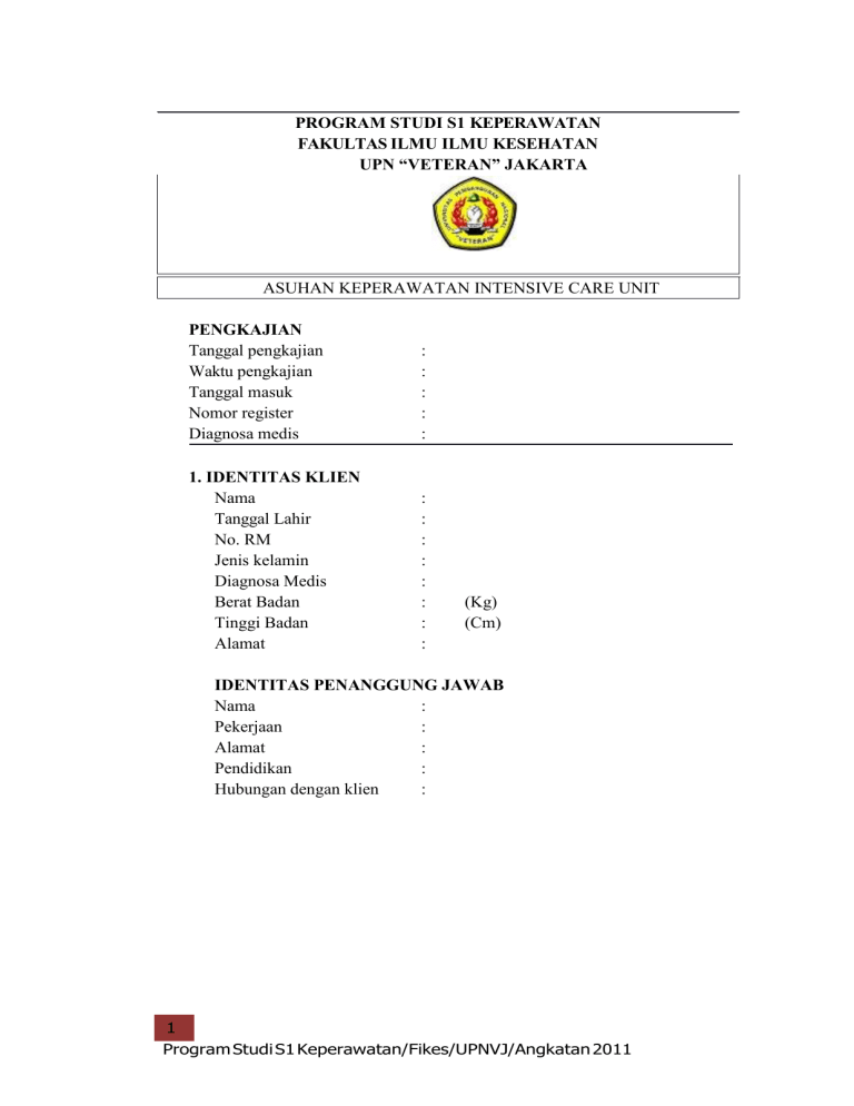 PROGRAM STUDI S1 KEPERAWATAN FAKULTAS ILMU ILMU KESEHATAN UPN “VETERAN” JAKARTA ASUHAN KEPERAWATAN INTENSIVE CARE UNIT PENGKAJIAN Tanggal pengkajian Waktu pengkajian Tanggal masuk Nomor register Diagnosa medis : : : : : 1. IDENTITAS KLIEN Nama Tanggal Lahir No. RM Jenis kelamin Diagnosa Medis Berat Badan Tinggi Badan Alamat : : : : : : : : (Kg) (Cm) IDENTITAS PENANGGUNG JAWAB Nama : Pekerjaan : Alamat : Pendidikan : Hubungan dengan klien : 1 Program Studi S1 Keperawatan/Fikes/UPNVJ/Angkatan 2011 Nama No.RM : : Kesadaran : GCS : TTL : Jenis Kelamin : L/P CM Eye Apatis : PENGKAJIAN 1. Airway / Jalan Nafas Bersih Sumbatan (berupa) : Konsistensi 2. Somnolen Motorik : sputum kuning Kental Darah : Breathing / Pernapasan Sesak Penggunaan otot bantu nafas Jenis pernapasan : : : Soporous/Koma Verbal : putih hijau Tidak kental Ya Ya Spontan Tidak Tidak Kusmaul Terpasang patensi jalan nafas : Cheynestokes Gudel ETT Irama Kedalaman Suara nafas : : : Teratur Dalam Vesikuler Tidak teratur Tidak dalam Ronchi Nyeri saat bernapas 3. Circulation / sirkulasi a.Perifer Nadi Pulsasi Distensi vena jugularis Kanan : Wheezing Ya Rales Tidak : : x/menit kuat lemah : ada tidak ada Kiri Akral Warna kulit sianosis Pengisian kapiler Edema Tangan : : : ada hangat kemerahan tidak ada : : dingin pucat / detik ya tidak 2 Program Studi S1 Keperawatan/Fikes/UPNVJ/Angkatan 2011 Kaki b. Jantung Irama EKG Nyeri dada Bunyi jantung c.Perdarahan Area perdarahan Jumlah 4. : ya tidak : : : : : : teratur ya murmur ya tidak teratur tidak gallop tidak cc/jam Drugs / obat obatan, Infus a.Macam obat ( pemberian obat yang sedang berlangsung ) b. Macam infus ( yang terpasang ) 5. Equipment ( peralatan yang terpasang ) 1) Infus : Ya Tidak 2) NGT 3) CVP 4) Catheter urine 5) Drain 6) Gelang identitas Tidak Tidak Tidak Tidak Tidak : : : : : Ya Ya Ya Ya Ya 3 Program Studi S1 Keperawatan/Fikes/UPNVJ/Angkatan 2011 (Tanggal pengkajian :…………………..Nama dan Paraf .................................. ) PENGKAJIAN KEPERAWATAN PASIEN ICU Nama : No. RM : Tgl. Lahir : Tgl : Jam : Sumber Data : Pasien Keluarga Tidak Ya, RS………. Diagnosis rujukan…….. Pendidikan Pasien : SD SMP SMA/SMK D3 S1 Lainnya…… Pekerjaan Pasien : Rujukan 1. : PEMERIKSAAN FISIK a. Sistem Pernapasan Jalan Nafas : Bersih Sumbatan (Berupa Pernapasan RR ................................................ x/menit Penggunaan otot bantu nafas : Terpasang ETT : Terpasang Ventilator : Mode : ……… TV…… FiO2………….. Irama : Kedalaman : Sputum : Konsistensi : Suara Napas Vesikuler b. System kardiovaskuler : Sirkulasi perifer Nadi Pulsasi Akral Warna kulit Lainnya……. Puskesmas………. Sputum Ya Tidak Ya Tidak Ya Tidak RR…. PEEP…… Darh) I:E ........ Tidak Teratur Teratur Tidak Teratur Teratur Putih Kuning Hijau Tidak kental Kental : Ronchi Wheezing : ……….x/mnt : : : Tekanan darah : Kuat Lemah Hangat Dingin Kemerahan 4 Program Studi S1 Keperawatan/Fikes/UPNVJ/Angkatan 2011 Pucat Dokter……. Cyanosis Sirkulasi jantung Irama Nyeri dada Perdarahan …… : Tidak teratur : : Tidak Tidak Teratur Ya, Lama : ……………. Ya, Area perdarahan : Jumlah ............. cc/ jam c. System saraf pusat Kesadaran d. e. f. g. h. Composmentis Apatis Somnolent Soporo Soporocoma Koma GCS : ……..Eye : ……. Motorik :……. Verbal : ……. Kekuatan otot : ………………………………………………………….. System gastrointestinal Distensi : Tidak Ya, Lingkar perut ............... cm Peristaltic : Tidak Ya, Lama .................... x/ mnt Defekasi : Tidak Normal Normal System perkemihan Warna : Bening Kuning Merah Kecoklatan Distensi : Tidak Ya Penggunaan catheter urine : Tidak Ya Jumlah urine : Tidak Ya Obstetric & ginekologi Hamil : Tidak Ya, HPHT : ........... Keluhan : System hematologi Perdarahan : Gusi Nassal Pethecia Echimosis Liainya …………………. System musculoskeletal & integumet Turgor Kulit : Tidak Elastis Elastis Terdapat luka : : Tidak Ya, Lokasi Luka : …… 5 Program Studi S1 Keperawatan/Fikes/UPNVJ/Angkatan 2011 Lokasi Luka / Lesi lain : Fraktur : Tidak Ya, Lokasi fraktur Kesulitan bergerak : Tidak Ya Penggunaan alat bantu : Tidak Ya, nama alat i. Alat invasive yang digunakan Drain/ WSD : Tidak Ya, Warna.. Jumlah… ................ cc/jam Drain kepala : Tidak Ya, Warna.. Jumlah… ................ cc/jam IV Line : Tidak Ya, Warna.. NGT : Tidak Ya, WarnaJumlah… . .............................. cc/jam DLL…………………………………………......................................... 2. RIWAYAT PSIKOSOSIAL DAN SPIRITUAL a. Pikososial Komunitas yang diikuti : …………………………………………………… b. 3. Koping : Afek : HDR : Rasa bersalah Persepsi penyakit : Menerima Hubungan keluarga harmonis : Tidak ……… Menerima Kehilangan Gelisah Tegang Emosional Menolak Mandiri Insomnia Depresi Tidak berdaya Menolak Ya, orang terdekat : Spsiritual Kebiasaan keluarga/ pasien untuk mengatasi stress dari spiritual…………….. KEBUTUHAN EDUKASI 6 Program Studi S1 Keperawatan/Fikes/UPNVJ/Angkatan 2011 a. Terdapat hambatan dala pembelajaran : Tidak Ya, Jika Ya : Pendengaran Penglihatan Kognitif Fisik Budaya Emosi Bahasa Lainya…………… Dibutuhkan penerjemah : Tidak Ya, Sebutkan …………………………… Kebutuhan edukasi ( pilih topic edukasi pada kotak yang tersedia ) Diagnosa dan manajemen penyakit Obat obatan / Terapi Diet dan nutrisi Tindakan Keperawatan Rehabilitasi Manajemen Nyeri Lain lain, Sebutkan …………………………………………………………………. b. Bersedia untuk dikunjungi : Tidak Ya : Keluarga Kerabat Rohaniawan 4. Risiko cedera / jatuh ( isi formulir monitoring pencegahan jatuh ) Tidak Ya, Jika Ya, gelang resiko jatuh warna kuning harus dipasang 5. Status fungsional ( isi formulir monitoring barthel index) Aktivitas dan mobilisasi : Mandiri perlu bantuan, sebutkan………………….. Alat bantu jalan, sebutkan ………………