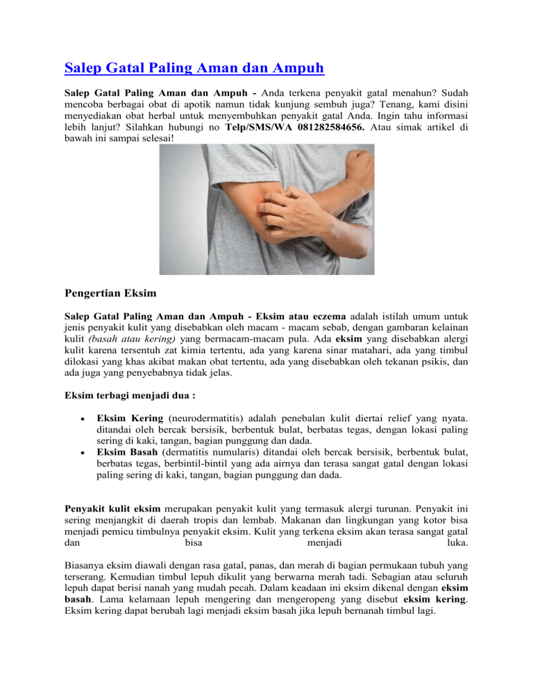 Salep Gatal Paling Aman dan Ampuh Salep Gatal Paling Aman dan Ampuh - Anda terkena penyakit gatal menahun? Sudah mencoba berbagai obat di apotik namun tidak kunjung sembuh juga? Tenang, kami disini menyediakan obat herbal untuk menyembuhkan penyakit gatal Anda. Ingin tahu informasi lebih lanjut? Silahkan hubungi no Telp/SMS/WA 081282584656. Atau simak artikel di bawah ini sampai selesai! Pengertian Eksim Salep Gatal Paling Aman dan Ampuh - Eksim atau eczema adalah istilah umum untuk jenis penyakit kulit yang disebabkan oleh macam - macam sebab, dengan gambaran kelainan kulit (basah atau kering) yang bermacam-macam pula. Ada eksim yang disebabkan alergi kulit karena tersentuh zat kimia tertentu, ada yang karena sinar matahari, ada yang timbul dilokasi yang khas akibat makan obat tertentu, ada yang disebabkan oleh tekanan psikis, dan ada juga yang penyebabnya tidak jelas. Eksim terbagi menjadi dua : Eksim Kering (neurodermatitis) adalah penebalan kulit diertai relief yang nyata. ditandai oleh bercak bersisik, berbentuk bulat, berbatas tegas, dengan lokasi paling sering di kaki, tangan, bagian punggung dan dada. Eksim Basah (dermatitis numularis) ditandai oleh bercak bersisik, berbentuk bulat, berbatas tegas, berbintil-bintil yang ada airnya dan terasa sangat gatal dengan lokasi paling sering di kaki, tangan, bagian punggung dan dada. Penyakit kulit eksim merupakan penyakit kulit yang termasuk alergi turunan. Penyakit ini sering menjangkit di daerah tropis dan lembab. Makanan dan lingkungan yang kotor bisa menjadi pemicu timbulnya penyakit eksim. Kulit yang terkena eksim akan terasa sangat gatal dan bisa menjadi luka. Biasanya eksim diawali dengan rasa gatal, panas, dan merah di bagian permukaan tubuh yang terserang. Kemudian timbul lepuh dikulit yang berwarna merah tadi. Sebagian atau seluruh lepuh dapat berisi nanah yang mudah pecah. Dalam keadaan ini eksim dikenal dengan eksim basah. Lama kelamaan lepuh mengering dan mengeropeng yang disebut eksim kering. Eksim kering dapat berubah lagi menjadi eksim basah jika lepuh bernanah timbul lagi. Harga Rp 295.000 Informasi lebih lanjut hubungi Telp/SMS/WA 081282584656 Apa Saja Gejala Eksim? Salep Gatal Paling Aman dan Ampuh - Dimanapun lokasi timbulnya eksim, gejala utama yang dirasakan pasien adalah gatal. Terkadang rasa gatal sudah muncul sebelum ada tanda kemerahan pada kulit. Gejala kemerahan biasanya akan muncul pada wajah, lutut, tangan dan kaki, namun tidak menutup kemungkinan kemerahan muncul di daerah lain. Daerah yang terkena akan terasa sangat kering, menebal atau keropeng. Pada orang kulit putih, daerah ini pada mulanya akan berwarna merah muda lalu berubah menjadi cokelat. Sementara itu pada orang dengan kulit lebih gelap, eksim akan mempengaruhi pigmen kulit sehingga daerah eksim akan tampak lebih terang atau lebih gelap. Apa yang Menjadi Penyebab Eksim Salep Gatal Paling Aman dan Ampuh - Penyebab dari eksim sebenarnya belum diketahui dengan pasti, namun beberapa ahli mencurigai eksim berhubungan dengan aktifitas daya pertahanan tubuh (imun) yang berlebihan. Hal ini menyebabkan tubuh mengalami reaksi berlebihan terhadap bakteri atau iritan yang sebenarnya tidak berbahaya pada kulit. Oleh karena itu, eksim banyak ditemukan pada keluarga dengan riwayat penyakit alergi atau asma. Tiap tiap orang mempunyai pencetus eksim yang berbeda beda. Ada orang yang setelah memegang sabun atau deterjen akan merasakan gatal yang luar biasa, ada pula yang disebabkan oleh bahan atau alat rumah tangga yang lain. Gejala yang timbul pun bervariasi, ada yang gatalnya ringan tetapi rasa panas yang dominan, ada pula yang sebaliknya. Infeksi saluran nafas bagian atas atau flu juga bisa menjadi pencetus timbulnya eksim. Stress yang dialami penderita akan membuat gejala menjadi lebih buruk. Jenis – Jenis Penyakit Gatal Eksim : 1. Dermatitis atopik : salah satu jenis eksim yang paling sering dijumpai dan merupakan penyakit turunan. Dermatitis atopik umumnya dimulai ketika bayi dan masih anakanak dengan gejala berupa gatal, radang kulit, dan pada sebagian penderita sering timbul asma dan demam hay (hay fever). 2. Dermatitis kontak : meliputi dermatitis kontak alergik dan iritan. Dermatitis kontak alergik disebabkan oleh reaksi kekebalan tertunda (delayed immune system) akibat kontak kulit dengan senyawa alergenik sehingga menyebabkan radang kulit dalam 48 jam setelah paparan terjadi. Beberapa agen penyebab eksim jenis ini adalah jelatang, parfum, pengawet kosmetik, metal, dan pewarna. 3. Dermatitis kontak iritan terjadi karena paparan senyawa iritan yang dapat merusak kulit secara kimiawi, contohnya sabun keras, detergen, dan produk pembersih lainnya. Senyawa iritan tersebut dapat menghilangkan minyak dan kelembaban dari lapisan luar kulit, kemudian merusak lapisan pelindung dan memicu terjadinya peradangan. 4. Eksim numular : beberapa plak eksim yang biasanya berhubungan dengan kulit kering dan terjadi pada bagian luar dari kaki, tangan, dan lengan. 5. Eksim stasis : jenis eksim kronis pada daerah bawah kaki bagian dalam yang berkaitan dengan varises. Pertanyaan yang sering terpikirkan di benak Anda : Jika Saya terlanjur kena penyakit eksim, bagaimana cara mengobatinya? Bagaimana cara mengobati penyakit eksim dengan cepat dan tuntas? Bagaimana berobat yang mudah tanpa perlu malu untuk ke dokter? Jawabannya: semua bisa, asal Anda memilih produk yang tepat, yaitu Eximtas, Kapsul BD De Nature dan Salep Exclear. Pengobatan Penyakit Eksim Salep Gatal Paling Aman dan Ampuh - Pengobatan Eksim secara tradisional yaitu dengan menggunakan Obat Eksim dari De Nature. Produk yang terbuat dari bahan herbal alami diramu dengan resep tradisional dan diolah secara teknologi modern, sehingga aman di konsumsi. Jadi anda juga tak perlu khawatir karena Obat Herbal De Nature yang kami tawarkan ini, Alhamdulillah, merupakan obat yang telah banyak menyembuhkan penderitanya baik dari dalam maupun luar negeri. Sudah banyak pasien kami yang merasakan kesembuhannya dengan mengonsumsi o