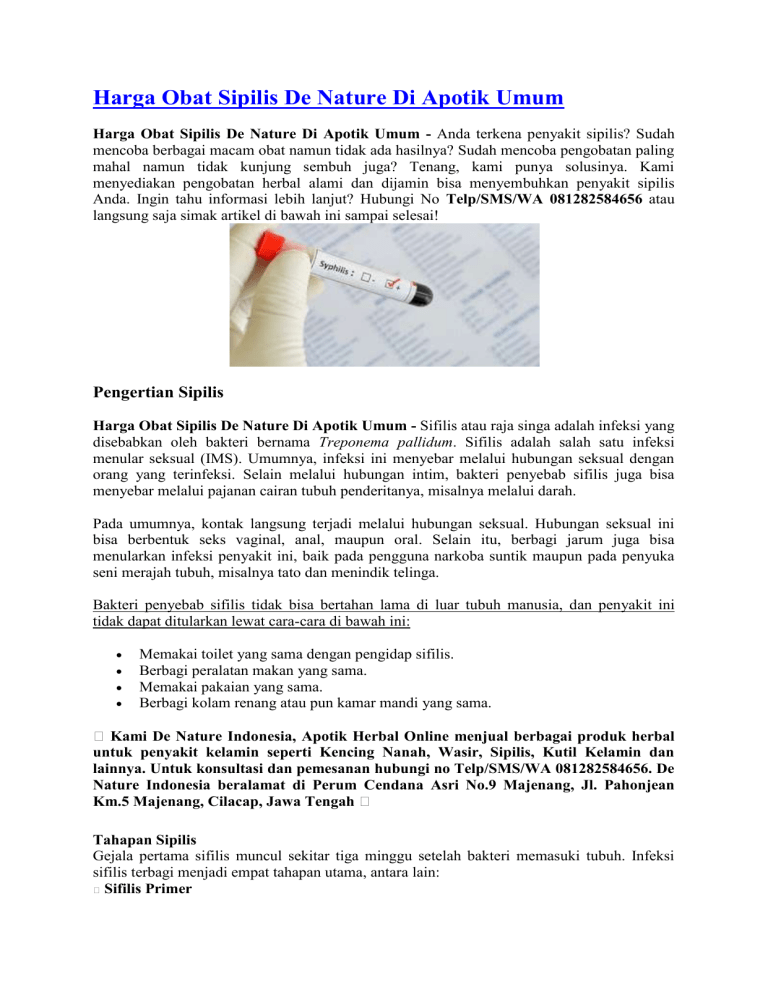 Harga Obat Sipilis De Nature Di Apotik Umum Harga Obat Sipilis De Nature Di Apotik Umum - Anda terkena penyakit sipilis? Sudah mencoba berbagai macam obat namun tidak ada hasilnya? Sudah mencoba pengobatan paling mahal namun tidak kunjung sembuh juga? Tenang, kami punya solusinya. Kami menyediakan pengobatan herbal alami dan dijamin bisa menyembuhkan penyakit sipilis Anda. Ingin tahu informasi lebih lanjut? Hubungi No Telp/SMS/WA 081282584656 atau langsung saja simak artikel di bawah ini sampai selesai! Pengertian Sipilis Harga Obat Sipilis De Nature Di Apotik Umum - Sifilis atau raja singa adalah infeksi yang disebabkan oleh bakteri bernama Treponema pallidum. Sifilis adalah salah satu infeksi menular seksual (IMS). Umumnya, infeksi ini menyebar melalui hubungan seksual dengan orang yang terinfeksi. Selain melalui hubungan intim, bakteri penyebab sifilis juga bisa menyebar melalui pajanan cairan tubuh penderitanya, misalnya melalui darah. Pada umumnya, kontak langsung terjadi melalui hubungan seksual. Hubungan seksual ini bisa berbentuk seks vaginal, anal, maupun oral. Selain itu, berbagi jarum juga bisa menularkan infeksi penyakit ini, baik pada pengguna narkoba suntik maupun pada penyuka seni merajah tubuh, misalnya tato dan menindik telinga. Bakteri penyebab sifilis tidak bisa bertahan lama di luar tubuh manusia, dan penyakit ini tidak dapat ditularkan lewat cara-cara di bawah ini: Memakai toilet yang sama dengan pengidap sifilis. Berbagi peralatan makan yang sama. Memakai pakaian yang sama. Berbagi kolam renang atau pun kamar mandi yang sama. � Kami De Nature Indonesia, Apotik Herbal Online menjual berbagai produk herbal untuk penyakit kelamin seperti Kencing Nanah, Wasir, Sipilis, Kutil Kelamin dan lainnya. Untuk konsultasi dan pemesanan hubungi no Telp/SMS/WA 081282584656. De Nature Indonesia beralamat di Perum Cendana Asri No.9 Majenang, Jl. Pahonjean Km.5 Majenang, Cilacap, Jawa Tengah � Tahapan Sipilis Gejala pertama sifilis muncul sekitar tiga minggu setelah bakteri memasuki tubuh. Infeksi sifilis terbagi menjadi empat tahapan utama, antara lain: � Sifilis Primer Penderita sifilis mengalami gejala yang dimulai dengan lesi atau luka pada alat kelamin atau di dalam dan di sekitar mulut. Luka yang terjadi berbentuk seperti gigitan serangga tapi tidak menimbulkan rasa sakit. Pada tahap ini, jika orang yang terinfeksi berhubungan seksual dengan orang lain, penularan sangat mudah terjadi. Luka ini bertahan selama 1-2 bulan. Pada akhirnya, lesi ini akan sembuh tanpa meninggalkan bekas. � Sifilis Sekunder Penderita sifilis sekunder akan mengalami ruam merah serukuran koin kecil dan biasanya ruam ini muncul pada telapak tangan dan telapak kaki. Gejala lain yang mungkin muncul adalah demam, nafsu makan menurun, radang tenggorokan dan kutil kelamin. Fase ini bisa bertahan selama satu hingga tiga bulan. � Sifilis Laten Setelah fase sifilis sekunder, sifilis seakan-akan menghilang dan tidak menimbulkan gejala sama sekali. Masa laten ini bisa bertahan sekitar dua tahun sebelum kemudian lanjut ke masa yang paling berbahaya dalam infeksi sifilis yaitu sifilis tersier. � Sifilis Tersier Jika infeksi tidak terobati, sifilis akan berkembang ke tahapan akhir, yaitu sifilis tersier. Pada tahap ini, infeksi bisa memberi efek yang serius pada tubuh. Beberapa akibat dari infeksi pada tahapan ini adalah kelumpuhan, kebutaan, demensia, masalah pendengaran, impotensi, dan bahkan kematian jika tidak ditangani. Sifilis paling mudah menular pada fase sifilis primer dan sekunder. Jika Anda merasa terinfeksi sifilis, segera periksakan diri ke dokter atau klinik spesialis penyakit kelamin untuk memastikan diagnosis terhadap sifilis. Makin cepat sifilis diobati, makin kecil kemungkinan sifilis berkembang menjadi penyakit yang serius. GEJALA ATAU TANDA PENYAKIT SIPILIS Harga Obat Sipilis De Nature Di Apotik Umum - Penyakit sipilis bisa menyebabkan kerusakan organ-organ tubuh. Kerusakan tersebut bisa menimpa syaraf, otak, otot, tulang, mata, serta organ bagian tubuh yang lainnya. Bahkan, jika sudah stadium lajut penyakit ini dapat menyebabkan kematian pada si penderita.Penyakit kelamin yang satu ini memang tidak boleh dianggap remeh. Perlu Anda ketahui bahwa penyakit ini akan menggerogoti sistem kekebalan tubuh penderita sehingga tubuh si penderita akan sangat mudah terkena penyakit dan bertambah parah karena infeksi dari bakteri penyebab penyakit ini menyebar keseluruh tubuh dengan cepat. Untuk itu sebaiknya kita dapat mengenali tanda-tanda penyakit kelamin ini melalui gejala yang muncul. Informasi lebih lanjut hubungi Telp/SMS/WA 081282584656 Gejala/Tanda Penyakit Sipilis Pada Wanita 1. Keluarnya cairan tidak normal dari saluran kencing atau liang senggama 2. Timbulnya keputihan yang banyak, berbau amis, dan warnanya cenderung putih kehijauan. 3. Rasa nyeri ketika buang air kecil 4. Rasa nyeri saat berhubungan seksual 5. Timbulnya rasa gatal di alat kelamin atau sekitarnya dan menjadi luka koreng di kelamin. 6. Timbulnya luka kecil (terkadang tidak terasa sakit) disertai pembengkakan kelenjar getah bening. 7. Terjadinya perubahan warna kulit dan mata komplikasi bartolitis, yaitu membengkaknya kelenjar Bartholin mengakibatkan kesulitan berjalan karena rasa nyeri. Gejala/Tanda Penyakit Sipilis Pada Pria Sering nyeri selama hubungan seksual. Nyeri ketika buang air kecil. Keluarnya cairan atau kotoran dari penis laki-laki. Ada luka kerongkongan pada orang-orang melakukan oral sek, sehingga kerongkongan sering terasa sakit. Nyeri pada daerah sekitar anus (hal ini terjadi pada orang-orang melakukan anal sex). Luka memerah tanpa rasa sakit pada daerah kelamin, anus, kerongkongan dan atau lidah. Bintik merah pada kulit dan menjadi luka koreng di kelamin. Timbulnya bersisik pada telapak tangan dan telapak kaki. Urine (air kencing) berwarna cenderung gelap, feses berwarna terang. Mata dan kulit cendrung berwarna kuning. Timbulnya bentuk lepuh kecil pada daerah kelamin, dimana itu bisa berubah menjadi koreng.