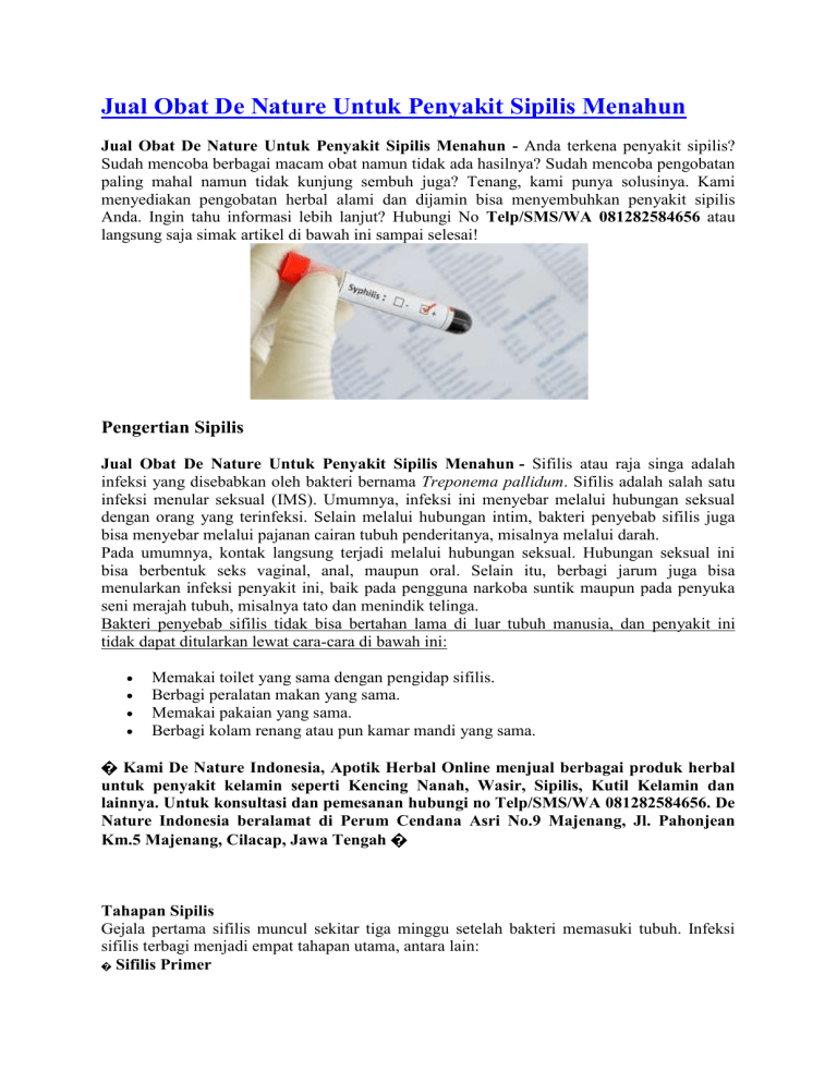 Jual Obat De Nature Untuk Penyakit Sipilis Menahun Jual Obat De Nature Untuk Penyakit Sipilis Menahun - Anda terkena penyakit sipilis? Sudah mencoba berbagai macam obat namun tidak ada hasilnya? Sudah mencoba pengobatan paling mahal namun tidak kunjung sembuh juga? Tenang, kami punya solusinya. Kami menyediakan pengobatan herbal alami dan dijamin bisa menyembuhkan penyakit sipilis Anda. Ingin tahu informasi lebih lanjut? Hubungi No Telp/SMS/WA 081282584656 atau langsung saja simak artikel di bawah ini sampai selesai! Pengertian Sipilis Jual Obat De Nature Untuk Penyakit Sipilis Menahun - Sifilis atau raja singa adalah infeksi yang disebabkan oleh bakteri bernama Treponema pallidum. Sifilis adalah salah satu infeksi menular seksual (IMS). Umumnya, infeksi ini menyebar melalui hubungan seksual dengan orang yang terinfeksi. Selain melalui hubungan intim, bakteri penyebab sifilis juga bisa menyebar melalui pajanan cairan tubuh penderitanya, misalnya melalui darah. Pada umumnya, kontak langsung terjadi melalui hubungan seksual. Hubungan seksual ini bisa berbentuk seks vaginal, anal, maupun oral. Selain itu, berbagi jarum juga bisa menularkan infeksi penyakit ini, baik pada pengguna narkoba suntik maupun pada penyuka seni merajah tubuh, misalnya tato dan menindik telinga. Bakteri penyebab sifilis tidak bisa bertahan lama di luar tubuh manusia, dan penyakit ini tidak dapat ditularkan lewat cara-cara di bawah ini: Memakai toilet yang sama dengan pengidap sifilis. Berbagi peralatan makan yang sama. Memakai pakaian yang sama. Berbagi kolam renang atau pun kamar mandi yang sama. � Kami De Nature Indonesia, Apotik Herbal Online menjual berbagai produk herbal untuk penyakit kelamin seperti Kencing Nanah, Wasir, Sipilis, Kutil Kelamin dan lainnya. Untuk konsultasi dan pemesanan hubungi no Telp/SMS/WA 081282584656. De Nature Indonesia beralamat di Perum Cendana Asri No.9 Majenang, Jl. Pahonjean Km.5 Majenang, Cilacap, Jawa Tengah � Tahapan Sipilis Gejala pertama sifilis muncul sekitar tiga minggu setelah bakteri memasuki tubuh. Infeksi sifilis terbagi menjadi empat tahapan utama, antara lain: � Sifilis Primer Penderita sifilis mengalami gejala yang dimulai dengan lesi atau luka pada alat kelamin atau di dalam dan di sekitar mulut. Luka yang terjadi berbentuk seperti gigitan serangga tapi tidak menimbulkan rasa sakit. Pada tahap ini, jika orang yang terinfeksi berhubungan seksual dengan orang lain, penularan sangat mudah terjadi. Luka ini bertahan selama 1-2 bulan. Pada akhirnya, lesi ini akan sembuh tanpa meninggalkan bekas. � Sifilis Sekunder Penderita sifilis sekunder akan mengalami ruam merah serukuran koin kecil dan biasanya ruam ini muncul pada telapak tangan dan telapak kaki. Gejala lain yang mungkin muncul adalah demam, nafsu makan menurun, radang tenggorokan dan kutil kelamin. Fase ini bisa bertahan selama satu hingga tiga bulan. � Sifilis Laten Setelah fase sifilis sekunder, sifilis seakan-akan menghilang dan tidak menimbulkan gejala sama sekali. Masa laten ini bisa bertahan sekitar dua tahun sebelum kemudian lanjut ke masa yang paling berbahaya dalam infeksi sifilis yaitu sifilis tersier. � Sifilis Tersier Jika infeksi tidak terobati, sifilis akan berkembang ke tahapan akhir, yaitu sifilis tersier. Pada tahap ini, infeksi bisa memberi efek yang serius pada tubuh. Beberapa akibat dari infeksi pada tahapan ini adalah kelumpuhan, kebutaan, demensia, masalah pendengaran, impotensi, dan bahkan kematian jika tidak ditangani. Sifilis paling mudah menular pada fase sifilis primer dan sekunder. Jika Anda merasa terinfeksi sifilis, segera periksakan diri ke dokter atau klinik spesialis penyakit kelamin untuk memastikan diagnosis terhadap sifilis. Makin cepat sifilis diobati, makin kecil kemungkinan sifilis berkembang menjadi penyakit yang serius. GEJALA ATAU TANDA PENYAKIT SIPILIS Jual Obat De Nature Untuk Penyakit Sipilis Menahun - Penyakit sipilis bisa menyebabkan kerusakan organ-organ tubuh. Kerusakan tersebut bisa menimpa syaraf, otak, otot, tulang, mata, serta organ bagian tubuh yang lainnya. Bahkan, jika sudah stadium lajut penyakit ini dapat menyebabkan kematian pada si penderita.Penyakit kelamin yang satu ini memang tidak boleh dianggap remeh. Perlu Anda ketahui bahwa penyakit ini akan menggerogoti sistem kekebalan tubuh penderita sehingga tubuh si penderita akan sangat mudah terkena penyakit dan bertambah parah karena infeksi dari bakteri penyebab penyakit ini menyebar keseluruh tubuh dengan cepat. Untuk itu sebaiknya kita dapat mengenali tandatanda penyakit kelamin ini melalui gejala yang muncul. Informasi lebih lanjut hubungi Telp/SMS/WA 081282584656 Gejala/Tanda Penyakit Sipilis Pada Wanita 1. Keluarnya cairan tidak normal dari saluran kencing atau liang senggama 2. Timbulnya keputihan yang banyak, berbau amis, dan warnanya cenderung putih kehijauan. 3. Rasa nyeri ketika buang air kecil 4. Rasa nyeri saat berhubungan seksual 5. Timbulnya rasa gatal di alat kelamin atau sekitarnya dan menjadi luka koreng di kelamin. 6. Timbulnya luka kecil (terkadang tidak terasa sakit) disertai pembengkakan kelenjar getah bening. 7. Terjadinya perubahan warna kulit dan mata komplikasi bartolitis, yaitu membengkaknya kelenjar Bartholin mengakibatkan kesulitan berjalan karena rasa nyeri. Gejala/Tanda Penyakit Sipilis Pada Pria Sering nyeri selama hubungan seksual. Nyeri ketika buang air kecil. Keluarnya cairan atau kotoran dari penis laki-laki. Ada luka kerongkongan pada orang-orang melakukan oral sek, sehingga kerongkongan sering terasa sakit. Nyeri pada daerah sekitar anus (hal ini terjadi pada orang-orang melakukan anal sex). Luka memerah tanpa rasa sakit pada daerah kelamin, anus, kerongkongan dan atau lidah. Bintik merah pada kulit dan menjadi luka koreng di kelamin. Timbulnya bersisik pada telapak tangan dan telapak kaki. Urine (air kencing) berwarna cenderung gelap, feses berwarna terang. Mata dan kulit cendrung berwarna kuning. Timbulnya bentuk lepuh kecil pada daerah kelamin, dimana itu b