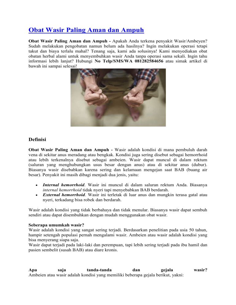 Obat Wasir Paling Aman dan Ampuh Obat Wasir Paling Aman dan Ampuh - Apakah Anda terkena penyakit Wasir/Ambeyen? Sudah melakukan pengobatan namun belum ada hasilnya? Ingin melakukan operasi tetapi takut dan biaya terlalu mahal? Tenang saja, kami ada solusinya! Kami menyediakan obat obatan herbal alami untuk menyembuhkan wasir Anda tanpa operasi sama sekali. Ingin tahu informasi lebih lanjut? Hubungi No Telp/SMS/WA 081282584656 atau simak artikel di bawah ini sampai selesai! Definisi Obat Wasir Paling Aman dan Ampuh - Wasir adalah kondisi di mana pembuluh darah vena di sekitar anus meradang atau bengkak. Kondisi juga sering disebut sebagai hemorrhoid atau lebih terkenalnya disebut sebagai ambeien. Wasir dapat muncul di dalam rektum (saluran yang menghubungkan usus besar dengan anus) atau di sekitar anus (dubur). Biasanya wasir disebabkan karena sering dan kelamaan mengejan saat BAB (buang air besar). Penyakit ini masih dibagi menjadi dua jenis, yaitu: Internal hemorrhoid. Wasir ini muncul di dalam saluran rektum Anda. Biasanya internal hemorrhoid tidak nyeri tapi menyebabkan BAB berdarah. External hemorrhoid. Wasir ini terletak di luar anus dan mungkin terasa gatal atau nyeri, terkadang bisa robek dan berdarah. Wasir adalah kondisi yang tidak berbahaya dan tidak menular. Biasanya wasir dapat sembuh sendiri atau dapat disembuhkan dengan mudah menggunakan obat wasir. Seberapa umumkah wasir? Wasir adalah kondisi yang sangat sering terjadi. Berdasarkan penelitian pada usia 50 tahun, hampir setengah populasi pernah mengalami wasir. Ambeien atau wasir adalah kondisi yang bisa menyerang siapa saja. Wasir dapat terjadi pada laki-laki dan perempuan, tapi lebih sering terjadi pada ibu hamil dan pasien sembelit (susah BAB) atau diare kronis. Apa saja tanda-tanda dan gejala Ambeien atau wasir adalah kondisi yang memiliki beberapa gejala berikut, yakni: wasir? BAB berdarah berwarna merah terang dan tidak nyeri Gatal dan iritasi pada area rektum Nyeri dan rasa tidak nyaman Bengkak di sekitar anus Benjolan yang sensitif atau nyeri di dekat anus Kondisi ambeien yang yang lebih sering menyebabkan rasa tidak nyaman dan nyeri yaitu external hemorrhoid. Internal hemorrhoid biasanya tidak menyebabkan rasa nyeri. Kemungkinan ada tanda-tanda dan gejala yang tidak disebutkan di atas. Bila Anda memiliki kekhawatiran akan sebuah gejala tertentu, konsultasikanlah dengan dokter Anda. Penyebab Penyebab wasir yaitu pembengkakan pembuluh darah vena. Pembengkakan bisa terjadi akibat meningkatnya tekanan di rektum bagian bawah. Faktor yang meningkatkan tekanan tersebut yaitu: Mengejan saat BAB Duduk terlalu lama Diare atau sembelit kronis Berat badan berlebih atau obesitas Hamil Kurang asupan makanan berserat Faktor-faktor risiko Wasir disebabkan oleh bengkaknya pembuluh darah vena akibat peningkatan tekanan di rektum bagian bawah. Faktor-faktor yang bisa menjadi penyebab wasir antara lain: 1. Sembelit kronis. Feses yang mengeras akibat sembelit membuat Anda harus mengeluarkan tenaga lebih banyak untuk mengejan. Tekanan ekstra tersebut akhirnya bisa memicu pembengkakan pembuluh darah di anus, menjadi penyebab wasir. 2. Kehamilan. Seiring usia kehamilan yang semakin membesar, rahim akan ikut berkembang mengikuti perkembangan janin. Tekanan rahim ini kemudian akan menekan pembuluh darah yang ada di usus besar hingga memicu munculnya benjolan di daerah anus. 3. Duduk terlalu lama. Kebiasaan duduk yang terlalu lama bisa menjadi penyebab wasir, sebab pembuluh darah di sekitar anus akan banyak terisi darah. Aliran darah yang konstan tersebut akhirnya akan menekan dinding pembuluh darah hingga semakin membesar. 4. Mengangkat benda berat. Berulang kali mengangkat benda yang berat bisa jadi penyebab wasir karena adanya penumpukan tekanan di bagian rektum yang akan memengaruhi aliran darah dan membuat pembuluh darah menjadi bengkak. 5. Usia. Kondisi tubuh yang semakin menua secara alami menyebabkan jaringan pembuluh darah di sekitar rektum dan anus semakin melemah dan meregang, sehingga rentan membengkak. Inilah yang akhirnya jadi penyebab wasir. Untuk Konsultasi dan Pemesanan Obat Hubungi No Telp/SMS/WA 081282584656 Siapa saja yang berisiko kena wasir? Ada banyak faktor risiko untuk wasir, yaitu: Memiliki pekerjaan yang mengharuskan Anda duduk atau berdiri dalam waktu yang lama. Mengalami diare atau sembelit kronis. Anda mengalami obesitas. Ibu hamil. Sering melakukan seks anal, yakni penetrasi lewat anus. Konsumsi makanan tinggi lemak dan rendah serat. Tingkatan Stadium Wasir Atau Sakit Ambeien Pada Ibu Hamil Wasir stadium 1 : Wasir Jenis ini Biasanya tidak Sampai prolaps. Rasanya Cuma kadang Kurang Nyaman Saat Buang Air Besar. Ambeien stadium 2 : bagian anus sudah bisa diraba ada benjolan, namun biasanya belum ada pendarahan. kadang ada rasa panas dan gatal Wasir stadium 3 : benjolan pada anus sudah besar dan susah masuk lagi harus dibantu dengan jari Ambeien stadium 4 : benjolan vena sudah besar sekali dan sering pendarahan, Obat ambeien alami Pertanyaan yang sering terpikirkan di benak Anda : Jika Saya terlanjur kena wasir bagaimana cara mengobatinya? Bagaimana cara mengobati wasir dengan cepat dan tuntas? Bagaimana berobat yang mudah tanpa perlu malu untuk ke dokter dan tanpa operasi? Jawabannya: semua bisa, asal Anda memilih produk yang tepat, yaitu Ambejoss dan Salep Salwa De Nature. Harga Rp 275.000 Anda ingin sembuh dari wasir? Segera hubungi tlp/sms/whatsapp : 081282584656 Sekedar informasi untuk kenyamanan Konsumen, bahwa Produk dari perusahaan kami ini sudah memiliki: Ijin Resmi Perusahaan dari Kementerian Kesehatan Ijin BPOM, yang artinya sudah lulus uji stabilitas Produk Sertifikat Halal MUI, sehingga halal bisa dipertanggungjawabkan Apoteker yang sudah berpengalaman Sudah melewati Proses Sortir Bahan Baku, Guna Menjaga Mutu Produk Proses Produksi Sesuai Alur CPOTB (Cara Pembuatan Obat Tradisional Yang Baik Dan Benar) Cara Pemesanan Pembayaran terlebih dulu via transfer Bank, setelah transfer SMS-kan konfirmasinya un