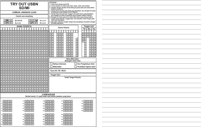 PETIJNJIJK: 1. lsilah hanya dengan pensil 28. 2. Lembarjawaban ini tidak boleh kotor, basah, robek, atau berlipat. 3. Jawaban denqan memberi Tanda Silang (X) pada salah satu kotak pilihan jawaban yang-benar. 4. Tulislah Nama Peserta Dada kotak vano disediakan. lalu silanolah (X) kotak di bawahnya sesuai dehgan huruf 6i af,asnya. 5. Tulislah Nomor Peserta dan Tanooal Lahir oada kolom vano disediakan. lalu silanglah (X) kotak di bawah-n-ya sesuai dengan anfka di atasnya. 6. t Silanglah (X) kotak pada kolom Nama Mata Ujian yang sedang diujikan. Tanssal t'iian' dan bubuhkan Tanda Tansan pada lili''lil.l;Tf,"to'':?5'L' sebersih mungkin dengan karet penghapus kemudian silanglah rnq benar. trtrtr trtrtr trtrtr trtrtr trtrtr trtr8 trtrtr trtrtr trtrtr trtr8 trtrtr EtrE trtrtr EEE trtrtr tr8tr trtrE trtrtr trtrtr trtrtr trtrtr EEE trtrtr trtrtr tr tr tr tr tr tr tr tr tr tr tr tr tr tr tr tr tr tr tr tr tr tr tr tr tr tr tr tr tr tr tr tr tr tr tr tr tr tr tr tr tr tr tr tr tr tr tr tr Nama Mata Ujian (Silanolah salah satu) ! Bahasa lndonesia ! Matematika Nama SD / Ml / SDLB Ianqqal Uiian I E llmu PengetahuanAlam Pendidikan Agama lslam : : Tanda Tangan Peserta JAWABAN Berilah tanda ( X ) pada salah satu pilihan jawaban yang benar 'Etrtrtr Etrtrtr .Etrtrtr .Etrtrtr .Etrtrtr .Etrtrtr 'Etrtrtr 'Etrtrtr 'Etrtrtr ,'..EEEE , .'E]E]E]E] EEEE ,'..EEEE ,', ,'.EEEE ,'. EEEE '. ,'' E]E]E]E] ,'' EEEE EEEE EEEE ,''.EEEE ,. ,'E]EE]E] trtrtrE * trEtrE -trtrtrE * trtrtrE ^,' trEtrE trEtrE * trtrtrE * trEtrE ., ,, EtrEE .'EE]E]E] . EEtrtr * EEtrtr -EEtrE * EEtrtr *EEtrE . EEtrtr * EEtrtr * * EEtrE EEEE 'EEtrtr *EEtrtr *EEtrtr *EEtrtr *EEtrtr