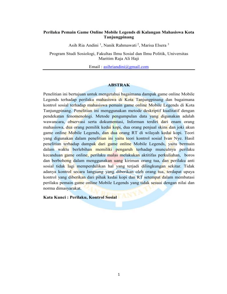 Perilaku Pemain Game Online Mobile Legends di Kalangan Mahasiswa Kota Tanjungpinang Asih Ria Andini 1, Nanik Rahmawati 2, Marisa Elsera 3 Program Studi Sosiologi, Fakultas Ilmu Sosial dan Ilmu Politik, Universitas Maritim Raja Ali Haji Email : [email protected] ABSTRAK Penelitian ini bertujuan untuk mengetahui bagaimana dampak game online Mobile Legends terhadap perilaku mahasiswa di Kota Tanjungpinang dan bagaimana kontrol sosial terhadap mahasiswa pemain game online Mobile Legends di Kota Tanjungpinang. Penelitian ini menggunakan metode deskriptif kualitatif dengan pendekatan fenomenologi. Metode pengumpulan data yang digunakan adalah wawancara, observasi serta dokumentasi, Informan terdiri dari enam orang mahasiswa, dua orang pemilik kedai kopi, dua orang penjual skins dan joki akun game online Mobile Legends, dan dua orang RT di wilayah kedai kopi. Teori yang digunakan dalam penelitian ini yaitu teori kontrol sosial Ivan Nye. Hasil penelitian terhadap dampak dari game online Mobile Legends, yaitu bermain dalam waktu berlebihan memiliki pengaruh terhadap munculnya perilaku kecanduan game online, perilaku malas melakukan aktitifas perkuliahan, boros dan berbohong dalam menggunakan uang kiriman orang tua, dan perilaku anti sosial tidak lagi memperdulikan hal yang terjadi dilingkungan sekitar. Tidak adanya kontrol secara langsung yang diberikan oleh orang tua, terdapat upaya kontrol yang diberikan dari pihak kedai kopi dan RT setempat dalam membatasi perilaku pemain game online Mobile Legends yang tidak sesuai dengan nilai dan norma dimasyarakat. Kata Kunci : Perilaku, Kontrol Sosial 1 PENDAHULUAN Perkembangan teknologi informasi dan komunikasi di Indonesia yaitu internet telah berkembang begitu pesat dan meluas. Tidak dapat dipungkiri, saat ini kehidupan umat manusia sangat bergantung dengan kemajuan teknologi internet, seperti di bidang ekonomi, sosial, dan budaya. Dengan adanya internet mempermudahkan masyarakat dalam berkomunikasi dengan teman atau saudara yang jauh, berkenalan dan menambah teman baru melalui media sosial seperti Facebook, Instagram, Twitter, dan masih banyak lagi media sosial lainnya. Teknologi internet juga mempermudah masyarakat untuk menjualkan produk mereka secara online, sebagai sarana menyalurkan ekspresi, sarana memperoleh eksistensi, hiburan, serta memperoleh informasi terbaru. Teknologi internet memberikan dampak yang besar dan beragam terhadap kehidupan manusia, salah satunya yang paling banyak digemari adalah dari segi hiburan. Masyarakat memiliki beragam cara untuk memenuhi kebutuhan akan hiburan, hiburan tak terbatas ruang waktu maupun usia yaitu seperti bermain, bermain memang merupakan salah satu hiburan yang menyenangkan dan merupakan kebutuhan yang sudah melekat dalam diri manusia serta tidak memandang batas usia, bermain menjadi salah satu alternatif aktivitas hiburan yang mudah dilakukan adalah bermain game di smartphone. Game saat ini memiliki berbagai macam permainannya, baik dimain kan secara offline maupun online. Namun dikalangan pelajar dan mahasiswa di Kota Tanjungpinang lebih menyukai permainan game online dibandingkan game 2 offline, karena keunggulan dari game online yaitu pemain dapat mengakses permainan secara langsung melalui sistem perusahaan game tersebut. Game online merupakan permainan yang dapat diakses oleh banyak pemain dari seluruh dunia dimana mesin-mesin yang digunakan pemain dihubungkan oleh suatu jaringan. Game online yang diakses dengan menggunakan paket internet dan dimainkan menggunakan handphone telah berkembang pesat di berbagai kalangan, salah satunya dikalangan mahasiswa di Kota Tanjungpinang. Game online yang saat ini sangat populer di kalangan mahasiswa di Kota Tanjungpinang adalah game online Mobile Legends. Game online Mobile Legends adalah sebuah permainan piranti bergerak yang memerlukan pemainnya membuat starategi untuk mendapatkan kemenangan. Game Mobile Legends ini merupakan game MOBA (Multiplayer Online Battle Arena) yang dikembangkan dan diterbitkan oleh Moonton. Game Online Mobile Legends saat ini menjadi Top Free Game di Google Play Store, tak heran jika jumlah pemainnya ada sangat banyak di Indonesia saat ini, berdasarkan pernyataan Operational Manager Moonton Indonesia, Dimaz Wiratama S. Jumlah pengguna aktif bulanan Mobile Legends di Indonesia kini mencapai 50 Juta pemain. Mobile Legends saat ini memiliki total 170 juta pengguna aktif perbulan di seluruh dunia dan Indonesia merupakan kontributor terbesar. (Sumber: liputan6.com) Durasi bermain game online Mobile Legends ini sangatlah lama, satu kali pertandingan bisa mengabiskan waktu 20-30 menit, apabila team lawan sangat 3 kuat maka untuk menyelesaikan pertarungan akan lebih dari 30 menit. Pemain game Mobile Legends ini juga memainkan game tersebut hingga berkali-kali, waktu yang digunakan pun semakin banyak hingga berjam-jam. Berdasarkan fenomena yang terjadi dilapangan peneliti melihat banyak sekali kalangan terpelajar salah satunya mahasiswa yang kecanduan memainkan game online Mobile Legends, baik itu saat sedang berada di rumah, dikampus, dan yang paling banyak yaitu bermain di kedai-kedai kopi di Tanjungpinang. Kelompok bermain game online Mobile Legends dikalangan mahasiswa memainkan game ini dibeberapa kedai kopi yang menyediakan wifi gratis di Kota Tanjungpinang. Bahkan setiap kelompok bermain ini memiliki tempat ngopi masing-masing yang memang biasa mereka datangi setiap hari, apabila dulu pada awal tahun 2017 sebelum mengenal game Mobile legends ini mereka memiliki aktifitas seperti olahraga yaitu pergi bermain futsal, ngegym, berkumpul melakukan hal yang bermanfaat seperti merental musik bahkan pergi memancing, namun sejak mulai mengenal game online Mobile Legends aktifitas tersebut pun mulai berubah. Sebelum mengenal game online Mobile Legends mahasiswa memiliki kebiasaan pergi kekedai kopi pada pagi hari saja dengan tujuan untuk bersantai dan melepaskan lelah. Namun sejak populernya game ini membuat aktifitas mahasiswa yang berkumpul d