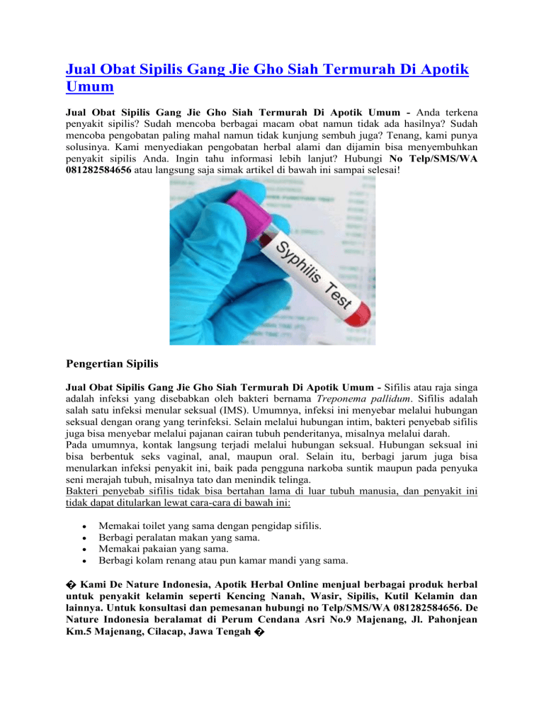 Jual Obat Sipilis Gang Jie Gho Siah Termurah Di Apotik Umum Jual Obat Sipilis Gang Jie Gho Siah Termurah Di Apotik Umum - Anda terkena penyakit sipilis? Sudah mencoba berbagai macam obat namun tidak ada hasilnya? Sudah mencoba pengobatan paling mahal namun tidak kunjung sembuh juga? Tenang, kami punya solusinya. Kami menyediakan pengobatan herbal alami dan dijamin bisa menyembuhkan penyakit sipilis Anda. Ingin tahu informasi lebih lanjut? Hubungi No Telp/SMS/WA 081282584656 atau langsung saja simak artikel di bawah ini sampai selesai! Pengertian Sipilis Jual Obat Sipilis Gang Jie Gho Siah Termurah Di Apotik Umum - Sifilis atau raja singa adalah infeksi yang disebabkan oleh bakteri bernama Treponema pallidum. Sifilis adalah salah satu infeksi menular seksual (IMS). Umumnya, infeksi ini menyebar melalui hubungan seksual dengan orang yang terinfeksi. Selain melalui hubungan intim, bakteri penyebab sifilis juga bisa menyebar melalui pajanan cairan tubuh penderitanya, misalnya melalui darah. Pada umumnya, kontak langsung terjadi melalui hubungan seksual. Hubungan seksual ini bisa berbentuk seks vaginal, anal, maupun oral. Selain itu, berbagi jarum juga bisa menularkan infeksi penyakit ini, baik pada pengguna narkoba suntik maupun pada penyuka seni merajah tubuh, misalnya tato dan menindik telinga. Bakteri penyebab sifilis tidak bisa bertahan lama di luar tubuh manusia, dan penyakit ini tidak dapat ditularkan lewat cara-cara di bawah ini: Memakai toilet yang sama dengan pengidap sifilis. Berbagi peralatan makan yang sama. Memakai pakaian yang sama. Berbagi kolam renang atau pun kamar mandi yang sama. � Kami De Nature Indonesia, Apotik Herbal Online menjual berbagai produk herbal untuk penyakit kelamin seperti Kencing Nanah, Wasir, Sipilis, Kutil Kelamin dan lainnya. Untuk konsultasi dan pemesanan hubungi no Telp/SMS/WA 081282584656. De Nature Indonesia beralamat di Perum Cendana Asri No.9 Majenang, Jl. Pahonjean Km.5 Majenang, Cilacap, Jawa Tengah � Tahapan Sipilis Gejala pertama sifilis muncul sekitar tiga minggu setelah bakteri memasuki tubuh. Infeksi sifilis terbagi menjadi empat tahapan utama, antara lain: � Sifilis Primer Penderita sifilis mengalami gejala yang dimulai dengan lesi atau luka pada alat kelamin atau di dalam dan di sekitar mulut. Luka yang terjadi berbentuk seperti gigitan serangga tapi tidak menimbulkan rasa sakit. Pada tahap ini, jika orang yang terinfeksi berhubungan seksual dengan orang lain, penularan sangat mudah terjadi. Luka ini bertahan selama 1-2 bulan. Pada akhirnya, lesi ini akan sembuh tanpa meninggalkan bekas. � Sifilis Sekunder Penderita sifilis sekunder akan mengalami ruam merah serukuran koin kecil dan biasanya ruam ini muncul pada telapak tangan dan telapak kaki. Gejala lain yang mungkin muncul adalah demam, nafsu makan menurun, radang tenggorokan dan kutil kelamin. Fase ini bisa bertahan selama satu hingga tiga bulan. � Sifilis Laten Setelah fase sifilis sekunder, sifilis seakan-akan menghilang dan tidak menimbulkan gejala sama sekali. Masa laten ini bisa bertahan sekitar dua tahun sebelum kemudian lanjut ke masa yang paling berbahaya dalam infeksi sifilis yaitu sifilis tersier. � Sifilis Tersier Jika infeksi tidak terobati, sifilis akan berkembang ke tahapan akhir, yaitu sifilis tersier. Pada tahap ini, infeksi bisa memberi efek yang serius pada tubuh. Beberapa akibat dari infeksi pada tahapan ini adalah kelumpuhan, kebutaan, demensia, masalah pendengaran, impotensi, dan bahkan kematian jika tidak ditangani. Sifilis paling mudah menular pada fase sifilis primer dan sekunder. Jika Anda merasa terinfeksi sifilis, segera periksakan diri ke dokter atau klinik spesialis penyakit kelamin untuk memastikan diagnosis terhadap sifilis. Makin cepat sifilis diobati, makin kecil kemungkinan sifilis berkembang menjadi penyakit yang serius. GEJALA ATAU TANDA PENYAKIT SIPILIS Obat Sipilis Gang Jie Gho Siah De Nature - Penyakit sipilis bisa menyebabkan kerusakan organ-organ tubuh. Kerusakan tersebut bisa menimpa syaraf, otak, otot, tulang, mata, serta organ bagian tubuh yang lainnya. Bahkan, jika sudah stadium lajut penyakit ini dapat menyebabkan kematian pada si penderita.Penyakit kelamin yang satu ini memang tidak boleh dianggap remeh. Perlu Anda ketahui bahwa penyakit ini akan menggerogoti sistem kekebalan tubuh penderita sehingga tubuh si penderita akan sangat mudah terkena penyakit dan bertambah parah karena infeksi dari bakteri penyebab penyakit ini menyebar keseluruh tubuh dengan cepat. Untuk itu sebaiknya kita dapat mengenali tanda-tanda penyakit kelamin ini melalui gejala yang muncul. Informasi lebih lanjut hubungi Telp/SMS/WA 081282584656 Gejala/Tanda Penyakit Sipilis Pada Wanita 1. Keluarnya cairan tidak normal dari saluran kencing atau liang senggama 2. Timbulnya keputihan yang banyak, berbau amis, dan warnanya cenderung putih kehijauan. 3. Rasa nyeri ketika buang air kecil 4. Rasa nyeri saat berhubungan seksual 5. Timbulnya rasa gatal di alat kelamin atau sekitarnya dan menjadi luka koreng di kelamin. 6. Timbulnya luka kecil (terkadang tidak terasa sakit) disertai pembengkakan kelenjar getah bening. 7. Terjadinya perubahan warna kulit dan mata komplikasi bartolitis, yaitu membengkaknya kelenjar Bartholin mengakibatkan kesulitan berjalan karena rasa nyeri. Gejala/Tanda Penyakit Sipilis Pada Pria Sering nyeri selama hubungan seksual. Nyeri ketika buang air kecil. Keluarnya cairan atau kotoran dari penis laki-laki. Ada luka kerongkongan pada orang-orang melakukan oral sek, sehingga kerongkongan sering terasa sakit. Nyeri pada daerah sekitar anus (hal ini terjadi pada orang-orang melakukan anal sex). Luka memerah tanpa rasa sakit pada daerah kelamin, anus, kerongkongan dan atau lidah. Bintik merah pada kulit dan menjadi luka koreng di kelamin. Timbulnya bersisik pada telapak tangan dan telapak kaki. Urine (air kencing) berwarna cenderung gelap, feses berwarna terang. Mata dan kulit cendrung berwarna kuning. Timbulnya bentuk lepuh kecil pada daerah kel