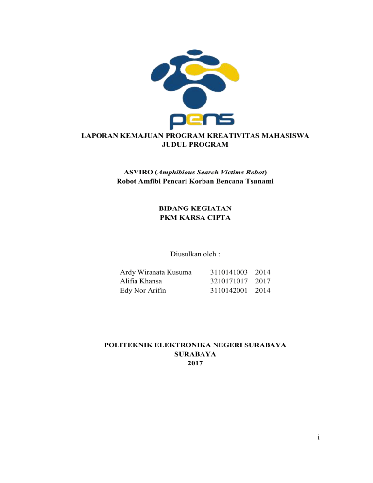 LAPORAN KEMAJUAN PROGRAM KREATIVITAS MAHASISWA JUDUL PROGRAM ASVIRO (Amphibious Search Victims Robot) Robot Amfibi Pencari Korban Bencana Tsunami BIDANG KEGIATAN PKM KARSA CIPTA Diusulkan oleh : Ardy Wiranata Kusuma Alifia Khansa Edy Nor Arifin 3110141003 3210171017 3110142001 2014 2017 2014 POLITEKNIK ELEKTRONIKA NEGERI SURABAYA SURABAYA 2017 i PENGESAHAN PKM-KARSA CIPTA 1. Judul Kegiatan 2. Bidang Kegiatan 3. Ketua Pelaksana Kegiatan a. Nama Lengkap b. NRP c. Jurusan d. Universitas/Institut/Politeknik e. Alamat Rumah dan No Tel./HP 4. 5. 6. 7. : ASVIRO(Amphibious Search Victims Robot), Robot Amfibi Pencari Korban Bencana Tsunami. : PKM-KC : : : : : Ardy Wiranata Kusuma 3110141003 Teknik Mekatronika Politeknik Elektronika Negeri Surabaya Perum Bumi Bulu Indah Blok L-11, Kraksaan, Probolinggo f. Alamat email : [email protected] Anggota Pelaksana kegiatan/Penulis : 2 orang Dosen Pendamping a. Nama Lengkap dan Gelar : Son Kuswadi. Dr.Eng b. NIDN : 0015016213 c. Alamat Rumah dan No Tel./HP : Jl. Karang Menjangan 1/44 Surabaya 081243531083 Biaya Kegiatan Total a. Dikti : Rp. 12.494.000,00 b. Sumber Lain (sebutkan...) : Rp. 0,00 Jangka Waktu Pelaksanaan : 5 bulan Surabaya, 06 November 2017 Menyetujui, Kepala Departemen Teknik Mekanika dan Energi PENS Ketua Pelaksana Kegiatan (Didik Setyo Purnomo, S.T., M.Eng) NIP. 19700219 199512 1 001 (Ardy Wiranata Kusuma) NRP. 3110141003 Wakil Direktur Bidang Kemahasiswaan PENS Dosen Pendamping (Ir. Anang Budikarso, M.T.) NIP. 19630508 1988 03 1 003 (Son Kuswadi, Dr.Eng) NIDN. 0015016213 DAFTAR ISI HALAMAN SAMPUL ...................................................................................... i HALAMAN PENGESAHAN ............................................................................. ii RINGKASAN ..................................................................................................... iii DAFTAR ISI ....................................................................................................... iv BAB 1. PENDAHULUAN 1.1 Latar Belakang Masalah .................................................................... 1.2 Perumusan Masalah .......................................................................... 1.3 Tujuan Program ................................................................................. 1.4 Manfaat Program ............................................................................... 1 3 4 4 BAB 2. TINJAUAN PUSTAKA 2.1 Rescue Robotic .................................................................................. 5 2.2 Amphibious Robotics......................................................................... 5 2.3 Autonomous Robotics and Tele-operated ......................................... 6 BAB 3. TARGET LUARAN …………………………………………………. 7 BAB 4. METODE PELAKSANAAN 3.1 Studi Literatur ................................................................................... 3.2 Perancangan Sistem .......................................................................... 3.3 Pembuatan Mekanik .......................................................................... 3.4 Pembuatan Hardware ........................................................................ 3.5 Integrasi Mekanik dan Hardware ...................................................... 3.6 Pengujian Alat dan Analisa Alat ....................................................... 3.7 Pembuatan Laporan ........................................................................... 8 8 8 8 9 9 9 BAB 5. HASIL YANG DICAPAI ……………………………………………. 9 BAB 6. POTENSI HASIL ……………………………………………………. 10 BAB 7. RENCANA TAHAPAN BERIKUTNYA …………………………… 10 LAMPIRAN …………………………………………………………………... 10 iii 1 BAB 1. PENDAHULUAN 1.1 Latar Belakang Masalah Berdasarkan data Badan Nasional Penanggulangan Bencana BNPB (www.bbc.com . 2014), sebagai wilayah yang terletak di jalur subduksi pertemuan 3 lempeng utama dunia, Indonesia rentan terhadap terjadinya bencana gempa bumi dan tsunami. Kerentanan itu nyata di hampir seluruh wilayah di Indonesia. Gambar 1.1 Tingkat Ancaman Tsunami di Indonesia Sumber: http://www.bbc.com (diakses pada tanggal 7 oktober 2017 jam 14.50 WIB) Seperti yang terjadi pada bencana Tsunami Aceh yang memakan korban hingga 130.000 jiwa lebih dan hampir meratakan Provinsi Aceh. Dapat dilihat pada Gambar 1.2 bagaimana keadaan lingkungan pasca bencana Tsunami. Gambar1.2 BencanaTsunami Aceh Sumber: http://images.detik.com/content/2011/03/14/157/jepangaceh3.jpg (di akses pada tanggal 9 Oktober 2017 jam 01.16 WIB) Dari Gambar 1.1 dapat kita cermati bahwa hampir disemua wilayah Indonesia berpotensi mengalami bencana Tsunami baik sedang maupun tinggi. Hal inilah yang harus selalu kita maupun pemerintah waspadai, dengan adanya data ini pula Indonesia harus segera berbenah dengan cara memperbaiki infrastruktur baik untuk penanggulangan pra ataupun pasca bencana Tsunami. Salah satu yang menjadi sorotan adalah penanggulangan pasca bencana yang kurang baik dan memakan waktu cukup lama. Berdasarkan data dari Inernational Recovery Platform IRP, jumlah total korban meninggal mencapai 188 ribu jiwa. Sementara jumlah korban hilang tidak terdefinisi. Ini membuktikan bahwa bencana Tsunami ini merupakan bencana yang tidak main-main melainkan bencana yang setiap terjadi memakan banyak korban jiwa, dimana setiap terjadi bencana Tsunami disetiap negara maka bencana Tsunami tersebut dinyatakan sebagai bencana 2 nasional di negara tersebut. Beberrapa negara yang pernah terdampak bencana Tsunami dapat terlihat pada Gambar 1.3 berikut dan Indonesia menempati posisi pertama jumlah korban meninggal. NEGARA JUMLAH KORBAN MENINGGAL Indonesia 127.720 orang India 16.389 orang Maldives 102 orang Sri Lanka 35.399 orang Thailand 8.345 orang Myanmar 71 orang Somalia 298 orang Total 188.324 orang Gambar 1.3 Jumlah Korban Terdampak