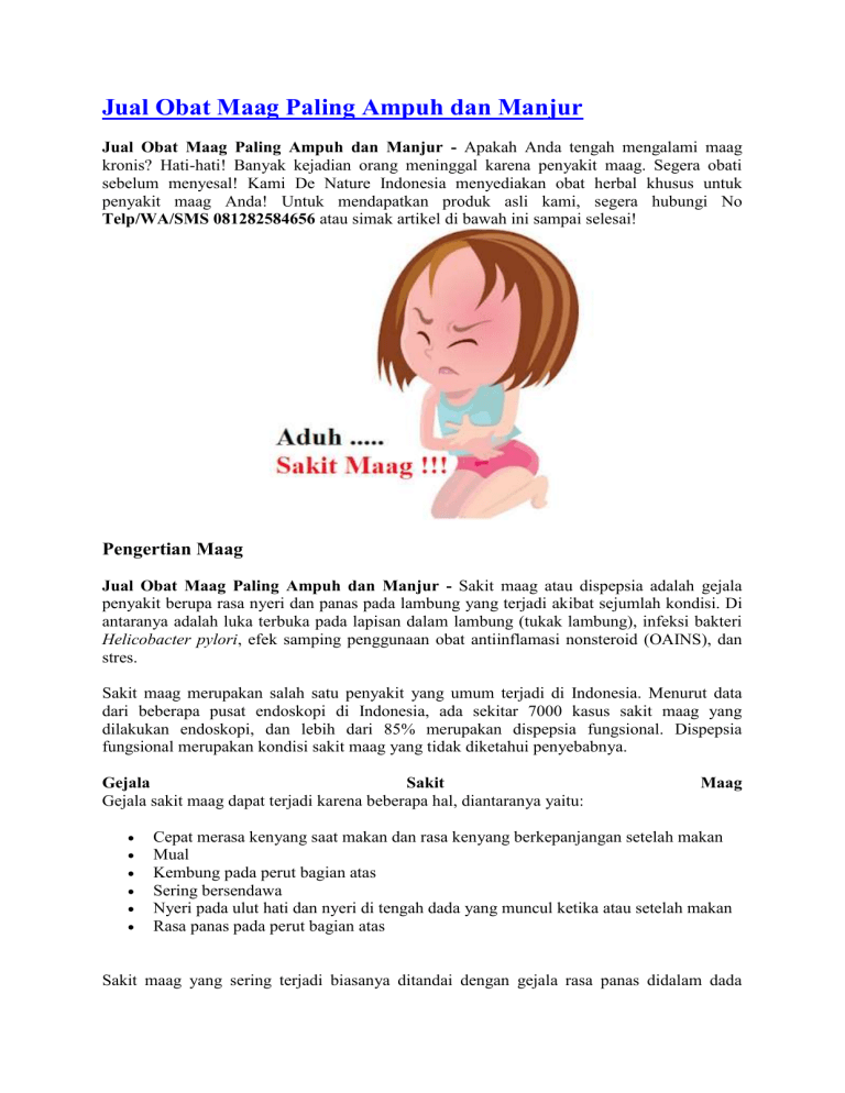 Jual Obat Maag Paling Ampuh dan Manjur Jual Obat Maag Paling Ampuh dan Manjur - Apakah Anda tengah mengalami maag kronis? Hati-hati! Banyak kejadian orang meninggal karena penyakit maag. Segera obati sebelum menyesal! Kami De Nature Indonesia menyediakan obat herbal khusus untuk penyakit maag Anda! Untuk mendapatkan produk asli kami, segera hubungi No Telp/WA/SMS 081282584656 atau simak artikel di bawah ini sampai selesai! Pengertian Maag Jual Obat Maag Paling Ampuh dan Manjur - Sakit maag atau dispepsia adalah gejala penyakit berupa rasa nyeri dan panas pada lambung yang terjadi akibat sejumlah kondisi. Di antaranya adalah luka terbuka pada lapisan dalam lambung (tukak lambung), infeksi bakteri Helicobacter pylori, efek samping penggunaan obat antiinflamasi nonsteroid (OAINS), dan stres. Sakit maag merupakan salah satu penyakit yang umum terjadi di Indonesia. Menurut data dari beberapa pusat endoskopi di Indonesia, ada sekitar 7000 kasus sakit maag yang dilakukan endoskopi, dan lebih dari 85% merupakan dispepsia fungsional. Dispepsia fungsional merupakan kondisi sakit maag yang tidak diketahui penyebabnya. Gejala Sakit Gejala sakit maag dapat terjadi karena beberapa hal, diantaranya yaitu: Maag Cepat merasa kenyang saat makan dan rasa kenyang berkepanjangan setelah makan Mual Kembung pada perut bagian atas Sering bersendawa Nyeri pada ulut hati dan nyeri di tengah dada yang muncul ketika atau setelah makan Rasa panas pada perut bagian atas Sakit maag yang sering terjadi biasanya ditandai dengan gejala rasa panas didalam dada akibat naiknya asam lambung ke bagian kerongkongan. Stres pun membawa dampak menjadi lebih negatif bagi pengidap sakit maag. Berikut 3 komplikasi yang berkaitan dengan penyakit maag: :: Esofagus barret Esofagus barret disebabkan oleh paparan asam lambung di kerongkongan secara terus menerus, yang menyebabkan perubahan pada sel-sel di lapisan bagian bawah kerongkongan menjadi sel kanker. :: Stenosis pilorus Komplikasi ini terjadi karena paparan asam lambung pada area pilorus dalam jangka panjang, yang menimbulkan jaringan parut dan mempersempit pilorus. Sehingga mengakibatkan makanan tidak tercerna dengan baik. :: Penyempitan esofagus Penyempitan esofagus terjadi saat seseorang sering mengalami sakit maag akibat refluks asam. Gejala yang muncul biasanya berupa sulit menelan dan nyeri pada bagian dada. Harga Rp. 295.000 Pemesanan obat hubungi tlp/sms/whatsapp : 081282584656 Penyebab Sakit Maag Jual Obat Maag Paling Ampuh dan Manjur - Sebelum kamu mengetahui penyabab sakit maag, kamu harus tahu tentang cara kerja lambung. Pertama-tama, makanan masuk ke lambung lalu dicerna secara kimiawi dengan bantuan dari enzim pepsin dan renin dicampur dengan asam lambung (HCl) Apabila terjadi gangguan, maka kerusakan pada mukosa akan menimbulkan rasa sakit atau nyeri. Apabila gangguan ini terus menerus terjadi, maka luka pada lapisan mukosa lambung dapat membuat terjadinya maag. Rasa nyeri karena maag akut disebabkan oleh rangsangan yang dibuat oleh asam lambung pada lapisan mukosa lambung, sehingga ujung-ujung syaraf menjadi lebih peka oleh rasa nyeri. Banyak faktor yang dapat menyebabkan sakit maag, seperti: Adanya masalah psikologi. Infeksi bakteri helicobacter pylori. Efek samping menggunakan obat anti inflamasi nonsteroid. Terlalu banyak makan. Kelebihan berat badan. Makan terlalu cepat. Mengonsumsi makanan berminyak, berlemak dan pedas. Terlalu banyak mengonsumsi minuman berkafein dan soda. Mengonsumsi cokelat berlebihan. Sakit maag juga terjadi akibat komplikasi terhadap penyakit, misalnya penyakit batu empedu, radang pancreas, penyumbatan usus dan kanker lambung. Cara mencegah maag kronis Tidak jelas bagaimana H. pylori penyebab infeksi lambung menyebar, tapi ada beberapa bukti bahwa hal itu bisa ditularkan dari orang ke orang atau melalui makanan dan air yang terkontaminasi. Anda dapat mengambil langkah-langkah berikut untuk melindungi diri dari infeksi saluran cerna penyebab maag kronis, seperti : Sering mencuci tangan dengan sabun dan air mengalir. Makan makanan yang telah dimasak dengan matang. Makan teratur, jangan sering menunda-nunda atau telat makan. Tanaman Ampuh Untuk Mengobati Penyakit Maag Kronis Obat Herbal MAAG De Nature Indonesia Jual Obat Maag Paling Ampuh dan Manjur - Salah satu alternatif untuk mengobati Penyakit Maag adalah dengan memanfaatkan bahan alami yang bermanfaat membantu pengobatan penyakit anda, kami De Nature Indonesia menyediakan produk obat herbal untuk membantu penderita Penyakit Maag. Zaitop & Moringa dari kami De Nature. Salah satu produk Obat Herbal Alami, diproduksi lebih dari 10 tahun yang sudah dipercaya sampai sekarang. Terbuat dari bahan herbal, sehingga aman dikonsumsi tanpa menimbulkan efek Samping. Segera obati Penyakit Maag anda, dengan izin Alloh SWT mudah-mudahan dapat terobati. Amin. Untuk pemesanan obat herbal Penyakit Maag bisa melakukan kontak dengan kami. Harga Rp. 295.000 Pemesanan obat hubungi tlp/sms/whatsapp : 081282584656 PAKET OBAT MAAG RP 295.000,Paket berisi : :: 1 botol kapsul Zaitop @50 kapsul :: 1 botol kapsul Moringa @50 kapsul Sekedar informasi untuk kenyamanan Konsumen, bahwa Produk dari perusahaan kami ini sudah memiliki: Ijin Resmi Perusahaan dari Kementerian Kesehatan Ijin BPOM, yang artinya sudah lulus uji stabilitas Produk Sertifikat Halal MUI, sehingga halal bisa dipertanggungjawabkan Apoteker yang sudah berpengalaman Sudah melewati Proses Sortir Bahan Baku, Guna Menjaga Mutu Produk Proses Produksi Sesuai Alur CPOTB (Cara Pembuatan Obat Tradisional Yang Baik Dan Benar) Cara Pemesanan Pembayaran terlebih dulu via transfer Bank, setelah transfer SMS-kan konfirmasinya untuk proses pengiriman. Format Pemesanan: Nama, Alamat Lengkap beserta kode Pos, Nama Bank / Rekening anda, Nominal transfer, Nama Obat yg dipesan, No.Hp Anda Agar pesanan Anda bisa segera diproses, segera konfirmasikan pembayaran Anda via Telp/SMS/WA ke 081282584656 Setelah itu barang kami kirim melalui TIKI / JNE / J&T / POS. CONTOH SMS KO