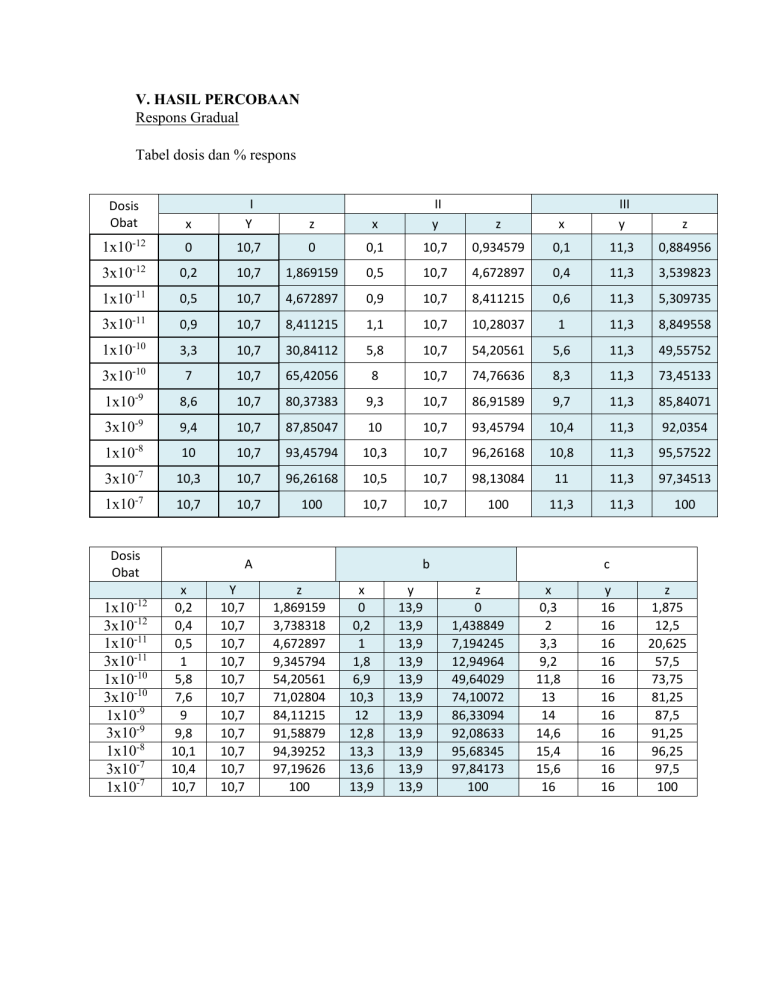 V. HASIL PERCOBAAN Respons Gradual Tabel dosis dan % respons x I Y x II y x III y z z z 1x10-12 0 10,7 0 0,1 10,7 0,934579 0,1 11,3 0,884956 3x10-12 0,2 10,7 1,869159 0,5 10,7 4,672897 0,4 11,3 3,539823 1x10-11 0,5 10,7 4,672897 0,9 10,7 8,411215 0,6 11,3 5,309735 3x10-11 0,9 10,7 8,411215 1,1 10,7 10,28037 1 11,3 8,849558 1x10-10 3,3 10,7 30,84112 5,8 10,7 54,20561 5,6 11,3 49,55752 3x10-10 7 10,7 65,42056 8 10,7 74,76636 8,3 11,3 73,45133 1x10-9 8,6 10,7 80,37383 9,3 10,7 86,91589 9,7 11,3 85,84071 3x10-9 9,4 10,7 87,85047 10 10,7 93,45794 10,4 11,3 92,0354 1x10-8 10 10,7 93,45794 10,3 10,7 96,26168 10,8 11,3 95,57522 3x10-7 10,3 10,7 96,26168 10,5 10,7 98,13084 11 11,3 97,34513 1x10-7 10,7 10,7 100 10,7 10,7 100 11,3 11,3 100 Dosis Obat Dosis Obat -12 1x10 3x10-12 1x10-11 3x10-11 1x10-10 3x10-10 1x10-9 3x10-9 1x10-8 3x10-7 1x10-7 A x 0,2 0,4 0,5 1 5,8 7,6 9 9,8 10,1 10,4 10,7 Y 10,7 10,7 10,7 10,7 10,7 10,7 10,7 10,7 10,7 10,7 10,7 b z 1,869159 3,738318 4,672897 9,345794 54,20561 71,02804 84,11215 91,58879 94,39252 97,19626 100 x 0 0,2 1 1,8 6,9 10,3 12 12,8 13,3 13,6 13,9 y 13,9 13,9 13,9 13,9 13,9 13,9 13,9 13,9 13,9 13,9 13,9 c z 0 1,438849 7,194245 12,94964 49,64029 74,10072 86,33094 92,08633 95,68345 97,84173 100 x 0,3 2 3,3 9,2 11,8 13 14 14,6 15,4 15,6 16 y 16 16 16 16 16 16 16 16 16 16 16 z 1,875 12,5 20,625 57,5 73,75 81,25 87,5 91,25 96,25 97,5 100 Dosis Obat yang Diberikan (M) 1x10-12 3x10-12 1x10-11 3x10-11 1x10-10 3x10-10 1x10-9 3x10-9 1x10-8 3x10-7 1x10-7 Log dosis-respons -12 -11,52 -11 -10,52 -10 -9,52 -9 -8,52 -8 -7,52 -7 Keterangan a = PGV-0 3 . E-6 M b = PGV-0 1 . E-5 M c = PGV-0 3 . E-5 M I = agonis histamin I II = agonis hitamin II III= agonis histamin III x = tinggi respons y = tinggi maksimum z = %respons 1. Harga pD2 obat untuk tiap kurva a. Konsentrasi PGV-0 3x10-6 M Persamaan regresi: y = 24,14907x + 285,2857 pD2 = -logaritma ED 50 50 = 24,14907x + 285,2857 x = -9,74305 log ED50 = -9,74305 pD2 = 9,74305 b. Konsentrasi PGV-0 1 x10-5 M Persamaan regresi: y = 24,47411x+ 288,8417 pD2 = -logaritma ED 50 perhitungan: 50 = 24,47411x + 288,8417 x = -9,75895 log ED50 = -9,75895 pD2 = 9,75895 c. Konsentrasi PGV-0 3 x10-5 M Persamaan regresi: y = 21,01x + 286,54 pD2 = -logaritma ED 50 perhitungan: 50 = 20,69447 x + 286,54 x = -10,2559 log ED50 = -10,2559 pD2 = 10,2559 d. Agonis Histamin I Persamaan regresi: y = 24,58616x + 285,5337 pD2 = -logaritma ED 50 perhitungan: 50 = 24,58616x + 285,5337 x = -9,57993 log ED50 = -9,57993 pD2 = 9,579932 e. Agonis Histamin II Persamaan regresi: y = 24,21617x + 287,3681 pD2 = -logaritma ED 50 perhitungan: 50 = 24,21617x + 287,3681 x = -9,80205 log ED50 = -9,80205 pD2 = 9,802048 f. Agonis Histamin III Persamaan regresi: y = 24,44218x+ 288,0947 pD2 = -logaritma ED 50 perhitungan: 50 = 24,44218x+ 288,0947 x = -9,74114 log ED50 = -9,74114 pD2 = 9,741139 Rerata pD2 pada gambar pertama = 9,919297 SD = 0,291604; CV = 2,939763% Rerata pD2 pada gambar kedua = 9,707707 SD = 0,11477; CV = 1,182258% Efek dan kerja obat dapat diketahui dengan membandingkan respons gradual (terukur dengan angka) pada sampel yang diberikan perlakuan pemejanan obat PGV-0 dan pada sampel yang diberi agonis histamin saja. Nilai pD2 gambar pertama lebih besar dibandingkan pD2 gambar kedua sehingga harga pD2 mengalami penurunan dengan penambahan PGV-0. pD2 menunjukkan seberapa kecil dosis yang diberikan dapat memberikan efek. Maka dari itu, pemberian PGV-0 terhadap agonis histamin mengakibatkan afinitas agonis histamin terhadap reseptor spesifiknya mengalami penurunan, semakin sedikit agonis histamin yang dapat dikenali oleh reseptor histamin. Hal ini akan berdampak pada menurunnya efek (respons) dari agonis histamin di dalam tubuh.