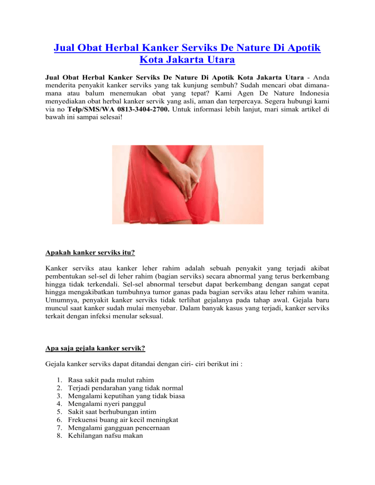 Jual Obat Herbal Kanker Serviks De Nature Di Apotik Kota Jakarta Utara Jual Obat Herbal Kanker Serviks De Nature Di Apotik Kota Jakarta Utara - Anda menderita penyakit kanker serviks yang tak kunjung sembuh? Sudah mencari obat dimanamana atau balum menemukan obat yang tepat? Kami Agen De Nature Indonesia menyediakan obat herbal kanker servik yang asli, aman dan terpercaya. Segera hubungi kami via no Telp/SMS/WA 0813-3404-2700. Untuk informasi lebih lanjut, mari simak artikel di bawah ini sampai selesai! Apakah kanker serviks itu? Kanker serviks atau kanker leher rahim adalah sebuah penyakit yang terjadi akibat pembentukan sel-sel di leher rahim (bagian serviks) secara abnormal yang terus berkembang hingga tidak terkendali. Sel-sel abnormal tersebut dapat berkembang dengan sangat cepat hingga mengakibatkan tumbuhnya tumor ganas pada bagian serviks atau leher rahim wanita. Umumnya, penyakit kanker serviks tidak terlihat gejalanya pada tahap awal. Gejala baru muncul saat kanker sudah mulai menyebar. Dalam banyak kasus yang terjadi, kanker serviks terkait dengan infeksi menular seksual. Apa saja gejala kanker servik? Gejala kanker serviks dapat ditandai dengan ciri- ciri berikut ini : 1. 2. 3. 4. 5. 6. 7. 8. Rasa sakit pada mulut rahim Terjadi pendarahan yang tidak normal Mengalami keputihan yang tidak biasa Mengalami nyeri panggul Sakit saat berhubungan intim Frekuensi buang air kecil meningkat Mengalami gangguan pencernaan Kehilangan nafsu makan 9. Mengalami kelelahan Akan tetapi banyak wanita yang tidak menyadari bahkan meremehkan tanda yang mereka alami yang mungkin bisa jadi gejala kanker serviks stadium awal. Lalu, apa saja pengobatan yang dapat dilakukan oleh penderita kanker serviks? Pengobatan Kanker Serviks Ada beberapa langkah pengobatan yang dapat dilakukan untuk menyembuhkan kanker serviks yang sedang Anda derita yaitu dengan cara Operasi, Radioterapi, ataupun Kemoterapi. Akan tetapi cara pengobatan tersebut ternyata tidak seefektif yang pasien harapkan. Penyakit ini bisa semakin kronis dan muncul kembali meskipun pengobatanya sudah dilakukan. Tapi jangan khawatir karena berbagai penelitian kesehatan yang dilakukan oleh orang berkompeten selalu berupaya menemukan pengobatan yang benar-benar efektif untuk penyakit ini. Baca Juga : Apotik Herbal Jual Obat Kanker Serviks De Nature Di Kota Makassar Obat herbal De Nature adalah satu-satunya solusi terbaik bagi Anda untuk mendapatkan pengobatan yang ampuh untuk penyakit kanker serviks yang sedang Anda derita saat ini. Obat herbal De Nature sudah teruji secara klinis bahwa obat herbal De Nature memiliki kandungan antioksidan yang sangat tinggi di mana zat antioksidan ini merupakan zat antikanker yang mampu menghambat atau menekan pertumbuhan dan perkembangan sel-sel kanker dalam tubuh Anda. Kini Anda tidak perlu ragu untuk melakukan pemesanan obat herbal De Nature yang asli, karena sekarang Anda telah menemukan situs yang tepat. Kami Agen obat herbal de nature yang asli dan terpercaya, jadi Anda tidak perlu lagi khawatir untuk melakukan pemesanan. Untuk mendapatkan produk yang asli segera hubungi no Telp/SMS/ Wa 0813-3404-2700. OBAT HERBAL KANKER SERVIKS ZIIRZAX & TYPHOGELL DE NATURE Untuk Pemesana Produk Yang Asli Hubungi Via Telp/SMS/ Wa : 0813-3404-2700 Harga Obat Kanker Serviks De Nature : Paket 1 minggu : Rp 315.000 (Terdiri dari 1 botol Ziirzax dan 1 botol Typhogell) Paket 1 bulan : Rp 1.150.000 (Terdiri dari 4 botol Ziirzax dan 4 botol Typhogell) hemat Rp 110.000 Paket 2 bulan : Rp 1.995.000 (Terdiri dari 8 botol Ziirzak dan 8 botol Typhogell) hemat Rp 525.000 Obat Kanker Serviks De Nature berisi : 1 Botol Ziirzax isi 50 Kapsul 1 Botol Typhogell isi 50 Kapsul Aturan Minum: Kapsul Ziirzax diminum 3 kali Sehari 2 kapsul/btl 1 jam sebelum makan. Kapsul Typhogell diminum 3 kali Sehari 2 kapsul/btl 1 jam sebelum makan. (Belum termasuk ongkir) Obat Herbal Ziirzax De Nature Obat kanker alami de nature ziirzax diproduksi dari daun dan buah sirsak alami yang mempunyai banyak manfaat, dipadukan dengan bahan- bahan herbal lainya yang dapat membantu menyembuhkan penyakit kanker. Tiap kapsul obat kanker alami de nature ziirzax mengandung ekstrak yang setara dengan Annonane muricata folium 2500 mg. Obat kanker alami de nature ziirzax ini mempunyai banyak khasiat yang dapat membantu anda dalam mempercepat penyembuhan penyakit kanker dalam tubuh anda. Serta daun sirsak juga dapat membunuh dan memperbaiki tingkat kesehatan dalam tubuh. Obat Herbal Thypogell De Nature Obat kanker alami de nature typhogell diproduksi dari tanaman keladi tikus (Typhonium flagelliforme) yang digunakan sebagai obat kanker payudara. Tiap kapsul obat de nature mengandung ekstrak yang setara dengan Typhonium flagelliforme 500 mg Rhizoma exstra. Obat kanker alami de nature typhogell mempunyai banyak khasiat bagi tubuh anda.Sebagai imunitas antikanker, antimikrobia dan antioksidan. Penghambat pertumbuhan sel- sel kanker. Mengurangi efek buruk kemoterapi. Anti virus dan anti bakteri. Mengatasi diabetes. Mengatasi hipertensi. Meningkatkan kekebalan tubuh. Anda bisa sembuh lebih cepat dengan mengonsumsi obat herbal de nature dibandingkan dengan mengonsumsi obat herbal yang ada dipasaran. Karena obat herbal de nature terbuat dari bahan- bahan alami yang sudah terbukti khasiatnya dan diproduksi langsung oleh para ahli yang handal, dan produk kami diterima langsung oleh para konsumen secara langsung. Sekarang Anda tidak perlu khawatir untuk melakukan pemesanan produk obat herbal de nature kami. Anda cukup duduk nyaman kemudian lakukan pesanan obat herbal de nature yang Anda butuhkan. Obat herbal De Nature tidak dipasarkan di apotik ataupun toko- toko obat manapun. Untuk memudahkan Anda dalam membeli obat herbal de nature kami. Oleh sebab itu semua obat De Nature yang Anda cari hanya dijual via online. Dan hanya dipromosikan melalui situs website. Melalui website kami yang sedang Anda kunjungi, merupakan solusi terbaik untuk pemesanan obat De Nature yang asli bisa Anda dapatkan.