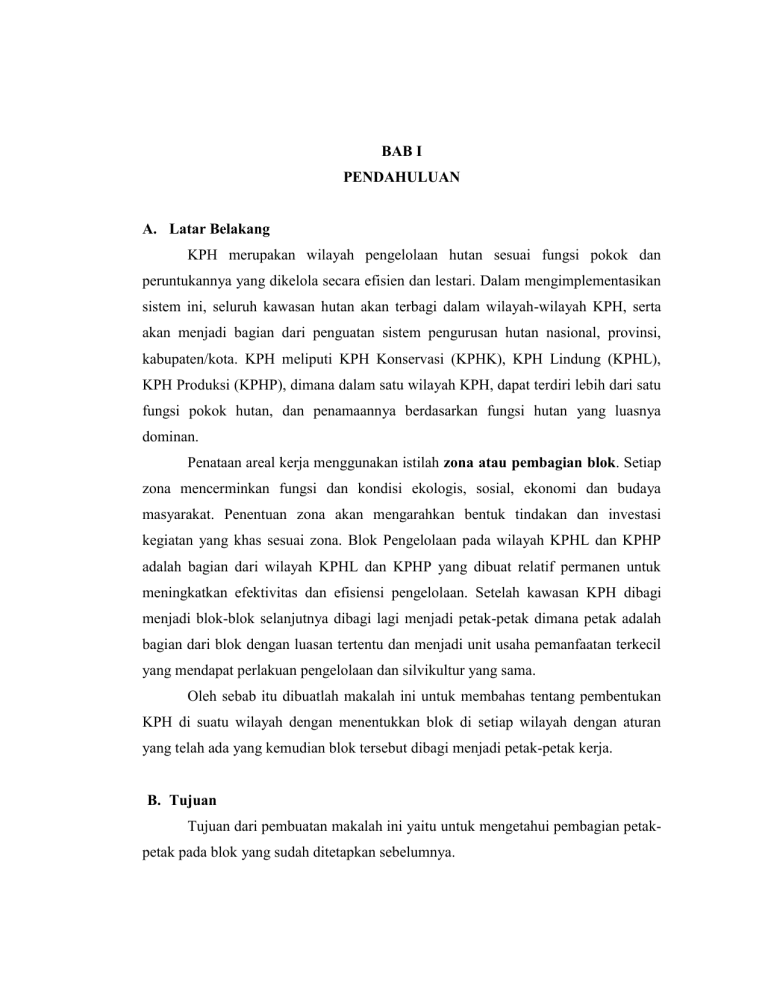 BAB I PENDAHULUAN A. Latar Belakang KPH merupakan wilayah pengelolaan hutan sesuai fungsi pokok dan peruntukannya yang dikelola secara efisien dan lestari. Dalam mengimplementasikan sistem ini, seluruh kawasan hutan akan terbagi dalam wilayah-wilayah KPH, serta akan menjadi bagian dari penguatan sistem pengurusan hutan nasional, provinsi, kabupaten/kota. KPH meliputi KPH Konservasi (KPHK), KPH Lindung (KPHL), KPH Produksi (KPHP), dimana dalam satu wilayah KPH, dapat terdiri lebih dari satu fungsi pokok hutan, dan penamaannya berdasarkan fungsi hutan yang luasnya dominan. Penataan areal kerja menggunakan istilah zona atau pembagian blok. Setiap zona mencerminkan fungsi dan kondisi ekologis, sosial, ekonomi dan budaya masyarakat. Penentuan zona akan mengarahkan bentuk tindakan dan investasi kegiatan yang khas sesuai zona. Blok Pengelolaan pada wilayah KPHL dan KPHP adalah bagian dari wilayah KPHL dan KPHP yang dibuat relatif permanen untuk meningkatkan efektivitas dan efisiensi pengelolaan. Setelah kawasan KPH dibagi menjadi blok-blok selanjutnya dibagi lagi menjadi petak-petak dimana petak adalah bagian dari blok dengan luasan tertentu dan menjadi unit usaha pemanfaatan terkecil yang mendapat perlakuan pengelolaan dan silvikultur yang sama. Oleh sebab itu dibuatlah makalah ini untuk membahas tentang pembentukan KPH di suatu wilayah dengan menentukkan blok di setiap wilayah dengan aturan yang telah ada yang kemudian blok tersebut dibagi menjadi petak-petak kerja. B. Tujuan Tujuan dari pembuatan makalah ini yaitu untuk mengetahui pembagian petakpetak pada blok yang sudah ditetapkan sebelumnya. BAB II LANDASAN TEORI II.1. Perencanaan Kehutanan Perencanaan kehutanan adalah proses penetapan tujuan, penentuan kegiatan dan perangkat yang diperlukan dalam pengurusan hutan lestari untuk memberikan pedoman dan arah guna menjamin tercapainya tujuan penyelenggaraan kehutanan untuk sebesar - besarnya kmakmuran rakyat yang berkeadilan dan berkelanjutan (Direktorat Jenderal Planologi Kehutanan 2010). Perencanaan hutan adalah suatu bagian proses pengelolaan hutan untuk memperoleh landasan kerja dan landasan hukum agar terwujud ketertiban dan kepastian hukum dalam pemanfaatan hutan sehingga menunjang diperolehnya manfaat hutan yang optimal, berfungsi serbaguna dan pendayagunaan secara lestari (Simon, 2005). Tujuan perencanaan kehutanan adalah mewujudkan penyelenggaraan kehutanan yang efektif dan efisien untuk mencapai manfaat fungsi hutan yang optimum dan lestari. Perencanaan kehutanan meliputi kegiatan (Simon, 2005) : 1. Inventarisasi hutan 2. Pengukuhan kawasan hutan 3. Penatagunaan kawasan hutan 4. Pembentukan wilayah pengelolaan hutan 5. Penyusunan rencana kehutanan Samsuri (2003), mengemukakan bahwa perencanaan hutan merupakan proses menyusun arahan dan pedoman dalam kegiatan pengelolaan hutan dengan tujuan agar pengelolan hutan dapat terarah dan terkendali sehingga tujuan yang telah ditetapkan dapat di capai dan dapat dilakukan monitoring dan evaluasi terhadap pelaksanaan kegiatan penglolaan hutan.Pengelolaan hutan merupakan usaha untuk mewujudkan hutan lestari berdasar tata hutan, rencana pengelolaan, pemanfaatan hutan, rehabilitasi hutan perlindungan hutan dan konservasi. Untuk mewujudkan pengelolaan hutan lestari, maka seluruh kawasan hutan dibagi ke dalam unit/kesatuan pengelolaan hutan yaitu Kesatuan Pengelolaan Hutan Produksi (KPHP), Kesatuan Pengelolaan Hutan Lindung (KPHL) dan Kesatuan Pengelolaan Hutan Konservasi (KPHK) (Simon, 2005). Rencana pengelolaan hutan memuat tentang perencanaan, pengorganisasian, pelaksanaan, evaluasi pengendalian dan pengawasan sebagai dasar kegiatan pengelolaan hutan. Penyusunan rencana pengelolaan hutan meliputi (Jack, 2015) : Rencana pengelolaan hutan jangka panjang yang memuat rencana kegiatan secara makro tentang pedoman arahan serta dasar-dasar pengelolaan hutan untuk mencapai tujuan pengelolaan hutan dalam jangka waktu 20 tahun, disusun oleh instansi yang bertanggung jawab dibidang kehutanan Propinsi dan disahkan oleh Menteri Kehutanan. Rencana pengeloaan hutan jangka menengah memuat rencana yang berisi penjabaran rencana pengelolaan hutan jangka menengah 5 tahun disusun oleh instansi yang bertanggung jawab dibidang kehutanan Propinsi dan disahkan oleh Meneteri Kehutanan. Rencana pengelolaan hutan jangka pendek memuat rencana operasional secara detail yang merupakan penjabaran rencana pengelolaan hutan dalam jangka waktu 1 tahun yang disusun oleh instansi yang bertanggung jawab dibidang kehutanan dan disahkan oleh Gubernur (Pasal 14 ayat 1 dan 2, Bab II tentang Tata Hutan dan Penyusunan Rencana Pengelolaan Hutan Peraturan Pemerintah No.34 Tahun 2002 Tentang Tata Hutan dan Penyusunan Rencana Pengelolaan Hutan, Pemanfaatan Hutan dan Penggunaan Kawasan Hutan). II. 2 Pemanfaatan Hutan Dalam PP Nomor 6 Tahun 2007 tentang tata hutan dan penyusunan rencana pengelolaan hutan dijelaskan bahwa pemanfaatan hutan merupakan kegiatan untuk memanfaatkan kawasan hutan, memanfaatkan jasa lingkungan, memanfaatkan hasil hutan kayu dan bukan kayu serta memungut hasil hutan kayu dan bukan kayu secara optimal dan adil untuk kesejahteraan masyarakat dengan tetap menjaga kelestariannya. Pemanfaatan hutan bertujuan untuk memperoleh manfaat hasil dan jasa hutan secara optimal, adil, dan lestari bagi kesejahteraan masyarakat. Pemanfaatan hutan dapat dilakukan pada seluruh kawasan hutan, yang terdiri dari (Simon, 2005) : a. Hutan konservasi, kecuali pada cagar alam, zona rimba, dan zona inti dalam taman nasional. b. Hutan lindung c. Hutan produksi Akses masyarakat terhadap sumber daya hutan dapat terdiri dari berbagai bentuk dan tipologi sesuai dengan kondisi sosial masyarakat, sejarah interaksi masyarakat dengan hutan dan harapan ekonomi masyarakat untuk diperbaiki kehidupannya.Apabila dikaitkan dengan ijin atau penetapan status kawasan hutan, akses masyarakat yang ditetapkan tidak dapat ditetapkan pada tingat KPH, karena kewenangan untuk itu berada ditangan pemerintah atau pemerinta
