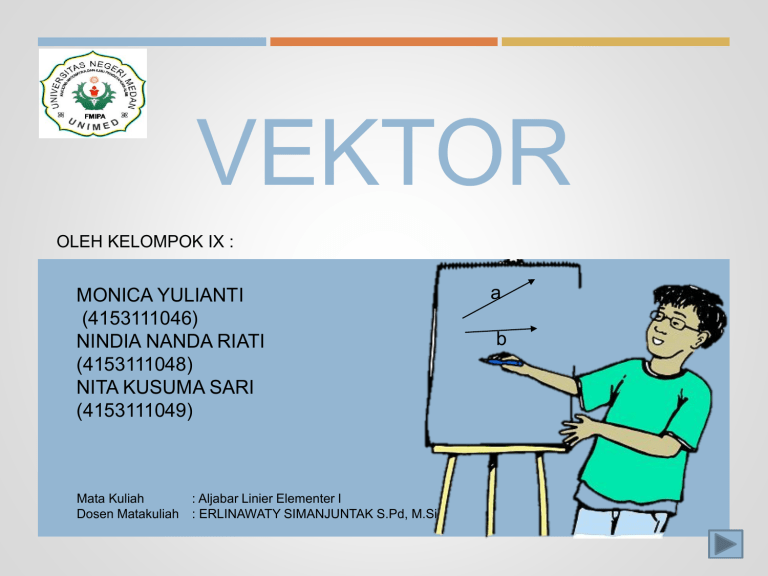 VEKTOR OLEH KELOMPOK IX : MONICA YULIANTI (4153111046) NINDIA NANDA RIATI (4153111048) NITA KUSUMA SARI (4153111049) Mata Kuliah Dosen Matakuliah : Aljabar Linier Elementer I : ERLINAWATY SIMANJUNTAK S.Pd, M.Si a b 1. PENDAHULUAN Ukuran fisis suatu benda dinyatakan secara kuantitas yaitu: Skalar : menyatakan besar. Vektor : menyatakan besar dan arah. Pada bagian ini vektor di ruang-2 dan di ruang-3 akan diperkenalkan secara geometris, operasi ilmu hitung (aritmatik) pada vektor tersebut akan didefinisikan, dan membahas beberapa sifat dasar . 2. ISTILAH DALAM VEKTOR Vektor-vektor dapat dinyatakan secara geometris sebagai segmen-segmen garis terarah atau panah-panah di ruang-2 atau ruang-3. Arah panah menentukan arah vektor dan panjang panah menyatakan besarnya vektor (magnitude). Ekor panah dinamakan titik awal (initial point) dari vektor Ujung panah dinamakan titik terminal (terminal point) Vektor-vektor yang mempuyai panjang dan arah yang sama dinamakan ekuivalen Vektor dinyatakan dengan: huruf kecil tebal, misal u, v, w, dan x Dua huruf kapital cetak tebal yang melambangkan titik awal dan titik ujung vektor tersebut, misal AB (vektor yang memanjang dari titik A dan titik B) Bilangan dalam vektor dinyatakan sebagai skalar. Semua sklaar merupakan bilangan riil dan dinyatakan dengan huruf kecil biasa, misalnya a, b, k, v, dan x (b) (a) (c) Gambar 1. (a) vektor a (b) vektor AB (c) vektor-vektor ekivalen 3. VEKTOR Definisi 3.1 Jika u dan v adalah vektor maka jumlah kedua vektor itu diperoleh dengan menggeser v sedemikian sehingga ekornya berimpit dengan kepala vektor u dan kemudian mendefinisikannya u + v sebagai vektor yang memanjang dari titik awal vektor u ke ujung vektor v. Definisi. Jika u dan v adalah sebarang dua vektor, maka jumlah u + v adalah vektor yang ditentukan sebagai berikut. Tempatkanlah vektor v sehingga titik awalnya berhimpit dengan titik terminal u. Vektor u + v dinyatakan oleh panah dari titik awal u terhadap titik terminal v. Definisi Untuk mencari jumlah , atau resultan, vektor u dan v , gerakkanlah v tanpa mengubah besarnya atau arahnya hingga pangkalnya berimpit dengan kepala u. Cara ini (disebut Hukum Segitiga) (a) (b) Gambar 2 (a) dan (b) penjumlahan vektor u + v Dalam gambar 2 (b) jelas bahwa u+v=v+u Definisi 3.1 dikenal dengan hukum jajaran-genjang untuk penjumlahan vektor. Sebab, dalam gambar 3.2, u + v adalah diagonal jajar genjang, dengan sisi-sisi u dan v. Untuk sembaran vektor v, kita mendefinisikan –v sebagai vektor yang di peroleh dari v dengan cara menukarkan ekor dan kepalanya. v + (-v) = 0 Vektor yang panjangnya nol dinamakan vektor nol (zero vektor) dan dinyatakan dengan 0. Kita definisikan : 0+v=v+0=v Definisi Jika u dan v adalah sebarang dua vektor, pengurangan v dari u didefinisikan oleh: u – v = u + (-v) Gambar 3 (a) dan (b) selisih u - v Definisi Untuk sembarang vektor v dan skalar k, mendefinisikan vektor kv sebagai vektor yang panjangnya adalah 𝑘 kali panjang vektor v dan yang arahnya sama dengan arah v jika 𝑘 > 0 atau arahnya sama dengan arah –v jika k < 0. Vektor kv dinamakan kelipatan skalar vektor v. Definisi Jika v adalah vektor tak nol dan k bilangan riil tak nol (skalar), maka hasil kali kv didefinisikan sebagai vektor yang panjangnya 𝑘 kali panjang v dan yang arahnya sama seperti arah v jika 𝑘 > 0 dan berlawanan dengan arah v jika k < 0. Kita definisikan kv = 0 jika k = 0 dan v = 0. 1 Gambar 4. melukiskan hubungan di antara vektor dan vektor 2 𝒗, −1 𝒗, 2𝒗, −3 𝒗 CONTOH: Nyatakan w dalam bentuk u dan v. Penyelesaian: Oleh kerena u + w = v , maka menyusul bahwa w = v – u 2 Dalam gambar 𝐴𝐵 = 3 𝐴𝐶. Nyatakan m dalam bentuk u dan v. Penyelesaian: 2 2 m = u + 𝐴𝐵 = u + 3 𝐴𝐶 = u + 3 𝐯 − 𝐮 1 = 3𝐮 + 2 𝐯 3 Secara lebih umum, jika 𝐴𝐵 = t𝐴𝐶, dimana 0 < 𝑡 < 1, maka m = (1 – t) u + tv Ekspresi yang baru saja diperoleh untuk m dapat pula dituliskan sebagai u + t(v – u) Jika diketahui vektor-vektor u, v, dan w pada gambar 5. Tunjukkan bagaimaa cara menentukan konstanta a dan b sehingga w = au + bv Penyelesaian : pertama-tama gambarkan sebuah garis yang melalui kepala vektor w, sejajar dengan v, sampai memotong perpanjangan u. Selanjutnya kita tarik garis melalui kepala w, sejajar dengan u sampai memotong v atau perpanjangannya. Karena OA + OB = w = au + bv, maka OA dan OB masing-masing tidak lain adalah au + bv. Skalar a sekarang dapat ditentukan dengan cara membandingkan panjang u dengan panjang au, begitu pula dapat ditentukan dengan cara membandingkan panjang v dengan panjang bv. (a) (b) Gambar 5 4. SISTEM KOORDINAT VEKTOR 4.1. Sistem koordinat vektor ruang-2 Misalkan v sebarang vektor pada bidang, v telah di tempatkan sehingga titik awalnya berada di titik asal sistem koordinat siku-siku. Koordinat (𝑣1 , 𝑣2 ) dari titik terminal v merupakan komponen-komponen v. Ditulis: v = (𝑣1 , 𝑣2 ) Operasi penjumlahan vektor dan operasi perkalian vektor dengan skalar sangat mudah dilakukan dalam komponen-komponen. Jika v = (𝑣1 , 𝑣2 ) dan w = (𝑤1 , 𝑤2 ) maka: v + w = (𝑣1 + 𝑤1 , 𝑣2 + 𝑤2 ) ..............................................................(1) Jika v = (𝑣1 , 𝑣2 ) dan k adalah sebarang skalar, maka kv = (𝑘𝑣1 , 𝑘𝑣2 ) ..............................................................(2) Karena v – w = v + (-w), diikuti rumus (1) dan (2) maka : v – w = (𝑣1 − 𝑤1 , 𝑣2 − 𝑤2 ) 4.2. Sistem koordinat vektor ruang-3 Vektor v dilokasikan sehingga titik awalnya berada di titik asal sisetm koordinat siku-siku, maka koordinat-koordinat titik terminal dinamakan komponen-komponen v. Ditulis: v = (𝑣1 , 𝑣2, 𝑣3 ) Jika v = (𝑣1 , 𝑣2, 𝑣3 ) dan w = (𝑤1 , 𝑤2, 𝑤3 ) , maka v + w = (𝑣1 + 𝑤1 , 𝑣2 + 𝑤2, 𝑣3 + 𝑤3 ) v – w =(𝑣1 − 𝑤1 , 𝑣2 − 𝑤2, 𝑣3 − 𝑤3 ) Jika v = (𝑣1 , 𝑣2, 𝑣3 ) dan k sebarang skalar, maka kv = (𝑘𝑣1 , 𝑘𝑣2, 𝑘𝑣3 ) Tiga v