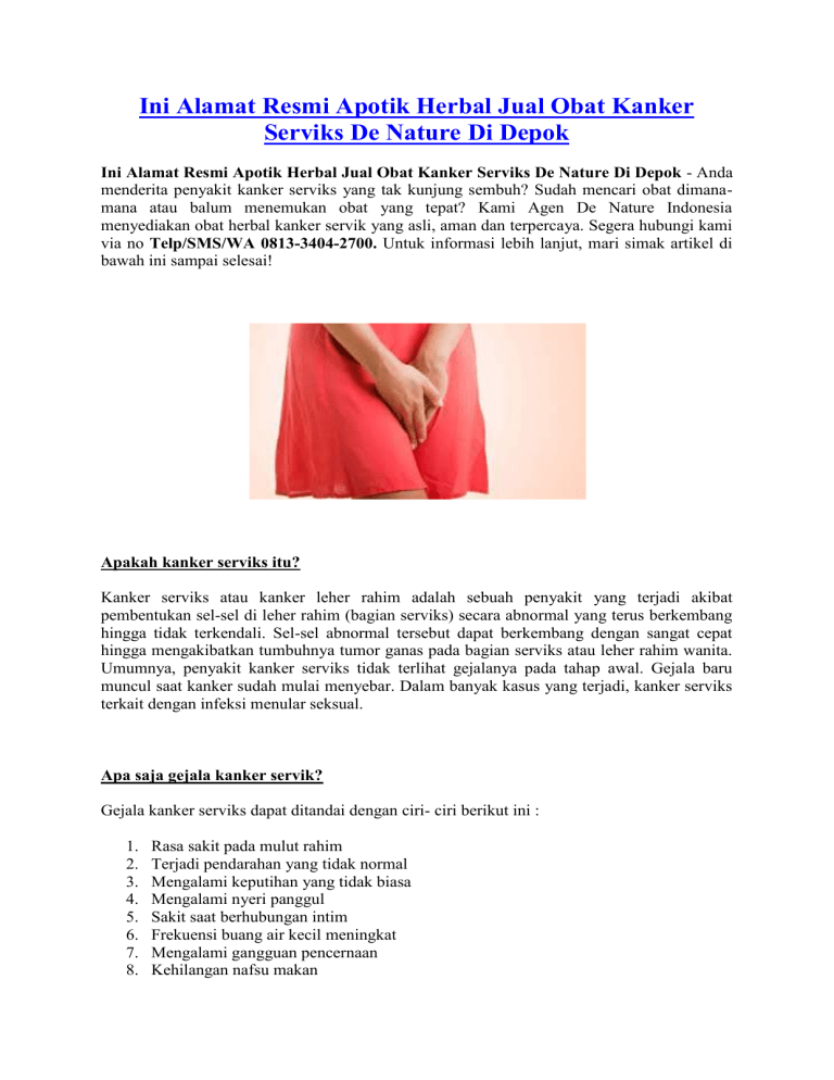 Ini Alamat Resmi Apotik Herbal Jual Obat Kanker Serviks De Nature Di Depok Ini Alamat Resmi Apotik Herbal Jual Obat Kanker Serviks De Nature Di Depok - Anda menderita penyakit kanker serviks yang tak kunjung sembuh? Sudah mencari obat dimanamana atau balum menemukan obat yang tepat? Kami Agen De Nature Indonesia menyediakan obat herbal kanker servik yang asli, aman dan terpercaya. Segera hubungi kami via no Telp/SMS/WA 0813-3404-2700. Untuk informasi lebih lanjut, mari simak artikel di bawah ini sampai selesai! Apakah kanker serviks itu? Kanker serviks atau kanker leher rahim adalah sebuah penyakit yang terjadi akibat pembentukan sel-sel di leher rahim (bagian serviks) secara abnormal yang terus berkembang hingga tidak terkendali. Sel-sel abnormal tersebut dapat berkembang dengan sangat cepat hingga mengakibatkan tumbuhnya tumor ganas pada bagian serviks atau leher rahim wanita. Umumnya, penyakit kanker serviks tidak terlihat gejalanya pada tahap awal. Gejala baru muncul saat kanker sudah mulai menyebar. Dalam banyak kasus yang terjadi, kanker serviks terkait dengan infeksi menular seksual. Apa saja gejala kanker servik? Gejala kanker serviks dapat ditandai dengan ciri- ciri berikut ini : 1. 2. 3. 4. 5. 6. 7. 8. Rasa sakit pada mulut rahim Terjadi pendarahan yang tidak normal Mengalami keputihan yang tidak biasa Mengalami nyeri panggul Sakit saat berhubungan intim Frekuensi buang air kecil meningkat Mengalami gangguan pencernaan Kehilangan nafsu makan 9. Mengalami kelelahan Akan tetapi banyak wanita yang tidak menyadari bahkan meremehkan tanda yang mereka alami yang mungkin bisa jadi gejala kanker serviks stadium awal. Lalu, apa saja pengobatan yang dapat dilakukan oleh penderita kanker serviks? Pengobatan Kanker Serviks Ada beberapa langkah pengobatan yang dapat dilakukan untuk menyembuhkan kanker serviks yang sedang Anda derita yaitu dengan cara Operasi, Radioterapi, ataupun Kemoterapi. Akan tetapi cara pengobatan tersebut ternyata tidak seefektif yang pasien harapkan. Penyakit ini bisa semakin kronis dan muncul kembali meskipun pengobatanya sudah dilakukan. Tapi jangan khawatir karena berbagai penelitian kesehatan yang dilakukan oleh orang berkompeten selalu berupaya menemukan pengobatan yang benar-benar efektif untuk penyakit ini. Baca Juga : Apotik Herbal Jual Obat Kanker Serviks De Nature Di Kota Jakarta Utara Obat herbal De Nature adalah satu-satunya solusi terbaik bagi Anda untuk mendapatkan pengobatan yang ampuh untuk penyakit kanker serviks yang sedang Anda derita saat ini. Obat herbal De Nature sudah teruji secara klinis bahwa obat herbal De Nature memiliki kandungan antioksidan yang sangat tinggi di mana zat antioksidan ini merupakan zat antikanker yang mampu menghambat atau menekan pertumbuhan dan perkembangan sel-sel kanker dalam tubuh Anda. Kini Anda tidak perlu ragu untuk melakukan pemesanan obat herbal De Nature yang asli, karena sekarang Anda telah menemukan situs yang tepat. Kami Agen obat herbal de nature yang asli dan terpercaya, jadi Anda tidak perlu lagi khawatir untuk melakukan pemesanan. Untuk mendapatkan produk yang asli segera hubungi no Telp/SMS/ Wa 0813-3404-2700. OBAT HERBAL KANKER SERVIKS ZIIRZAX & TYPHOGELL DE NATURE Untuk Pemesana Produk Yang Asli Hubungi Via Telp/SMS/ Wa : 0813-3404-2700 Harga Obat Kanker Serviks De Nature : Paket 1 minggu : Rp 315.000 (Terdiri dari 1 botol Ziirzax dan 1 botol Typhogell) Paket 1 bulan : Rp 1.150.000 (Terdiri dari 4 botol Ziirzax dan 4 botol Typhogell) hemat Rp 110.000 Paket 2 bulan : Rp 1.995.000 (Terdiri dari 8 botol Ziirzak dan 8 botol Typhogell) hemat Rp 525.000 Obat Kanker Serviks De Nature berisi : 1 Botol Ziirzax isi 50 Kapsul 1 Botol Typhogell isi 50 Kapsul Aturan Minum: Kapsul Ziirzax diminum 3 kali Sehari 2 kapsul/btl 1 jam sebelum makan. Kapsul Typhogell diminum 3 kali Sehari 2 kapsul/btl 1 jam sebelum makan. (Belum termasuk ongkir) Obat Herbal Ziirzax De Nature Obat kanker alami de nature ziirzax diproduksi dari daun dan buah sirsak alami yang mempunyai banyak manfaat, dipadukan dengan bahan- bahan herbal lainya yang dapat membantu menyembuhkan penyakit kanker. Tiap kapsul obat kanker alami de nature ziirzax mengandung ekstrak yang setara dengan Annonane muricata folium 2500 mg. Obat kanker alami de nature ziirzax ini mempunyai banyak khasiat yang dapat membantu anda dalam mempercepat penyembuhan penyakit kanker dalam tubuh anda. Serta daun sirsak juga dapat membunuh dan memperbaiki tingkat kesehatan dalam tubuh. Obat Herbal Thypogell De Nature Obat kanker alami de nature typhogell diproduksi dari tanaman keladi tikus (Typhonium flagelliforme) yang digunakan sebagai obat kanker payudara. Tiap kapsul obat de nature mengandung ekstrak yang setara dengan Typhonium flagelliforme 500 mg Rhizoma exstra. Obat kanker alami de nature typhogell mempunyai banyak khasiat bagi tubuh anda.Sebagai imunitas antikanker, antimikrobia dan antioksidan. Penghambat pertumbuhan sel- sel kanker. Mengurangi efek buruk kemoterapi. Anti virus dan anti bakteri. Mengatasi diabetes. Mengatasi hipertensi. Meningkatkan kekebalan tubuh. Anda bisa sembuh lebih cepat dengan mengonsumsi obat herbal de nature dibandingkan dengan mengonsumsi obat herbal yang ada dipasaran. Karena obat herbal de nature terbuat dari bahan- bahan alami yang sudah terbukti khasiatnya dan diproduksi langsung oleh para ahli yang handal, dan produk kami diterima langsung oleh para konsumen secara langsung. Sekarang Anda tidak perlu khawatir untuk melakukan pemesanan produk obat herbal de nature kami. Anda cukup duduk nyaman kemudian lakukan pesanan obat herbal de nature yang Anda butuhkan. Obat herbal De Nature tidak dipasarkan di apotik ataupun toko- toko obat manapun. Untuk memudahkan Anda dalam membeli obat herbal de nature kami. Oleh sebab itu semua obat De Nature yang Anda cari hanya dijual via online. Dan hanya dipromosikan melalui situs website. Melalui website kami yang sedang Anda kunjungi, merupakan solusi terbaik untuk pemesanan obat De Nature yang asli bisa A