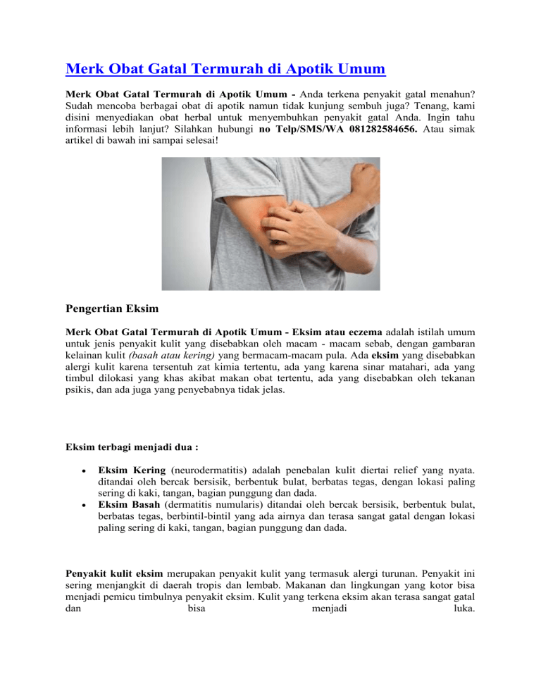 Merk Obat Gatal Termurah di Apotik Umum Merk Obat Gatal Termurah di Apotik Umum - Anda terkena penyakit gatal menahun? Sudah mencoba berbagai obat di apotik namun tidak kunjung sembuh juga? Tenang, kami disini menyediakan obat herbal untuk menyembuhkan penyakit gatal Anda. Ingin tahu informasi lebih lanjut? Silahkan hubungi no Telp/SMS/WA 081282584656. Atau simak artikel di bawah ini sampai selesai! Pengertian Eksim Merk Obat Gatal Termurah di Apotik Umum - Eksim atau eczema adalah istilah umum untuk jenis penyakit kulit yang disebabkan oleh macam - macam sebab, dengan gambaran kelainan kulit (basah atau kering) yang bermacam-macam pula. Ada eksim yang disebabkan alergi kulit karena tersentuh zat kimia tertentu, ada yang karena sinar matahari, ada yang timbul dilokasi yang khas akibat makan obat tertentu, ada yang disebabkan oleh tekanan psikis, dan ada juga yang penyebabnya tidak jelas. Eksim terbagi menjadi dua : Eksim Kering (neurodermatitis) adalah penebalan kulit diertai relief yang nyata. ditandai oleh bercak bersisik, berbentuk bulat, berbatas tegas, dengan lokasi paling sering di kaki, tangan, bagian punggung dan dada. Eksim Basah (dermatitis numularis) ditandai oleh bercak bersisik, berbentuk bulat, berbatas tegas, berbintil-bintil yang ada airnya dan terasa sangat gatal dengan lokasi paling sering di kaki, tangan, bagian punggung dan dada. Penyakit kulit eksim merupakan penyakit kulit yang termasuk alergi turunan. Penyakit ini sering menjangkit di daerah tropis dan lembab. Makanan dan lingkungan yang kotor bisa menjadi pemicu timbulnya penyakit eksim. Kulit yang terkena eksim akan terasa sangat gatal dan bisa menjadi luka. Biasanya eksim diawali dengan rasa gatal, panas, dan merah di bagian permukaan tubuh yang terserang. Kemudian timbul lepuh dikulit yang berwarna merah tadi. Sebagian atau seluruh lepuh dapat berisi nanah yang mudah pecah. Dalam keadaan ini eksim dikenal dengan eksim basah. Lama kelamaan lepuh mengering dan mengeropeng yang disebut eksim kering. Eksim kering dapat berubah lagi menjadi eksim basah jika lepuh bernanah timbul lagi. Harga Rp 295.000 Informasi lebih lanjut hubungi Telp/SMS/WA 081282584656 Apa Saja Gejala Eksim? Merk Obat Gatal Termurah di Apotik Umum - Dimanapun lokasi timbulnya eksim, gejala utama yang dirasakan pasien adalah gatal. Terkadang rasa gatal sudah muncul sebelum ada tanda kemerahan pada kulit. Gejala kemerahan biasanya akan muncul pada wajah, lutut, tangan dan kaki, namun tidak menutup kemungkinan kemerahan muncul di daerah lain. Daerah yang terkena akan terasa sangat kering, menebal atau keropeng. Pada orang kulit putih, daerah ini pada mulanya akan berwarna merah muda lalu berubah menjadi cokelat. Sementara itu pada orang dengan kulit lebih gelap, eksim akan mempengaruhi pigmen kulit sehingga daerah eksim akan tampak lebih terang atau lebih gelap. Apa yang Menjadi Penyebab Eksim Merk Obat Gatal Termurah di Apotik Umum - Penyebab dari eksim sebenarnya belum diketahui dengan pasti, namun beberapa ahli mencurigai eksim berhubungan dengan aktifitas daya pertahanan tubuh (imun) yang berlebihan. Hal ini menyebabkan tubuh mengalami reaksi berlebihan terhadap bakteri atau iritan yang sebenarnya tidak berbahaya pada kulit. Oleh karena itu, eksim banyak ditemukan pada keluarga dengan riwayat penyakit alergi atau asma. Tiap tiap orang mempunyai pencetus eksim yang berbeda beda. Ada orang yang setelah memegang sabun atau deterjen akan merasakan gatal yang luar biasa, ada pula yang disebabkan oleh bahan atau alat rumah tangga yang lain. Gejala yang timbul pun bervariasi, ada yang gatalnya ringan tetapi rasa panas yang dominan, ada pula yang sebaliknya. Infeksi saluran nafas bagian atas atau flu juga bisa menjadi pencetus timbulnya eksim. Stress yang dialami penderita akan membuat gejala menjadi lebih buruk. Jenis – Jenis Penyakit Gatal Eksim : 1. Dermatitis atopik : salah satu jenis eksim yang paling sering dijumpai dan merupakan penyakit turunan. Dermatitis atopik umumnya dimulai ketika bayi dan masih anakanak dengan gejala berupa gatal, radang kulit, dan pada sebagian penderita sering timbul asma dan demam hay (hay fever). 2. Dermatitis kontak : meliputi dermatitis kontak alergik dan iritan. Dermatitis kontak alergik disebabkan oleh reaksi kekebalan tertunda (delayed immune system) akibat kontak kulit dengan senyawa alergenik sehingga menyebabkan radang kulit dalam 48 jam setelah paparan terjadi. Beberapa agen penyebab eksim jenis ini adalah jelatang, parfum, pengawet kosmetik, metal, dan pewarna. 3. Dermatitis kontak iritan terjadi karena paparan senyawa iritan yang dapat merusak kulit secara kimiawi, contohnya sabun keras, detergen, dan produk pembersih lainnya. Senyawa iritan tersebut dapat menghilangkan minyak dan kelembaban dari lapisan luar kulit, kemudian merusak lapisan pelindung dan memicu terjadinya peradangan. 4. Eksim numular : beberapa plak eksim yang biasanya berhubungan dengan kulit kering dan terjadi pada bagian luar dari kaki, tangan, dan lengan. 5. Eksim stasis : jenis eksim kronis pada daerah bawah kaki bagian dalam yang berkaitan dengan varises. Pertanyaan yang sering terpikirkan di benak Anda : Jika Saya terlanjur kena penyakit eksim, bagaimana cara mengobatinya? Bagaimana cara mengobati penyakit eksim dengan cepat dan tuntas? Bagaimana berobat yang mudah tanpa perlu malu untuk ke dokter? Jawabannya: semua bisa, asal Anda memilih produk yang tepat, yaitu Eximtas, Kapsul BD De Nature dan Salep Exclear. Pengobatan Penyakit Eksim Merk Obat Gatal Termurah di Apotik Umum - Pengobatan Eksim secara tradisional yaitu dengan menggunakan Obat Eksim dari De Nature. Produk yang terbuat dari bahan herbal alami diramu dengan resep tradisional dan diolah secara teknologi modern, sehingga aman di konsumsi. Jadi anda juga tak perlu khawatir karena Obat Herbal De Nature yang kami tawarkan ini, Alhamdulillah, merupakan obat yang telah banyak menyembuhkan penderitanya baik dari dalam maupun luar negeri. Sudah banyak pasien kami yang merasaka