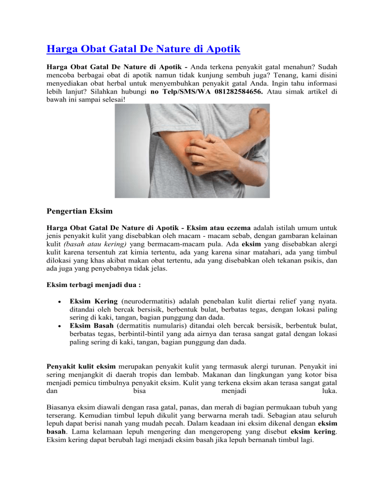 Harga Obat Gatal De Nature di Apotik Harga Obat Gatal De Nature di Apotik - Anda terkena penyakit gatal menahun? Sudah mencoba berbagai obat di apotik namun tidak kunjung sembuh juga? Tenang, kami disini menyediakan obat herbal untuk menyembuhkan penyakit gatal Anda. Ingin tahu informasi lebih lanjut? Silahkan hubungi no Telp/SMS/WA 081282584656. Atau simak artikel di bawah ini sampai selesai! Pengertian Eksim Harga Obat Gatal De Nature di Apotik - Eksim atau eczema adalah istilah umum untuk jenis penyakit kulit yang disebabkan oleh macam - macam sebab, dengan gambaran kelainan kulit (basah atau kering) yang bermacam-macam pula. Ada eksim yang disebabkan alergi kulit karena tersentuh zat kimia tertentu, ada yang karena sinar matahari, ada yang timbul dilokasi yang khas akibat makan obat tertentu, ada yang disebabkan oleh tekanan psikis, dan ada juga yang penyebabnya tidak jelas. Eksim terbagi menjadi dua : Eksim Kering (neurodermatitis) adalah penebalan kulit diertai relief yang nyata. ditandai oleh bercak bersisik, berbentuk bulat, berbatas tegas, dengan lokasi paling sering di kaki, tangan, bagian punggung dan dada. Eksim Basah (dermatitis numularis) ditandai oleh bercak bersisik, berbentuk bulat, berbatas tegas, berbintil-bintil yang ada airnya dan terasa sangat gatal dengan lokasi paling sering di kaki, tangan, bagian punggung dan dada. Penyakit kulit eksim merupakan penyakit kulit yang termasuk alergi turunan. Penyakit ini sering menjangkit di daerah tropis dan lembab. Makanan dan lingkungan yang kotor bisa menjadi pemicu timbulnya penyakit eksim. Kulit yang terkena eksim akan terasa sangat gatal dan bisa menjadi luka. Biasanya eksim diawali dengan rasa gatal, panas, dan merah di bagian permukaan tubuh yang terserang. Kemudian timbul lepuh dikulit yang berwarna merah tadi. Sebagian atau seluruh lepuh dapat berisi nanah yang mudah pecah. Dalam keadaan ini eksim dikenal dengan eksim basah. Lama kelamaan lepuh mengering dan mengeropeng yang disebut eksim kering. Eksim kering dapat berubah lagi menjadi eksim basah jika lepuh bernanah timbul lagi. Harga Rp 295.000 Informasi lebih lanjut hubungi Telp/SMS/WA 081282584656 Apa Saja Gejala Eksim? Harga Obat Gatal De Nature di Apotik - Dimanapun lokasi timbulnya eksim, gejala utama yang dirasakan pasien adalah gatal. Terkadang rasa gatal sudah muncul sebelum ada tanda kemerahan pada kulit. Gejala kemerahan biasanya akan muncul pada wajah, lutut, tangan dan kaki, namun tidak menutup kemungkinan kemerahan muncul di daerah lain. Daerah yang terkena akan terasa sangat kering, menebal atau keropeng. Pada orang kulit putih, daerah ini pada mulanya akan berwarna merah muda lalu berubah menjadi cokelat. Sementara itu pada orang dengan kulit lebih gelap, eksim akan mempengaruhi pigmen kulit sehingga daerah eksim akan tampak lebih terang atau lebih gelap. Apa yang Menjadi Penyebab Eksim Harga Obat Gatal De Nature di Apotik - Penyebab dari eksim sebenarnya belum diketahui dengan pasti, namun beberapa ahli mencurigai eksim berhubungan dengan aktifitas daya pertahanan tubuh (imun) yang berlebihan. Hal ini menyebabkan tubuh mengalami reaksi berlebihan terhadap bakteri atau iritan yang sebenarnya tidak berbahaya pada kulit. Oleh karena itu, eksim banyak ditemukan pada keluarga dengan riwayat penyakit alergi atau asma. Tiap tiap orang mempunyai pencetus eksim yang berbeda beda. Ada orang yang setelah memegang sabun atau deterjen akan merasakan gatal yang luar biasa, ada pula yang disebabkan oleh bahan atau alat rumah tangga yang lain. Gejala yang timbul pun bervariasi, ada yang gatalnya ringan tetapi rasa panas yang dominan, ada pula yang sebaliknya. Infeksi saluran nafas bagian atas atau flu juga bisa menjadi pencetus timbulnya eksim. Stress yang dialami penderita akan membuat gejala menjadi lebih buruk. Jenis – Jenis Penyakit Gatal Eksim : 1. Dermatitis atopik : salah satu jenis eksim yang paling sering dijumpai dan merupakan penyakit turunan. Dermatitis atopik umumnya dimulai ketika bayi dan masih anakanak dengan gejala berupa gatal, radang kulit, dan pada sebagian penderita sering timbul asma dan demam hay (hay fever). 2. Dermatitis kontak : meliputi dermatitis kontak alergik dan iritan. Dermatitis kontak alergik disebabkan oleh reaksi kekebalan tertunda (delayed immune system) akibat kontak kulit dengan senyawa alergenik sehingga menyebabkan radang kulit dalam 48 jam setelah paparan terjadi. Beberapa agen penyebab eksim jenis ini adalah jelatang, parfum, pengawet kosmetik, metal, dan pewarna. 3. Dermatitis kontak iritan terjadi karena paparan senyawa iritan yang dapat merusak kulit secara kimiawi, contohnya sabun keras, detergen, dan produk pembersih lainnya. Senyawa iritan tersebut dapat menghilangkan minyak dan kelembaban dari lapisan luar kulit, kemudian merusak lapisan pelindung dan memicu terjadinya peradangan. 4. Eksim numular : beberapa plak eksim yang biasanya berhubungan dengan kulit kering dan terjadi pada bagian luar dari kaki, tangan, dan lengan. 5. Eksim stasis : jenis eksim kronis pada daerah bawah kaki bagian dalam yang berkaitan dengan varises. Pertanyaan yang sering terpikirkan di benak Anda : Jika Saya terlanjur kena penyakit eksim, bagaimana cara mengobatinya? Bagaimana cara mengobati penyakit eksim dengan cepat dan tuntas? Bagaimana berobat yang mudah tanpa perlu malu untuk ke dokter? Jawabannya: semua bisa, asal Anda memilih produk yang tepat, yaitu Eximtas, Kapsul BD De Nature dan Salep Exclear. Pengobatan Penyakit Eksim Harga Obat Gatal De Nature di Apotik - Pengobatan Eksim secara tradisional yaitu dengan menggunakan Obat Eksim dari De Nature. Produk yang terbuat dari bahan herbal alami diramu dengan resep tradisional dan diolah secara teknologi modern, sehingga aman di konsumsi. Jadi anda juga tak perlu khawatir karena Obat Herbal De Nature yang kami tawarkan ini, Alhamdulillah, merupakan obat yang telah banyak menyembuhkan penderitanya baik dari dalam maupun luar negeri. Sudah banyak pasien kami yang merasakan kesembuhannya de