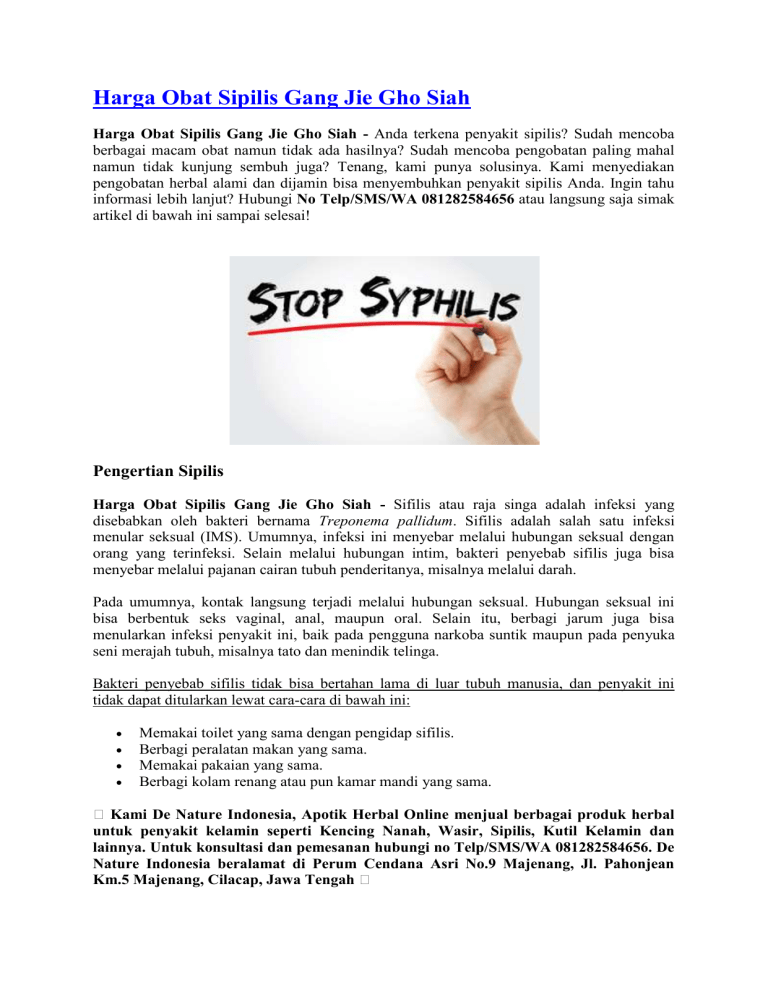 Harga Obat Sipilis Gang Jie Gho Siah Harga Obat Sipilis Gang Jie Gho Siah - Anda terkena penyakit sipilis? Sudah mencoba berbagai macam obat namun tidak ada hasilnya? Sudah mencoba pengobatan paling mahal namun tidak kunjung sembuh juga? Tenang, kami punya solusinya. Kami menyediakan pengobatan herbal alami dan dijamin bisa menyembuhkan penyakit sipilis Anda. Ingin tahu informasi lebih lanjut? Hubungi No Telp/SMS/WA 081282584656 atau langsung saja simak artikel di bawah ini sampai selesai! Pengertian Sipilis Harga Obat Sipilis Gang Jie Gho Siah - Sifilis atau raja singa adalah infeksi yang disebabkan oleh bakteri bernama Treponema pallidum. Sifilis adalah salah satu infeksi menular seksual (IMS). Umumnya, infeksi ini menyebar melalui hubungan seksual dengan orang yang terinfeksi. Selain melalui hubungan intim, bakteri penyebab sifilis juga bisa menyebar melalui pajanan cairan tubuh penderitanya, misalnya melalui darah. Pada umumnya, kontak langsung terjadi melalui hubungan seksual. Hubungan seksual ini bisa berbentuk seks vaginal, anal, maupun oral. Selain itu, berbagi jarum juga bisa menularkan infeksi penyakit ini, baik pada pengguna narkoba suntik maupun pada penyuka seni merajah tubuh, misalnya tato dan menindik telinga. Bakteri penyebab sifilis tidak bisa bertahan lama di luar tubuh manusia, dan penyakit ini tidak dapat ditularkan lewat cara-cara di bawah ini: Memakai toilet yang sama dengan pengidap sifilis. Berbagi peralatan makan yang sama. Memakai pakaian yang sama. Berbagi kolam renang atau pun kamar mandi yang sama. � Kami De Nature Indonesia, Apotik Herbal Online menjual berbagai produk herbal untuk penyakit kelamin seperti Kencing Nanah, Wasir, Sipilis, Kutil Kelamin dan lainnya. Untuk konsultasi dan pemesanan hubungi no Telp/SMS/WA 081282584656. De Nature Indonesia beralamat di Perum Cendana Asri No.9 Majenang, Jl. Pahonjean Km.5 Majenang, Cilacap, Jawa Tengah � Tahapan Sipilis Gejala pertama sifilis muncul sekitar tiga minggu setelah bakteri memasuki tubuh. Infeksi sifilis terbagi menjadi empat tahapan utama, antara lain: � Sifilis Primer Penderita sifilis mengalami gejala yang dimulai dengan lesi atau luka pada alat kelamin atau di dalam dan di sekitar mulut. Luka yang terjadi berbentuk seperti gigitan serangga tapi tidak menimbulkan rasa sakit. Pada tahap ini, jika orang yang terinfeksi berhubungan seksual dengan orang lain, penularan sangat mudah terjadi. Luka ini bertahan selama 1-2 bulan. Pada akhirnya, lesi ini akan sembuh tanpa meninggalkan bekas. � Sifilis Sekunder Penderita sifilis sekunder akan mengalami ruam merah serukuran koin kecil dan biasanya ruam ini muncul pada telapak tangan dan telapak kaki. Gejala lain yang mungkin muncul adalah demam, nafsu makan menurun, radang tenggorokan dan kutil kelamin. Fase ini bisa bertahan selama satu hingga tiga bulan. � Sifilis Laten Setelah fase sifilis sekunder, sifilis seakan-akan menghilang dan tidak menimbulkan gejala sama sekali. Masa laten ini bisa bertahan sekitar dua tahun sebelum kemudian lanjut ke masa yang paling berbahaya dalam infeksi sifilis yaitu sifilis tersier. � Sifilis Tersier Jika infeksi tidak terobati, sifilis akan berkembang ke tahapan akhir, yaitu sifilis tersier. Pada tahap ini, infeksi bisa memberi efek yang serius pada tubuh. Beberapa akibat dari infeksi pada tahapan ini adalah kelumpuhan, kebutaan, demensia, masalah pendengaran, impotensi, dan bahkan kematian jika tidak ditangani. Sifilis paling mudah menular pada fase sifilis primer dan sekunder. Jika Anda merasa terinfeksi sifilis, segera periksakan diri ke dokter atau klinik spesialis penyakit kelamin untuk memastikan diagnosis terhadap sifilis. Makin cepat sifilis diobati, makin kecil kemungkinan sifilis berkembang menjadi penyakit yang serius. GEJALA ATAU TANDA PENYAKIT SIPILIS Harga Obat Sipilis Gang Jie Gho Siah - Penyakit sipilis bisa menyebabkan kerusakan organ-organ tubuh. Kerusakan tersebut bisa menimpa syaraf, otak, otot, tulang, mata, serta organ bagian tubuh yang lainnya. Bahkan, jika sudah stadium lajut penyakit ini dapat menyebabkan kematian pada si penderita.Penyakit kelamin yang satu ini memang tidak boleh dianggap remeh. Perlu Anda ketahui bahwa penyakit ini akan menggerogoti sistem kekebalan tubuh penderita sehingga tubuh si penderita akan sangat mudah terkena penyakit dan bertambah parah karena infeksi dari bakteri penyebab penyakit ini menyebar keseluruh tubuh dengan cepat. Untuk itu sebaiknya kita dapat mengenali tanda-tanda penyakit kelamin ini melalui gejala yang muncul. Informasi lebih lanjut hubungi Telp/SMS/WA 081282584656 Gejala/Tanda Penyakit Sipilis Pada Wanita 1. Keluarnya cairan tidak normal dari saluran kencing atau liang senggama 2. Timbulnya keputihan yang banyak, berbau amis, dan warnanya cenderung putih kehijauan. 3. Rasa nyeri ketika buang air kecil 4. Rasa nyeri saat berhubungan seksual 5. Timbulnya rasa gatal di alat kelamin atau sekitarnya dan menjadi luka koreng di kelamin. 6. Timbulnya luka kecil (terkadang tidak terasa sakit) disertai pembengkakan kelenjar getah bening. 7. Terjadinya perubahan warna kulit dan mata komplikasi bartolitis, yaitu membengkaknya kelenjar Bartholin mengakibatkan kesulitan berjalan karena rasa nyeri. Gejala/Tanda Penyakit Sipilis Pada Pria Sering nyeri selama hubungan seksual. Nyeri ketika buang air kecil. Keluarnya cairan atau kotoran dari penis laki-laki. Ada luka kerongkongan pada orang-orang melakukan oral sek, sehingga kerongkongan sering terasa sakit. Nyeri pada daerah sekitar anus (hal ini terjadi pada orang-orang melakukan anal sex). Luka memerah tanpa rasa sakit pada daerah kelamin, anus, kerongkongan dan atau lidah. Bintik merah pada kulit dan menjadi luka koreng di kelamin. Timbulnya bersisik pada telapak tangan dan telapak kaki. Urine (air kencing) berwarna cenderung gelap, feses berwarna terang. Mata dan kulit cendrung berwarna kuning. Timbulnya bentuk lepuh kecil pada daerah kelamin, dimana itu bisa berubah menjadi koreng. Pembengkakan pada kelenjar 