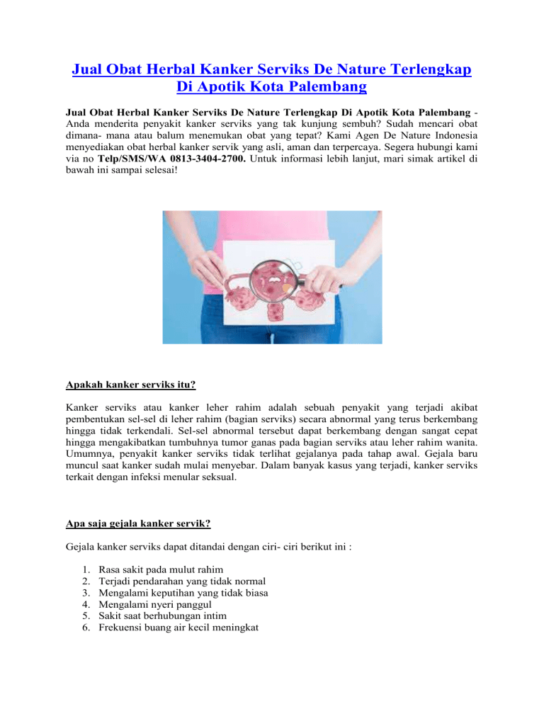 Jual Obat Herbal Kanker Serviks De Nature Terlengkap Di Apotik Kota Palembang Jual Obat Herbal Kanker Serviks De Nature Terlengkap Di Apotik Kota Palembang Anda menderita penyakit kanker serviks yang tak kunjung sembuh? Sudah mencari obat dimana- mana atau balum menemukan obat yang tepat? Kami Agen De Nature Indonesia menyediakan obat herbal kanker servik yang asli, aman dan terpercaya. Segera hubungi kami via no Telp/SMS/WA 0813-3404-2700. Untuk informasi lebih lanjut, mari simak artikel di bawah ini sampai selesai! Apakah kanker serviks itu? Kanker serviks atau kanker leher rahim adalah sebuah penyakit yang terjadi akibat pembentukan sel-sel di leher rahim (bagian serviks) secara abnormal yang terus berkembang hingga tidak terkendali. Sel-sel abnormal tersebut dapat berkembang dengan sangat cepat hingga mengakibatkan tumbuhnya tumor ganas pada bagian serviks atau leher rahim wanita. Umumnya, penyakit kanker serviks tidak terlihat gejalanya pada tahap awal. Gejala baru muncul saat kanker sudah mulai menyebar. Dalam banyak kasus yang terjadi, kanker serviks terkait dengan infeksi menular seksual. Apa saja gejala kanker servik? Gejala kanker serviks dapat ditandai dengan ciri- ciri berikut ini : 1. 2. 3. 4. 5. 6. Rasa sakit pada mulut rahim Terjadi pendarahan yang tidak normal Mengalami keputihan yang tidak biasa Mengalami nyeri panggul Sakit saat berhubungan intim Frekuensi buang air kecil meningkat 7. Mengalami gangguan pencernaan 8. Kehilangan nafsu makan 9. Mengalami kelelahan Akan tetapi banyak wanita yang tidak menyadari bahkan meremehkan tanda yang mereka alami yang mungkin bisa jadi gejala kanker serviks stadium awal. Lalu, apa saja pengobatan yang dapat dilakukan oleh penderita kanker serviks? Pengobatan Kanker Serviks Ada beberapa langkah pengobatan yang dapat dilakukan untuk menyembuhkan kanker serviks yang sedang Anda derita yaitu dengan cara Operasi, Radioterapi, ataupun Kemoterapi. Akan tetapi cara pengobatan tersebut ternyata tidak seefektif yang pasien harapkan. Penyakit ini bisa semakin kronis dan muncul kembali meskipun pengobatanya sudah dilakukan. Tapi jangan khawatir karena berbagai penelitian kesehatan yang dilakukan oleh orang berkompeten selalu berupaya menemukan pengobatan yang benar-benar efektif untuk penyakit ini. Baca Juga : Alamat Distributor Jual Obat Kanker Serviks De Nature Di Tangerang Obat herbal De Nature adalah satu-satunya solusi terbaik bagi Anda untuk mendapatkan pengobatan yang ampuh untuk penyakit kanker serviks yang sedang Anda derita saat ini. Obat herbal De Nature sudah teruji secara klinis bahwa obat herbal De Nature memiliki kandungan antioksidan yang sangat tinggi di mana zat antioksidan ini merupakan zat antikanker yang mampu menghambat atau menekan pertumbuhan dan perkembangan sel-sel kanker dalam tubuh Anda. Kini Anda tidak perlu ragu untuk melakukan pemesanan obat herbal De Nature yang asli, karena sekarang Anda telah menemukan situs yang tepat. Kami Agen obat herbal de nature yang asli dan terpercaya, jadi Anda tidak perlu lagi khawatir untuk melakukan pemesanan. Untuk mendapatkan produk yang asli segera hubungi no Telp/SMS/ Wa 0813-3404-2700. OBAT HERBAL KANKER SERVIKS ZIIRZAX & TYPHOGELL DE NATURE Pemesanan Produk Hubungi no Telp/SMS/ Wa 0813-3404-2700 Harga Obat Kanker Serviks De Nature : Paket 1 minggu : Rp 315.000 (Terdiri dari 1 botol Ziirzax dan 1 botol Typhogell) Paket 1 bulan : Rp 1.150.000 (Terdiri dari 4 botol Ziirzax dan 4 botol Typhogell) hemat Rp 110.000 Paket 2 bulan : Rp 1.995.000 (Terdiri dari 8 botol Ziirzak dan 8 botol Typhogell) hemat Rp 525.000 Obat Kanker Serviks De Nature berisi : 1 Botol Ziirzax isi 50 Kapsul 1 Botol Typhogell isi 50 Kapsul Aturan Minum: Kapsul Ziirzax diminum 3 kali Sehari 2 kapsul/btl 1 jam sebelum makan. Kapsul Typhogell diminum 3 kali Sehari 2 kapsul/btl 1 jam sebelum makan. (Belum termasuk ongkir) Obat Herbal Ziirzax De Nature Obat kanker alami de nature ziirzax diproduksi dari daun dan buah sirsak alami yang mempunyai banyak manfaat, dipadukan dengan bahan- bahan herbal lainya yang dapat membantu menyembuhkan penyakit kanker. Tiap kapsul obat kanker alami de nature ziirzax mengandung ekstrak yang setara dengan Annonane muricata folium 2500 mg. Obat kanker alami de nature ziirzax ini mempunyai banyak khasiat yang dapat membantu anda dalam mempercepat penyembuhan penyakit kanker dalam tubuh anda. Serta daun sirsak juga dapat membunuh dan memperbaiki tingkat kesehatan dalam tubuh. Obat Herbal Thypogell De Nature Obat kanker alami de nature typhogell diproduksi dari tanaman keladi tikus (Typhonium flagelliforme) yang digunakan sebagai obat kanker payudara. Tiap kapsul obat de nature mengandung ekstrak yang setara dengan Typhonium flagelliforme 500 mg Rhizoma exstra. Obat kanker alami de nature typhogell mempunyai banyak khasiat bagi tubuh anda.Sebagai imunitas antikanker, antimikrobia dan antioksidan. Penghambat pertumbuhan sel- sel kanker. Mengurangi efek buruk kemoterapi. Anti virus dan anti bakteri. Mengatasi diabetes. Mengatasi hipertensi. Meningkatkan kekebalan tubuh. Anda bisa sembuh lebih cepat dengan mengonsumsi obat herbal de nature dibandingkan dengan mengonsumsi obat herbal yang ada dipasaran. Karena obat herbal de nature terbuat dari bahan- bahan alami yang sudah terbukti khasiatnya dan diproduksi langsung oleh para ahli yang handal, dan produk kami diterima langsung oleh para konsumen secara langsung. Sekarang Anda tidak perlu khawatir untuk melakukan pemesanan produk obat herbal de nature kami. Anda cukup duduk nyaman kemudian lakukan pesanan obat herbal de nature yang Anda butuhkan. Obat herbal De Nature tidak dipasarkan di apotik ataupun toko- toko obat manapun. Untuk memudahkan Anda dalam membeli obat herbal de nature kami. Oleh sebab itu semua obat De Nature yang Anda cari hanya dijual via online. Dan hanya dipromosikan melalui situs website. Melalui website kami yang sedang Anda kunjungi, merupakan solusi terbaik untuk pemesanan obat De Nature yang asli bisa Anda dapatkan. In