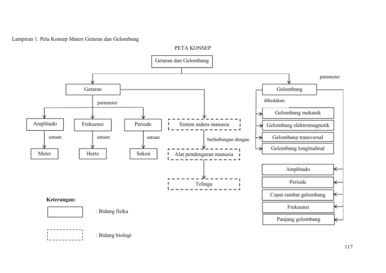 Lampiran 1. Peta Konsep Materi Getaran dan Gelombang PETA KONSEP Getaran dan Gelombang parameter Getaran Gelombang dibedakan parameter Gelombang mekanik Amplitudo satuan Frekuensi satuan Periode satuan Sistem indera manusia berhubungan dengan Gelombang elektromagnetik Gelombang transversal Gelombang longitudinal Meter Hertz Sekon Alat pendengaran manusia Amplitudo Telinga Periode Cepat rambat gelombang Keterangan: : Bidang fisika Frekuensi Panjang gelombang : Bidang biologi 117