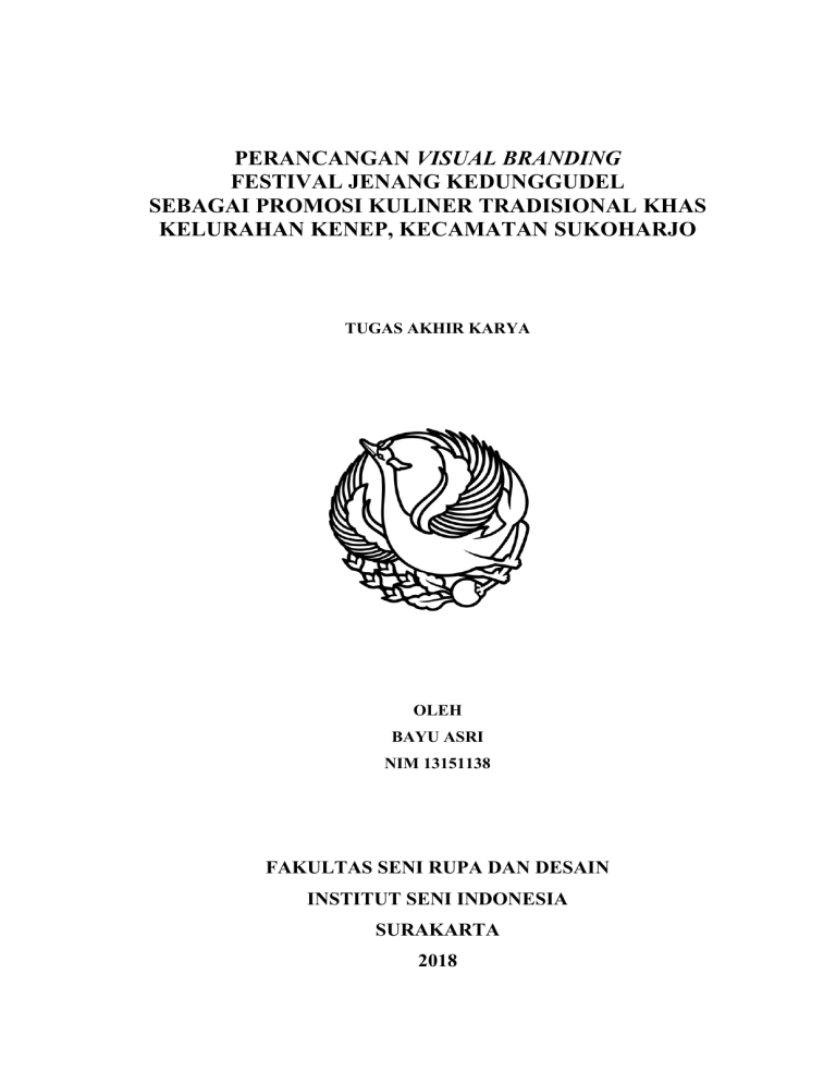 PERANCANGAN VISUAL BRANDING FESTIVAL JENANG KEDUNGGUDEL SEBAGAI PROMOSI KULINER TRADISIONAL KHAS KELURAHAN KENEP, KECAMATAN SUKOHARJO TUGAS AKHIR KARYA OLEH BAYU ASRI NIM 13151138 FAKULTAS SENI RUPA DAN DESAIN INSTITUT SENI INDONESIA SURAKARTA 2018 1 PERANCANGAN VISUAL BRANDING FESTIVAL JENANG KEDUNGGUDEL SEBAGAI PROMOSI KULINER TRADISIONAL KHAS KELURAHAN KENEP, KECAMATAN SUKOHARJO TUGAS AKHIR KARYA Untuk memenuhi sebagian persyaratan mencapai derajat Sarjana S-1 Program Studi Desain Komunikasi Visual Jurusan Seni Rupa dan Desain OLEH BAYU ASRI NIM 13151138 FAKULTAS SENI RUPA DAN DESAIN INSTITUT SENI INDONESIA SURAKARTA 2018 2 ii PENGESAHAN TUGAS AKHIR KARYA PERANCANGAN VISUAL BRANDING FESTIVAL JENANG KEDUNGGUDEL SEBAGAI PROMOSI KULINER TRADISIONAL KHAS KELURAHAN KENEP, KECAMATAN SUKOHARJO Oleh: Bayu Asri NIM: 13151138 Telah diuji dan dipertahankan di hadapan Tim Penguji pada tanggal, 2 Februari 2018 Tim Penguji Ketua Penguji : Fitri Murfianti, S.Sos., M.Med.Kom. …...……………… Penguji Bidang I : Taufik Murtono, S.Sn., M.Sn …..……………… Penguji Bidang II : Asmoro Nurhadi Panindias, S.Sn., M.Sn …..……………… Penguji/Pembimbing : Basnendar Herry Prilosadoso, S.Sn., M.Ds …..……………… Sekretaris Penguji : Handriyotopo, S.Sn., M.Sn …..……………… Deskripsi karya ini telah diterima sebagai salah satu persyaratan memperoleh gelar Sarjana Seni (S.Sn) pada Institut Seni Indonesia Surakarta Surakarta, 5 Februari 2018 Dekan Faultas Seni Rupa dan Desain Joko Budiwiyanto, S.Sn., M.A. NIP. 197207092003121001 iii 3 PERNYATAAN Yang bertanda tangan di bawah ini. Nama : Bayu Asri NIM : 13151138 menyatakan bahwa laporan Tugas Akhir Karya yang berjudul “Perancangan Visual Branding Festival Jenang Kedunggudel Sebagai Promosi Kuliner Tradisional Khas Kelurahan Kenep, Kecamatan Sukoharjo” adalah karya saya sendiri dan bukan jiplakan atau plagiarisme dari karya orang lain. Apabila di kemudia hari, terbukti sebagai jiplakan atau plagiarisme, maka saya bersedia mendapatkan sanksi sesuai dengan ketentuan yang berlaku. Selain itu, saya juga menyetujui laporan Tugas Akhir Karya ini dipublikasikan secara online dan cetak oleh Institut Seni Indonesia (ISI) Surakarta dengan tetap memperhatikan etika penulisan karya ilmiah untuk keperluan akademis. Demikian, surat pernyataan ini saya buat dengan sebenar-benarnya. Surakarta, 5 Februari 2018 Yang menyatakan, Bayu Asri NIM. 13151138 4 iv ABSTRAK Festival Jenang Kedunggudel merupakan event yang bertujuan untuk mengangkat dan mempromosikan Jenang Kedunggudel sebagai kuliner tradisional khas Dusun Kedunggudel, Kelurahan Kenep, Kecamatan Sukoharjo, Kabupaten Sukoharjo. Event tersebut memerlukan visual branding supaya promosi kuliner jenang khas Dusun Kedunggudel dapat tepat sasaran sesuai target audience dan mampu menjadi daya tarik bagi wisatawan, sehingga potensi wisata yang ada di sekitarnya ikut terangkat. Desain visual branding yang dibuat menggambarkan karakter masyarakat setempat yang ramah dan menampakkan citra potensi budaya Jawa yang kental, potensi alam yang masih asri, dan keanekaragaman produk khas Dusun Kedunggudel. Metode perancangan visual branding yang digunakan mengadaptasi metode perancangan brand awareness, di mana target audience dirangsang untuk mengenali dan mengingat Festival Jenang Kedunggudel ketika mendengar festival kuliner, sehingga brand image mengenai Jenang Kedunggudel akan terbentuk. Proses penciptaan visual branding dibagi menjadi empat tahap, yaitu eksplorasi, eksperimentasi, perwujudan, dan evaluasi. Perancangan logo melalui tahap thumbnails, sketsa, computerize yang terbagi menjadi rough layout dan comprehensive layout, serta Graphic Standard Manual (GSM). Aplikasi media yang dibuat terdiri dari stationery, display material, dan media luar ruang. Manfaat hasil perancangan bagi penyelenggaraan Festival Janang Kedunggudel yaitu mampu memberikan identitas visual yang mencerminkan karakter Dusun Kedunggudel dan sebagai media promosi yang mampu menarik wisatawan untuk datang berkunjung. Kata kunci : visual branding, festival, jenang, Kedunggudel v5 KATA PENGANTAR Puji syukur kehadirat Allah SWT. atas segala rahmat, hidayah dan karuniaNya sehingga penulisan laporan Tugas Akhir Karya yang berjudul “Perancangan Visual Branding Festival Jenang Kedunggudel Sebagai Promosi Kuliner Tradisional Khas Kelurahan Kenep, Kecamatan Sukoharjo” ini dapat terselesaikan dengan baik. Pembuatan Tugas Akhir Karya ini sebagai syarat untuk mahasiswa memperoleh gelar S-1 sarjana seni. Selain laporan, karya aplikasi media visual branding untuk Festival Jenang Kedunggudel juga ikut dirancang. Penyusunan laporan ini dapat terlaksana dengan baik dengan adanya dukungan dari berbagai pihak yang telah membantu selama proses perancangan Tugas Akhir Karya hingga terselesaikannya laporan ini. Pihak institusi, dosen pembimbing, dan teman-teman sangat berperan penting memberikan dukungan moral maupun tenaga. Ucapan terima kasih ditujukan kepada. 1. Allah SWT. yang telah memberikan rahmat, hidayah, dan karunia-Nya sehingga Tugas Akhir Karya ini dapat selesai dengan baik dan lancar. 2. Basnendar Herry Prilosadoso, S.Sn., M.Ds, Ketua Program Studi S-1 Desain Komunikasi Visual, Fakultas Seni Rupa dan Desain, Institut Seni Indonesia Surakarta serta Dosen Pembimbing Tugas Akhir Karya yang telah memberikan bimbingan dan menyelesaikan perancangan karya dan laporan ini. 6vi pengarahan untuk 3. Taufik Murtono, S.Sn., M.Sn, Dosen Pembimbing Akademik yang telah memberikan pengarahan dan masukan mengenai Tugas Akhir jalur Karya, sehingga Tugas Akhir Karya yang dibuat sesuai dengan kemampuan mahasiswa. 4. Seluruh dosen prodi Desain Komunikasi Visual dan dosen ISI Surakarta yang telah memberikan ilmu dan bimbingannya sehingga mampu menambah wawasan bagi mahasiswa untuk siap terjun ke dunia kerja. 5. Jaka Triwiyana, mahasiswa satu angkatan, sahabat, dan rekan kerja yang telah mencurahkan seluruh tenaga dan pikirannya guna membantu menyele