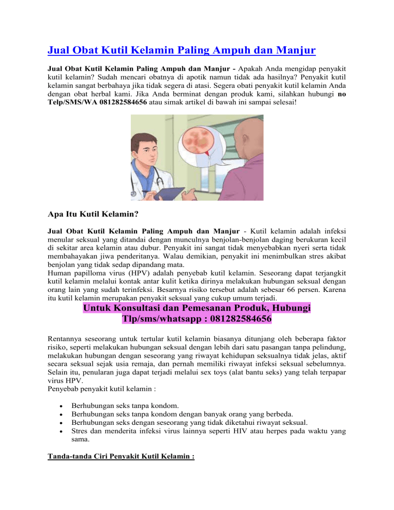 Jual Obat Kutil Kelamin Paling Ampuh dan Manjur Jual Obat Kutil Kelamin Paling Ampuh dan Manjur - Apakah Anda mengidap penyakit kutil kelamin? Sudah mencari obatnya di apotik namun tidak ada hasilnya? Penyakit kutil kelamin sangat berbahaya jika tidak segera di atasi. Segera obati penyakit kutil kelamin Anda dengan obat herbal kami. Jika Anda berminat dengan produk kami, silahkan hubungi no Telp/SMS/WA 081282584656 atau simak artikel di bawah ini sampai selesai! Apa Itu Kutil Kelamin? Jual Obat Kutil Kelamin Paling Ampuh dan Manjur - Kutil kelamin adalah infeksi menular seksual yang ditandai dengan munculnya benjolan-benjolan daging berukuran kecil di sekitar area kelamin atau dubur. Penyakit ini sangat tidak menyebabkan nyeri serta tidak membahayakan jiwa penderitanya. Walau demikian, penyakit ini menimbulkan stres akibat benjolan yang tidak sedap dipandang mata. Human papilloma virus (HPV) adalah penyebab kutil kelamin. Seseorang dapat terjangkit kutil kelamin melalui kontak antar kulit ketika dirinya melakukan hubungan seksual dengan orang lain yang sudah terinfeksi. Besarnya risiko tersebut adalah sebesar 66 persen. Karena itu kutil kelamin merupakan penyakit seksual yang cukup umum terjadi. Untuk Konsultasi dan Pemesanan Produk, Hubungi Tlp/sms/whatsapp : 081282584656 Rentannya seseorang untuk tertular kutil kelamin biasanya ditunjang oleh beberapa faktor risiko, seperti melakukan hubungan seksual dengan lebih dari satu pasangan tanpa pelindung, melakukan hubungan dengan seseorang yang riwayat kehidupan seksualnya tidak jelas, aktif secara seksual sejak usia remaja, dan pernah memiliki riwayat infeksi seksual sebelumnya. Selain itu, penularan juga dapat terjadi melalui sex toys (alat bantu seks) yang telah terpapar virus HPV. Penyebab penyakit kutil kelamin : Berhubungan seks tanpa kondom. Berhubungan seks tanpa kondom dengan banyak orang yang berbeda. Berhubungan seks dengan seseorang yang tidak diketahui riwayat seksual. Stres dan menderita infeksi virus lainnya seperti HIV atau herpes pada waktu yang sama. Tanda-tanda Ciri Penyakit Kutil Kelamin : Jual Obat Kutil Kelamin Paling Ampuh dan Manjur - Berikut Ciri ciri kutil kelamin pada wanita (Kondiloma Akuminata) atau jengger ayam ini bisa jadi penyakit paling mematikan dunia jika tidak segera di obati. Tidak hanya wanita sajayang patut mewaspadai tentang penyakit kutil kelamin ini, pria pun harus waspada pada munculnya kutil di kelamin tersebut. Berikut ini tanda-tanda atau ciri -ciri kutil kelamin beserta munculnya penyakit kutil kelamin atau jengger ayam yang patut di waspadai : Munculnya Benjolan di kelamin secara bergerombol Benjolan berisi daging Bentuk benjolan kecil Bengkak Kemerahan Menyerupai Jengger Ayam Menyerupai Kembang Kol Terasa Gatal Tidak Nyaman Pendarahan Nyeri Berbau Perih Kutil bisa berdarah Pada wanita muncul di bibir vagina, serviks, vagina Warna Kutil di kelamin hitam agak kemerahan, abu-abu agak kemerahan, cokelat agak kemerahan dan juga merah. Daerah penyebaran kutil kelamin pada Pria: Batang penis. Ujung kepala penis. Selangkangan. Paha bagian atas. Disekitar anus atau bisa didalamnya. Di dalam Uretra. Daerah penyebaran kutil kelamin pada Wanita: Anus. Vulva. Bagian antara anus dan kelamin. Leher Rahim. Paha bagian atas. Bagaimana cara mencegah Penyakit Kutil Kelamin? Untuk mengurangi risiko infeksi kutil kelamin bisa dilakukan dengan berbagai cara, antara lain : Gunakan kondom dengan benar setiap kali Anda berhubungan seks. Setia terhadap pasangan, jangan berganti-ganti partner seks. Membatasi kontak seksual hanya dengan satu pasangan yang benar-benar steril. Pertanyaan yang sering terpikirkan di benak Anda : Jika Saya terlanjur kena kutil kelamin bagaimana cara mengobatinya? Bagaimana cara mengobati kutil kelamin dengan cepat dan tuntas? Bagaimana berobat yang mudah tanpa perlu malu untuk ke dokter? Jawabannya: semua bisa, asal Anda memilih produk yang tepat, yaitu Gang Jie Gho Siah Pipeca dan Kapsul BD De Nature. Pengobatan Penyakit Kutil Kelamin Jual Obat Kutil Kelamin Paling Ampuh dan Manjur - Pengobatan Kutil Kelamin secara tradisional yaitu dengan menggunakan Obat Kutil Kelamin dari De Nature. Produk yang terbuat dari bahan herbal alami diramu dengan resep tradisional dan diolah secara teknologi modern, sehingga aman di konsumsi. Jadi anda juga tak perlu khawatir karena Obat Herbal De Nature yang kami tawarkan ini, Alhamdulillah, merupakan obat yang telah banyak menyembuhkan penderitanya baik dari dalam maupun luar negeri. Sudah banyak pasien kami yang merasakan kesembuhannya dengan mengonsumsi obat herbal dari De Nature. Rp 950.000,Pemesanan obat hubungi tlp/sms/whatsapp : 081282584656 Sekedar informasi untuk kenyamanan Konsumen, bahwa Produk dari perusahaan kami ini sudah memiliki: Ijin Resmi Perusahaan dari Kementerian Kesehatan Ijin BPOM, yang artinya sudah lulus uji stabilitas Produk Sertifikat Halal MUI, sehingga halal bisa dipertanggungjawabkan Apoteker yang sudah berpengalaman Sudah melewati Proses Sortir Bahan Baku, Guna Menjaga Mutu Produk Proses Produksi Sesuai Alur CPOTB (Cara Pembuatan Obat Tradisional Yang Baik Dan Benar). Cara Pembelian: Pembayaran terlebih dulu via transfer Bank, setelah transfer SMS-kan konfirmasinya untuk proses pengiriman. Format Pemesanan: Nama, Alamat Lengkap beserta kode Pos, Nama Bank / Rekening anda, Nominal transfer, Nama Obat yg dipesan, No.Hp Anda Agar pesanan Anda bisa segera diproses, segera konfirmasikan pembayaran Anda via Telp/SMS/WA ke 081282584656 Setelah itu barang kami kirim melalui TIKI / JNE / J&T / POS. CONTOH SMS KONFIRMASI: Ahmad Husein, Jl.Raya Perumas Cendana Asri No.95, Kecamatan Majenang, Kabupaten Cilacap, Provinsi Jawa Tengah Kode Pos 53257, Rekening Pentransfer atas Nama Ahmad Husein, Transfer 320rb, Obat Eksim, 081xxxxxxxxx INFO LENGKAP HUBUNGI KAMI: Telp/SMS/WA ke 081282584656 Sistem Pembayaran : Nikmati pembayaran yang aman dan nyaman melalui Bank BRI, BNI, BCA, dan Mandiri. Jasa Pengiriman : Barang Kami Kirim via POS, JNE atau TIK