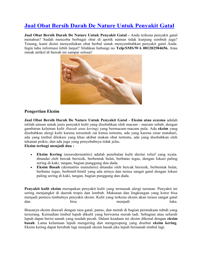 Jual Obat Bersih Darah De Nature Untuk Penyakit Gatal Jual Obat Bersih Darah De Nature Untuk Penyakit Gatal - Anda terkena penyakit gatal menahun? Sudah mencoba berbagai obat di apotik namun tidak kunjung sembuh juga? Tenang, kami disini menyediakan obat herbal untuk menyembuhkan penyakit gatal Anda. Ingin tahu informasi lebih lanjut? Silahkan hubungi no Telp/SMS/WA 081282584656. Atau simak artikel di bawah ini sampai selesai! Pengertian Eksim Jual Obat Bersih Darah De Nature Untuk Penyakit Gatal - Eksim atau eczema adalah istilah umum untuk jenis penyakit kulit yang disebabkan oleh macam - macam sebab, dengan gambaran kelainan kulit (basah atau kering) yang bermacam-macam pula. Ada eksim yang disebabkan alergi kulit karena tersentuh zat kimia tertentu, ada yang karena sinar matahari, ada yang timbul dilokasi yang khas akibat makan obat tertentu, ada yang disebabkan oleh tekanan psikis, dan ada juga yang penyebabnya tidak jelas. Eksim terbagi menjadi dua : Eksim Kering (neurodermatitis) adalah penebalan kulit diertai relief yang nyata. ditandai oleh bercak bersisik, berbentuk bulat, berbatas tegas, dengan lokasi paling sering di kaki, tangan, bagian punggung dan dada. Eksim Basah (dermatitis numularis) ditandai oleh bercak bersisik, berbentuk bulat, berbatas tegas, berbintil-bintil yang ada airnya dan terasa sangat gatal dengan lokasi paling sering di kaki, tangan, bagian punggung dan dada. Penyakit kulit eksim merupakan penyakit kulit yang termasuk alergi turunan. Penyakit ini sering menjangkit di daerah tropis dan lembab. Makanan dan lingkungan yang kotor bisa menjadi pemicu timbulnya penyakit eksim. Kulit yang terkena eksim akan terasa sangat gatal dan bisa menjadi luka. Biasanya eksim diawali dengan rasa gatal, panas, dan merah di bagian permukaan tubuh yang terserang. Kemudian timbul lepuh dikulit yang berwarna merah tadi. Sebagian atau seluruh lepuh dapat berisi nanah yang mudah pecah. Dalam keadaan ini eksim dikenal dengan eksim basah. Lama kelamaan lepuh mengering dan mengeropeng yang disebut eksim kering. Eksim kering dapat berubah lagi menjadi eksim basah jika lepuh bernanah timbul lagi. Harga Rp 295.000 Informasi lebih lanjut hubungi Telp/SMS/WA 081282584656 Apa Saja Gejala Eksim? Jual Obat Bersih Darah De Nature Untuk Penyakit Gatal - Dimanapun lokasi timbulnya eksim, gejala utama yang dirasakan pasien adalah gatal. Terkadang rasa gatal sudah muncul sebelum ada tanda kemerahan pada kulit. Gejala kemerahan biasanya akan muncul pada wajah, lutut, tangan dan kaki, namun tidak menutup kemungkinan kemerahan muncul di daerah lain. Daerah yang terkena akan terasa sangat kering, menebal atau keropeng. Pada orang kulit putih, daerah ini pada mulanya akan berwarna merah muda lalu berubah menjadi cokelat. Sementara itu pada orang dengan kulit lebih gelap, eksim akan mempengaruhi pigmen kulit sehingga daerah eksim akan tampak lebih terang atau lebih gelap. Apa yang Menjadi Penyebab Eksim Jual Obat Bersih Darah De Nature Untuk Penyakit Gatal - Penyebab dari eksim sebenarnya belum diketahui dengan pasti, namun beberapa ahli mencurigai eksim berhubungan dengan aktifitas daya pertahanan tubuh (imun) yang berlebihan. Hal ini menyebabkan tubuh mengalami reaksi berlebihan terhadap bakteri atau iritan yang sebenarnya tidak berbahaya pada kulit. Oleh karena itu, eksim banyak ditemukan pada keluarga dengan riwayat penyakit alergi atau asma. Tiap tiap orang mempunyai pencetus eksim yang berbeda beda. Ada orang yang setelah memegang sabun atau deterjen akan merasakan gatal yang luar biasa, ada pula yang disebabkan oleh bahan atau alat rumah tangga yang lain. Gejala yang timbul pun bervariasi, ada yang gatalnya ringan tetapi rasa panas yang dominan, ada pula yang sebaliknya. Infeksi saluran nafas bagian atas atau flu juga bisa menjadi pencetus timbulnya eksim. Stress yang dialami penderita akan membuat gejala menjadi lebih buruk. Jenis – Jenis Penyakit Gatal Eksim : 1. Dermatitis atopik : salah satu jenis eksim yang paling sering dijumpai dan merupakan penyakit turunan. Dermatitis atopik umumnya dimulai ketika bayi dan masih anak- 2. 3. 4. 5. anak dengan gejala berupa gatal, radang kulit, dan pada sebagian penderita sering timbul asma dan demam hay (hay fever). Dermatitis kontak : meliputi dermatitis kontak alergik dan iritan. Dermatitis kontak alergik disebabkan oleh reaksi kekebalan tertunda (delayed immune system) akibat kontak kulit dengan senyawa alergenik sehingga menyebabkan radang kulit dalam 48 jam setelah paparan terjadi. Beberapa agen penyebab eksim jenis ini adalah jelatang, parfum, pengawet kosmetik, metal, dan pewarna. Dermatitis kontak iritan terjadi karena paparan senyawa iritan yang dapat merusak kulit secara kimiawi, contohnya sabun keras, detergen, dan produk pembersih lainnya. Senyawa iritan tersebut dapat menghilangkan minyak dan kelembaban dari lapisan luar kulit, kemudian merusak lapisan pelindung dan memicu terjadinya peradangan. Eksim numular : beberapa plak eksim yang biasanya berhubungan dengan kulit kering dan terjadi pada bagian luar dari kaki, tangan, dan lengan. Eksim stasis : jenis eksim kronis pada daerah bawah kaki bagian dalam yang berkaitan dengan varises. Pertanyaan yang sering terpikirkan di benak Anda : Jika Saya terlanjur kena penyakit eksim, bagaimana cara mengobatinya? Bagaimana cara mengobati penyakit eksim dengan cepat dan tuntas? Bagaimana berobat yang mudah tanpa perlu malu untuk ke dokter? Jawabannya: semua bisa, asal Anda memilih produk yang tepat, yaitu Eximtas, Kapsul BD De Nature dan Salep Exclear. Pengobatan Penyakit Eksim Jual Obat Bersih Darah De Nature Untuk Penyakit Gatal - Pengobatan Eksim secara tradisional yaitu dengan menggunakan Obat Eksim dari De Nature. Produk yang terbuat dari bahan herbal alami diramu dengan resep tradisional dan diolah secara teknologi modern, sehingga aman di konsumsi. Jadi anda juga tak perlu khawatir karena Obat Herbal De Nature yang kami tawarkan ini, Alhamdulillah, merupakan obat yang telah banyak menyembuhkan p
