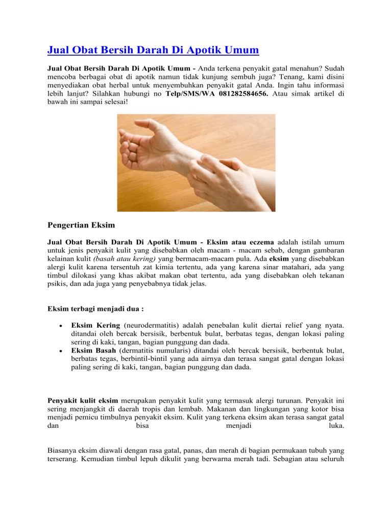Jual Obat Bersih Darah Di Apotik Umum Jual Obat Bersih Darah Di Apotik Umum - Anda terkena penyakit gatal menahun? Sudah mencoba berbagai obat di apotik namun tidak kunjung sembuh juga? Tenang, kami disini menyediakan obat herbal untuk menyembuhkan penyakit gatal Anda. Ingin tahu informasi lebih lanjut? Silahkan hubungi no Telp/SMS/WA 081282584656. Atau simak artikel di bawah ini sampai selesai! Pengertian Eksim Jual Obat Bersih Darah Di Apotik Umum - Eksim atau eczema adalah istilah umum untuk jenis penyakit kulit yang disebabkan oleh macam - macam sebab, dengan gambaran kelainan kulit (basah atau kering) yang bermacam-macam pula. Ada eksim yang disebabkan alergi kulit karena tersentuh zat kimia tertentu, ada yang karena sinar matahari, ada yang timbul dilokasi yang khas akibat makan obat tertentu, ada yang disebabkan oleh tekanan psikis, dan ada juga yang penyebabnya tidak jelas. Eksim terbagi menjadi dua : Eksim Kering (neurodermatitis) adalah penebalan kulit diertai relief yang nyata. ditandai oleh bercak bersisik, berbentuk bulat, berbatas tegas, dengan lokasi paling sering di kaki, tangan, bagian punggung dan dada. Eksim Basah (dermatitis numularis) ditandai oleh bercak bersisik, berbentuk bulat, berbatas tegas, berbintil-bintil yang ada airnya dan terasa sangat gatal dengan lokasi paling sering di kaki, tangan, bagian punggung dan dada. Penyakit kulit eksim merupakan penyakit kulit yang termasuk alergi turunan. Penyakit ini sering menjangkit di daerah tropis dan lembab. Makanan dan lingkungan yang kotor bisa menjadi pemicu timbulnya penyakit eksim. Kulit yang terkena eksim akan terasa sangat gatal dan bisa menjadi luka. Biasanya eksim diawali dengan rasa gatal, panas, dan merah di bagian permukaan tubuh yang terserang. Kemudian timbul lepuh dikulit yang berwarna merah tadi. Sebagian atau seluruh lepuh dapat berisi nanah yang mudah pecah. Dalam keadaan ini eksim dikenal dengan eksim basah. Lama kelamaan lepuh mengering dan mengeropeng yang disebut eksim kering. Eksim kering dapat berubah lagi menjadi eksim basah jika lepuh bernanah timbul lagi. Harga Rp 295.000 Informasi lebih lanjut hubungi Telp/SMS/WA 081282584656 Apa Saja Gejala Eksim? Jual Obat Bersih Darah Di Apotik Umum - Dimanapun lokasi timbulnya eksim, gejala utama yang dirasakan pasien adalah gatal. Terkadang rasa gatal sudah muncul sebelum ada tanda kemerahan pada kulit. Gejala kemerahan biasanya akan muncul pada wajah, lutut, tangan dan kaki, namun tidak menutup kemungkinan kemerahan muncul di daerah lain. Daerah yang terkena akan terasa sangat kering, menebal atau keropeng. Pada orang kulit putih, daerah ini pada mulanya akan berwarna merah muda lalu berubah menjadi cokelat. Sementara itu pada orang dengan kulit lebih gelap, eksim akan mempengaruhi pigmen kulit sehingga daerah eksim akan tampak lebih terang atau lebih gelap. Apa yang Menjadi Penyebab Eksim Jual Obat Bersih Darah Di Apotik Umum - Penyebab dari eksim sebenarnya belum diketahui dengan pasti, namun beberapa ahli mencurigai eksim berhubungan dengan aktifitas daya pertahanan tubuh (imun) yang berlebihan. Hal ini menyebabkan tubuh mengalami reaksi berlebihan terhadap bakteri atau iritan yang sebenarnya tidak berbahaya pada kulit. Oleh karena itu, eksim banyak ditemukan pada keluarga dengan riwayat penyakit alergi atau asma. Tiap tiap orang mempunyai pencetus eksim yang berbeda beda. Ada orang yang setelah memegang sabun atau deterjen akan merasakan gatal yang luar biasa, ada pula yang disebabkan oleh bahan atau alat rumah tangga yang lain. Gejala yang timbul pun bervariasi, ada yang gatalnya ringan tetapi rasa panas yang dominan, ada pula yang sebaliknya. Infeksi saluran nafas bagian atas atau flu juga bisa menjadi pencetus timbulnya eksim. Stress yang dialami penderita akan membuat gejala menjadi lebih buruk. Jenis – Jenis Penyakit Gatal Eksim : 1. Dermatitis atopik : salah satu jenis eksim yang paling sering dijumpai dan merupakan penyakit turunan. Dermatitis atopik umumnya dimulai ketika bayi dan masih anakanak dengan gejala berupa gatal, radang kulit, dan pada sebagian penderita sering timbul asma dan demam hay (hay fever). 2. Dermatitis kontak : meliputi dermatitis kontak alergik dan iritan. Dermatitis kontak alergik disebabkan oleh reaksi kekebalan tertunda (delayed immune system) akibat kontak kulit dengan senyawa alergenik sehingga menyebabkan radang kulit dalam 48 jam setelah paparan terjadi. Beberapa agen penyebab eksim jenis ini adalah jelatang, parfum, pengawet kosmetik, metal, dan pewarna. 3. Dermatitis kontak iritan terjadi karena paparan senyawa iritan yang dapat merusak kulit secara kimiawi, contohnya sabun keras, detergen, dan produk pembersih lainnya. Senyawa iritan tersebut dapat menghilangkan minyak dan kelembaban dari lapisan luar kulit, kemudian merusak lapisan pelindung dan memicu terjadinya peradangan. 4. Eksim numular : beberapa plak eksim yang biasanya berhubungan dengan kulit kering dan terjadi pada bagian luar dari kaki, tangan, dan lengan. 5. Eksim stasis : jenis eksim kronis pada daerah bawah kaki bagian dalam yang berkaitan dengan varises. Pertanyaan yang sering terpikirkan di benak Anda : Jika Saya terlanjur kena penyakit eksim, bagaimana cara mengobatinya? Bagaimana cara mengobati penyakit eksim dengan cepat dan tuntas? Bagaimana berobat yang mudah tanpa perlu malu untuk ke dokter? Jawabannya: semua bisa, asal Anda memilih produk yang tepat, yaitu Eximtas, Kapsul BD De Nature dan Salep Exclear. Pengobatan Penyakit Eksim Jual Obat Bersih Darah Di Apotik Umum - Pengobatan Eksim secara tradisional yaitu dengan menggunakan Obat Eksim dari De Nature. Produk yang terbuat dari bahan herbal alami diramu dengan resep tradisional dan diolah secara teknologi modern, sehingga aman di konsumsi. Jadi anda juga tak perlu khawatir karena Obat Herbal De Nature yang kami tawarkan ini, Alhamdulillah, merupakan obat yang telah banyak menyembuhkan penderitanya baik dari dalam maupun luar negeri. Sudah banyak pasien kami yang merasakan kesembuhan