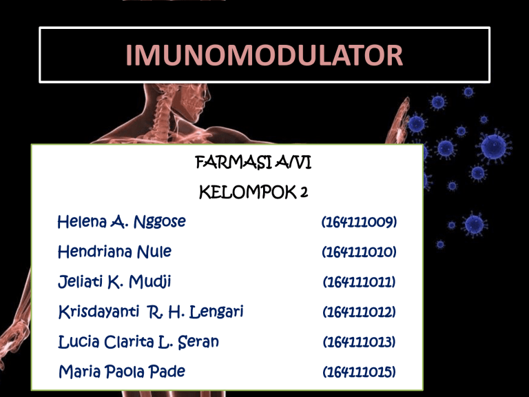 IMUNOMODULATOR FARMASI A/VI KELOMPOK 2 Helena A. Nggose (164111009) Hendriana Nule (164111010) Jeliati K. Mudji (164111011) Krisdayanti R. H. Lengari (164111012) Lucia Clarita L. Seran (164111013) Maria Paola Pade (164111015) Pengertian Imunitas merupakan suatu reaksi dalam tubuh terhadap bahan asing yang masuk ke dalam tubuh secara molekuler atau selular. Sel yang terlibat dalam sistem imun dalam tubuh adalah sel T yang dihasilkan oleh timus dan sel B yang dihasilkan di sumsum tulang belakang (Sukmayadi, 2014). Perkembangan dan aktivitas dari sel T dapat distimulasi dengan cara penambahan suatu imunomodulator. Imunomodulator adalah substansi yang dapat membantu memperbaiki fungsi sistem imun. Secara klinis suatu imunomodulator digunakan pada pasien dengan gangguan imunitas, antara lain pada kasus kanker, HIV/AIDS, malnutrisi, alergi, dan lain-lain (Sukmayadi, 2014). Imunomodulator berkaitan dengan peningkatan leukosit dalam tubuh. Leukosit, Limfosit, Monosit Leukosit berperan di dalam pertahanan seluler dan humoral terhadap zat-zat asing. Manusia harus memproduksi 3,7x1011 leukosit tiap hari untuk mempertahankan ambang tetap. Leukosit memiliki manfaat untuk mengurangi berbagai peyebab infeksi, seperti virus dan bakteri (Sukmayadi, 2014). Limfosit merupakan sel yang paling dominan dalam organ dan jaringan sistem imun dan merupakan bagian sel darah putih yang sangat banyak. Limfosit terdiri dari sel T dan sel B. Limfosit di dalam tubuh berperan dalam sistem imun spesifik seluler (sel T) untuk pertahanan terhadap bakteri yang hidup intraseluler, virus, jamur, parasit-parasit, serta keganasan (Sukmayadi, 2014). Monosit salah satu jenis sel darah putih yang mana sel ini berfungsi melawan beberapa jenis infeksi, menyingkirkan sel dan jaringa rusak, serta meningkatkan kekebalan tubuh terhadap benda asing (Sukmayadi, 2014). Apabila jumlah leukosit meningkat menunjukkan adanya peningkatan produksi sel darah putih untuk melawan infeksi dan apabila jumlah leukosit menurun akan menyebab tubuh mudah terserang penyakit (Sukmayadi, 2014). Apabila jumlah limfosit dan monosit meningkat menandakan adanya masalah dengan sistem kekebalan tubuh yaitu adanya infeksi virus seperti campak atau gondok dan infeksi bakteri seperti tuberkulosis (Sukmayadi, 2014). Sebalikanya apabila jumlah limfosit menurun maka kemampuan tubuh untuk melawan infeksi terganggu sehingga tubuh akan menjadi rentan terkena penyakit kanker dan apabila jumlah monosit menurun bisa terjadi akibat adanya produksi monosit yang kurang dari sumsum tulang seperti pada penyakit anemia aplastik (Handayani, 2010). Gejala: Demam, menggigil, sakit kepala dan badan pegal pegal, ada juga diare yang terus menerus atau disertai darah, mual dan muntah yang parah, sulit makan dan minum, sangat lemas, muncul ruam pada kulit nyeri perut, batuk yang tak kunjung sembuh dan sesak napas (Sukmayadi, 2014). Penyebab: • Kelainan bawaan yang menyebabkan menurunnya fungsi sumsum tulang atau infeksi. • Infeksi virus yang dapat mengganggu kerja sumsum tulang atau infeksi yang cukup parah hingga memengaruhi jumlah sel darah putih, misalnya infeksi tuberkulosis dan HIV. (Sukmayadi, 2014) Penatalaksaan dengan Obat Sintetik Obat sintesis yang biasa digunakan di dalam mengembalikan ketidakseimbangan sistem imun seperti • Obat golongan antiinflamasi nonsteroid (ketoprofen, aspirin, ibuprofen, asam mefenamat, dan lain-lain) • Obat-obat imunosupresan (azatioprin, klorambusi, sitoksan, dan lain-lain) • Obat-obatan untuk imunostimulan (isoprinosin, levamisol arginin, dan lain-lain) (Sukmayadi, 2014) Obat-obat sintesis ini banyak mengakibatkan efek yang tidak diinginkan, seperti • Golongan antiinflamasi nonsteroid (pendarahan mikroskopik saluran cerna, penurunan kadar trombosit, depresi pernapasan, dan sebagainya) • Imunostimulan (peningkatan kadar asam urat, urtikaria, agranulositosis, dan lainlain) • Imunosupresan (toksik terhadap hati, gangguan saluran pencernaan, dan lainlain) (Sukmayadi, 2014) Aktivitas Imunomodulator Ekstrak Etanol Daun Tempuyung (Sonchus arvensis Linn.) Tujuan: Untuk mengetahui pengaruh aktivitas imunomodulator daun tempuyung (Sonchus arvensis Linn.) terhadap peningkatan jumlah leukosit dan komponennya. Klasifikasi daun tempuyung • Difisi : Spermatophyta • Subdifisi : Angiospermae • Kelas : Dicotyledonae • Ordo : Asterales • Suku/Family : Compositae • Marga : Sonchus • Spesies : Sonchus arvensis Linn • Nama umum : Tempuyung • Nama Daerah : Galibug, Jombang, J. Lalaking, Lempung, Lompnas, Rayana. (Winarto, 2004) Zat Yang Terkandung dan Dosis • Daun tempuyung (Sonchus arvensis Linn.) mengandung flavonoid yang mempunyai efek imunomodulator (Sukmayadi, 2014). • Metode yang digunakan yaitu metode ekstrasi dengan dosisnya yaitu: 100 mg/kgBB memilki aktivitas imunomodulator ekstrak etanol daun tempuyung terhadap peningkatan jumlah leukosit, limfosit, monosit (Sukmayadi, 2014). Pembahasan Jurnal Imunomodulator Daun Tempuyung (Sonchus arvensis Linn.) Flavonoid (kaempferol) Kaempferol yang terdapat dalam daun tempuyung (Sonchus arvensis Linn.) dapat bekerja terhadap limfokin (Interferon γ) yang dihasilkan oleh sel T sehingga akan merangsang sel-sel fagosit melakukan respon fagositosis serta dapat memacu proliferasi limfosit, meningkatkan jumlah sel T. (Sukmayadi, 2014) • Ekstrak diberikan setiap hari sekali selama 2 (dua) minggu dan 1 (satu) minggu setelah diberikan Shigella dysenteriae secara per oral. • Hasil penelitian menunjukkan bahwa terdapat perbedaan bermakna antara aktivitas imunomodulator ekstrak etanol daun tempuyung (Sonchus arvensis Linn.) pada dosis 100 mg/kgBB terhadap peningkatan jumlah leukosit, limfosit, monosit. • Mempunyai daya hambat terhadap pertumbuhan bakteri S. dysenteriae yang digunakan untuk memicu peningkatan sistem imun sehingga S. dysenteriae tidak dapat menyebabkan disentri basiler pada hewan percobaan dengan pemberian ekstrak etanol daun tempuyung (Sonchus arvensis Linn.). • Disentri basi