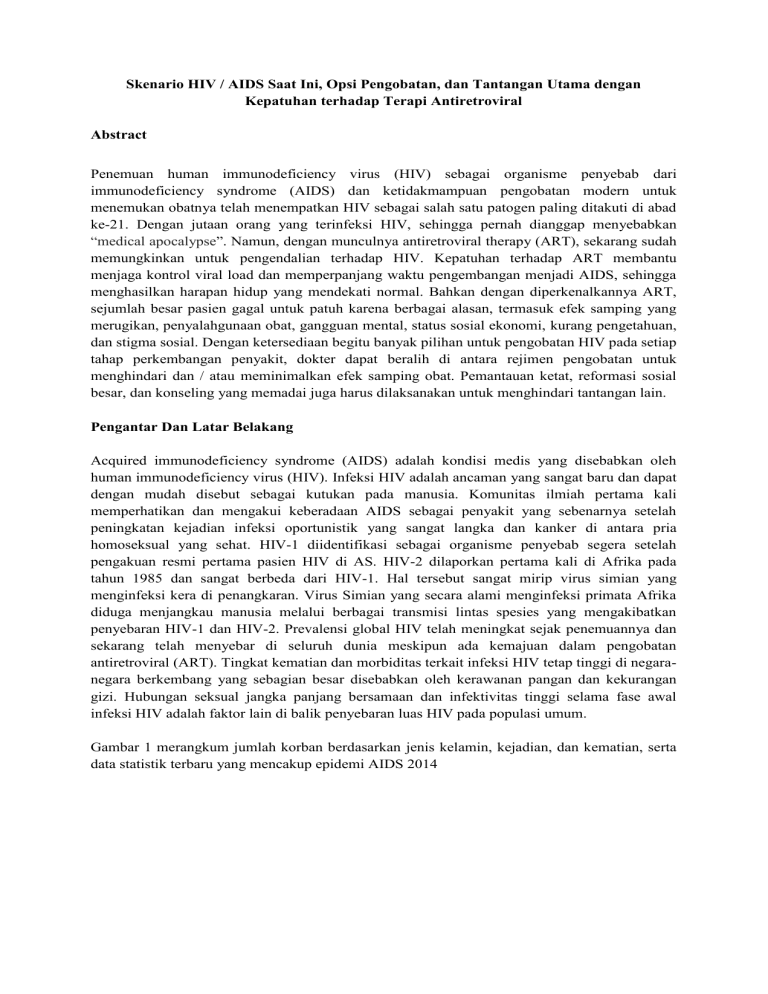 Skenario HIV / AIDS Saat Ini, Opsi Pengobatan, dan Tantangan Utama dengan Kepatuhan terhadap Terapi Antiretroviral Abstract Penemuan human immunodeficiency virus (HIV) sebagai organisme penyebab dari immunodeficiency syndrome (AIDS) dan ketidakmampuan pengobatan modern untuk menemukan obatnya telah menempatkan HIV sebagai salah satu patogen paling ditakuti di abad ke-21. Dengan jutaan orang yang terinfeksi HIV, sehingga pernah dianggap menyebabkan “medical apocalypse”. Namun, dengan munculnya antiretroviral therapy (ART), sekarang sudah memungkinkan untuk pengendalian terhadap HIV. Kepatuhan terhadap ART membantu menjaga kontrol viral load dan memperpanjang waktu pengembangan menjadi AIDS, sehingga menghasilkan harapan hidup yang mendekati normal. Bahkan dengan diperkenalkannya ART, sejumlah besar pasien gagal untuk patuh karena berbagai alasan, termasuk efek samping yang merugikan, penyalahgunaan obat, gangguan mental, status sosial ekonomi, kurang pengetahuan, dan stigma sosial. Dengan ketersediaan begitu banyak pilihan untuk pengobatan HIV pada setiap tahap perkembangan penyakit, dokter dapat beralih di antara rejimen pengobatan untuk menghindari dan / atau meminimalkan efek samping obat. Pemantauan ketat, reformasi sosial besar, dan konseling yang memadai juga harus dilaksanakan untuk menghindari tantangan lain. Pengantar Dan Latar Belakang Acquired immunodeficiency syndrome (AIDS) adalah kondisi medis yang disebabkan oleh human immunodeficiency virus (HIV). Infeksi HIV adalah ancaman yang sangat baru dan dapat dengan mudah disebut sebagai kutukan pada manusia. Komunitas ilmiah pertama kali memperhatikan dan mengakui keberadaan AIDS sebagai penyakit yang sebenarnya setelah peningkatan kejadian infeksi oportunistik yang sangat langka dan kanker di antara pria homoseksual yang sehat. HIV-1 diidentifikasi sebagai organisme penyebab segera setelah pengakuan resmi pertama pasien HIV di AS. HIV-2 dilaporkan pertama kali di Afrika pada tahun 1985 dan sangat berbeda dari HIV-1. Hal tersebut sangat mirip virus simian yang menginfeksi kera di penangkaran. Virus Simian yang secara alami menginfeksi primata Afrika diduga menjangkau manusia melalui berbagai transmisi lintas spesies yang mengakibatkan penyebaran HIV-1 dan HIV-2. Prevalensi global HIV telah meningkat sejak penemuannya dan sekarang telah menyebar di seluruh dunia meskipun ada kemajuan dalam pengobatan antiretroviral (ART). Tingkat kematian dan morbiditas terkait infeksi HIV tetap tinggi di negaranegara berkembang yang sebagian besar disebabkan oleh kerawanan pangan dan kekurangan gizi. Hubungan seksual jangka panjang bersamaan dan infektivitas tinggi selama fase awal infeksi HIV adalah faktor lain di balik penyebaran luas HIV pada populasi umum. Gambar 1 merangkum jumlah korban berdasarkan jenis kelamin, kejadian, dan kematian, serta data statistik terbaru yang mencakup epidemi AIDS 2014 Review The infection Tempat utama serangan (Target) adalah sistem kekebalan tubuh, terutama limfosit T CD4 (sel CD4). Setelah terinfeksi, virus secara bertahap dan diam-diam mengalahkan mekanisme pertahanan inang, menghasilkan infeksi oportunistik dan kanker yang jarang terjadi. Sel CD4 yang teraktivasi dan terdiferensiasi memiliki peran penting dalam aktivasi cell-mediated dan sistem imun humoral. Infeksi HIV mengakibatkan berkuraangnya sel CD4 pada peripheral blood. (Sel darah tepi adalah komponen seluler darah, yang terdiri dari sel darah merah (eritrosit), sel darah putih (leukosit), dan trombosit, yang ditemukan dalam kumpulan darah yang bersirkulasi dan tidak diasingkan dalam sistem limfatik, limpa, hati, atau sumsum tulang.) Di antara pasien yang tidak diobati, berkuraangnya sel CD4 berlanjut selama beberapa tahun sampai pasien meninggal karena AIDS. Ini adalah tahap terakhir dari infeksi HIV, dan dapat muncul kapan saja antara dua sampai15 tahun setelah infeksi. Gambar berikut ini menunjukkan garis waktu infeksi HIV dari infeksi awal hingga ekspresi gejala terdefinisi AIDS (Gambar 2). HIV subgroups HIV -1. HIV-1 terkenal karena keragaman genetiknya yang luas. Ada empat garis keturunan yang berbeda berdasarkan HIV-1: M, N, O, dan P. Virus HIV yang paling sering dilaporkan di seluruh dunia adalah kelompok M. Grup N kurang dilaporkan, hanya dilaporkan dari Kamerun. Kelompok O bertanggung jawab atas 1% dari total kasus HIV-1 dan sebagian besar ditemukan di Kamerun dan Gabon. Grup P adalah yang paling langka dari semua dan telah diidentifikasi pada wanita hamil asal Kamerun di Perancis. Memiliki prevalensi 0,06% dari total infeksi HIV. HIV-2 HIV-2 paling sering dilaporkan di Afrika Barat, dengan Guinea-Bissau dan Senegal memiliki insiden tertinggi. Ada delapan jenis HIV-2, berlabel HIV-A hingga HIV-H. Grup A dilaporkan di seluruh wilayah sub-Sahara (Negara-Negara di afrika selain afrika utara / primbumi berkulit hitam). Grup B dilaporkan lebih umum di Pantai Gading. Karena sifat infeksi dan kejadian sporadis, C hingga H dikategorikan sebagai transmisi “jalan buntu” yang tidak menghasilkan infeksi berikutnya. Status infeksi HIV dan angka kematian saat ini. Barat, Eropa Tengah, dan Amerika Utara. Sekitar 2,4 juta orang adalah HIV-positif di wilayah ini. Diperkirakan 85.000 infeksi HIV baru dilaporkan pada tahun 2014, dan lebih dari 50% infeksi berasal dari Amerika Serikat. Sekitar 26.000 kematian terkait AIDS juga dilaporkan pada periode yang sama. Asia dan Pasifik. Pada 2014, sekitar lima juta orang sebelumnya terinfeksi di Asia dan Pasifik, dengan sebanyak 340.000 infeksi HIV baru muncul pada tahun itu. Cina, Indonesia, dan India berkontribusi sekitar 78% dari total beban penyakit baru di Asia dan Pasifik dengan sekitar 240.000 kematian. Pasien yang menerima ART adalah sekitar 36%, dengan 3,2 juta pasien HIV aktif tidak memiliki akses ke ART. Di Pakistan, indeks kasus infeksi HIV dilaporkan pada tahun 1987. Sesuai laporan tahunan dari Pakistan National AIDS Control Program (Program Pengendalian AIDS Nasional Pakistan), kejadian HIV telah 
