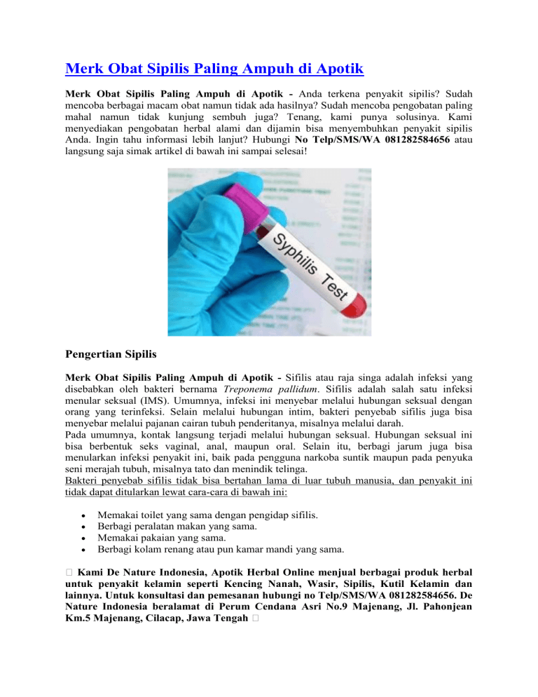 Merk Obat Sipilis Paling Ampuh di Apotik Merk Obat Sipilis Paling Ampuh di Apotik - Anda terkena penyakit sipilis? Sudah mencoba berbagai macam obat namun tidak ada hasilnya? Sudah mencoba pengobatan paling mahal namun tidak kunjung sembuh juga? Tenang, kami punya solusinya. Kami menyediakan pengobatan herbal alami dan dijamin bisa menyembuhkan penyakit sipilis Anda. Ingin tahu informasi lebih lanjut? Hubungi No Telp/SMS/WA 081282584656 atau langsung saja simak artikel di bawah ini sampai selesai! Pengertian Sipilis Merk Obat Sipilis Paling Ampuh di Apotik - Sifilis atau raja singa adalah infeksi yang disebabkan oleh bakteri bernama Treponema pallidum. Sifilis adalah salah satu infeksi menular seksual (IMS). Umumnya, infeksi ini menyebar melalui hubungan seksual dengan orang yang terinfeksi. Selain melalui hubungan intim, bakteri penyebab sifilis juga bisa menyebar melalui pajanan cairan tubuh penderitanya, misalnya melalui darah. Pada umumnya, kontak langsung terjadi melalui hubungan seksual. Hubungan seksual ini bisa berbentuk seks vaginal, anal, maupun oral. Selain itu, berbagi jarum juga bisa menularkan infeksi penyakit ini, baik pada pengguna narkoba suntik maupun pada penyuka seni merajah tubuh, misalnya tato dan menindik telinga. Bakteri penyebab sifilis tidak bisa bertahan lama di luar tubuh manusia, dan penyakit ini tidak dapat ditularkan lewat cara-cara di bawah ini: Memakai toilet yang sama dengan pengidap sifilis. Berbagi peralatan makan yang sama. Memakai pakaian yang sama. Berbagi kolam renang atau pun kamar mandi yang sama. � Kami De Nature Indonesia, Apotik Herbal Online menjual berbagai produk herbal untuk penyakit kelamin seperti Kencing Nanah, Wasir, Sipilis, Kutil Kelamin dan lainnya. Untuk konsultasi dan pemesanan hubungi no Telp/SMS/WA 081282584656. De Nature Indonesia beralamat di Perum Cendana Asri No.9 Majenang, Jl. Pahonjean Km.5 Majenang, Cilacap, Jawa Tengah � Tahapan Sipilis Gejala pertama sifilis muncul sekitar tiga minggu setelah bakteri memasuki tubuh. Infeksi sifilis terbagi menjadi empat tahapan utama, antara lain: � Sifilis Primer Penderita sifilis mengalami gejala yang dimulai dengan lesi atau luka pada alat kelamin atau di dalam dan di sekitar mulut. Luka yang terjadi berbentuk seperti gigitan serangga tapi tidak menimbulkan rasa sakit. Pada tahap ini, jika orang yang terinfeksi berhubungan seksual dengan orang lain, penularan sangat mudah terjadi. Luka ini bertahan selama 1-2 bulan. Pada akhirnya, lesi ini akan sembuh tanpa meninggalkan bekas. � Sifilis Sekunder Penderita sifilis sekunder akan mengalami ruam merah serukuran koin kecil dan biasanya ruam ini muncul pada telapak tangan dan telapak kaki. Gejala lain yang mungkin muncul adalah demam, nafsu makan menurun, radang tenggorokan dan kutil kelamin. Fase ini bisa bertahan selama satu hingga tiga bulan. � Sifilis Laten Setelah fase sifilis sekunder, sifilis seakan-akan menghilang dan tidak menimbulkan gejala sama sekali. Masa laten ini bisa bertahan sekitar dua tahun sebelum kemudian lanjut ke masa yang paling berbahaya dalam infeksi sifilis yaitu sifilis tersier. � Sifilis Tersier Jika infeksi tidak terobati, sifilis akan berkembang ke tahapan akhir, yaitu sifilis tersier. Pada tahap ini, infeksi bisa memberi efek yang serius pada tubuh. Beberapa akibat dari infeksi pada tahapan ini adalah kelumpuhan, kebutaan, demensia, masalah pendengaran, impotensi, dan bahkan kematian jika tidak ditangani. Sifilis paling mudah menular pada fase sifilis primer dan sekunder. Jika Anda merasa terinfeksi sifilis, segera periksakan diri ke dokter atau klinik spesialis penyakit kelamin untuk memastikan diagnosis terhadap sifilis. Makin cepat sifilis diobati, makin kecil kemungkinan sifilis berkembang menjadi penyakit yang serius. GEJALA ATAU TANDA PENYAKIT SIPILIS Merk Obat Sipilis Paling Ampuh di Apotik - Penyakit sipilis bisa menyebabkan kerusakan organ-organ tubuh. Kerusakan tersebut bisa menimpa syaraf, otak, otot, tulang, mata, serta organ bagian tubuh yang lainnya. Bahkan, jika sudah stadium lajut penyakit ini dapat menyebabkan kematian pada si penderita.Penyakit kelamin yang satu ini memang tidak boleh dianggap remeh. Perlu Anda ketahui bahwa penyakit ini akan menggerogoti sistem kekebalan tubuh penderita sehingga tubuh si penderita akan sangat mudah terkena penyakit dan bertambah parah karena infeksi dari bakteri penyebab penyakit ini menyebar keseluruh tubuh dengan cepat. Untuk itu sebaiknya kita dapat mengenali tanda-tanda penyakit kelamin ini melalui gejala yang muncul. Informasi lebih lanjut hubungi Telp/SMS/WA 081282584656 Gejala/Tanda Penyakit Sipilis Pada Wanita 1. Keluarnya cairan tidak normal dari saluran kencing atau liang senggama 2. Timbulnya keputihan yang banyak, berbau amis, dan warnanya cenderung putih kehijauan. 3. Rasa nyeri ketika buang air kecil 4. Rasa nyeri saat berhubungan seksual 5. Timbulnya rasa gatal di alat kelamin atau sekitarnya dan menjadi luka koreng di kelamin. 6. Timbulnya luka kecil (terkadang tidak terasa sakit) disertai pembengkakan kelenjar getah bening. 7. Terjadinya perubahan warna kulit dan mata komplikasi bartolitis, yaitu membengkaknya kelenjar Bartholin mengakibatkan kesulitan berjalan karena rasa nyeri. Gejala/Tanda Penyakit Sipilis Pada Pria Sering nyeri selama hubungan seksual. Nyeri ketika buang air kecil. Keluarnya cairan atau kotoran dari penis laki-laki. Ada luka kerongkongan pada orang-orang melakukan oral sek, sehingga kerongkongan sering terasa sakit. Nyeri pada daerah sekitar anus (hal ini terjadi pada orang-orang melakukan anal sex). Luka memerah tanpa rasa sakit pada daerah kelamin, anus, kerongkongan dan atau lidah. Bintik merah pada kulit dan menjadi luka koreng di kelamin. Timbulnya bersisik pada telapak tangan dan telapak kaki. Urine (air kencing) berwarna cenderung gelap, feses berwarna terang. Mata dan kulit cendrung berwarna kuning. Timbulnya bentuk lepuh kecil pada daerah kelamin, dimana itu bisa berubah menjadi koreng. Pembengkaka