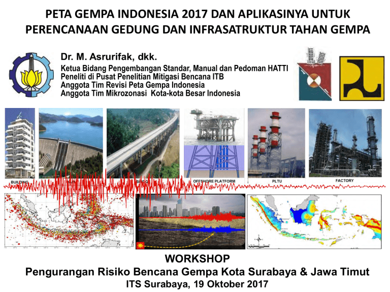 PETA GEMPA INDONESIA 2017 DAN APLIKASINYA UNTUK PERENCANAAN GEDUNG DAN INFRASATRUKTUR TAHAN GEMPA Dr. M. Asrurifak, dkk. Ketua Bidang Pengembangan Standar, Manual dan Pedoman HATTI Peneliti di Pusat Penelitian Mitigasi Bencana ITB Anggota Tim Revisi Peta Gempa Indonesia Anggota Tim Mikrozonasi Kota-kota Besar Indonesia WORKSHOP Pengurangan Risiko Bencana Gempa Kota Surabaya & Jawa Timut ITS Surabaya, 19 Oktober 2017 BAHASAN: • Pendahuluan / Latar belakang • Mitigasi dan Updating Peta Gempa Indonesia • Kondisi Kegempaan Wilayah Indonesia • Peta Gempa Indonesia Baru • Beban Gempa untuk Konstruksi Tahan Gempa • Penutup LATAR BELAKANG Indonesia adalah salah satu negara yang mempunyai wilayah dengan tingkat kegempaan yang sangat tinggi Gempa Utama 1900-2016 (dari total kejadian dng M>5 sebanyak +52.000) LATAR BELAKANG Gempa bumi fenomena alam yang sangat merusak MANUSIA TAK MAMPU MENOLAK Kerusakan Gedung Kerusakan Infrastruktur Longsor Tsunami MENGANTISIPASI RESIKO PENELITIAN Penurunan krn likufaksi STANDARISASI DESAIN STRATEGI PENGURANGAN RESIKO (MITIGASI) GEMPA FENOMENA ALAM GEMPA Sangat potensial mengakibatkan kerugian besar Gempa tidak dapat dicegah Kejadian alam yang belum dapat diperkirakan secara akurat: kapan, dimana, magnituda Efek Gempa Strategi Fault rupture Hindari Tsunami Hindari Kelongsoran (besar) Hindari Likuifaksi Hindari/ Ditanggulangi Goncangan/ Gerakan Tanah Ditanggulangi Sumber BNPB Gempa Pidie Jaya 2016 Gempa Pidie Jaya 2016 Disaster awareness / Kesadaran bencana ? http://www.kaskus.us/showthread.php?t=5192751 http://argakencana.blogspot.com/2010/02/angkutan-motorterunik.html http://arekmozar.blogspot.com/2010_01_01_archive.html http://cewekhonda.blogspot.com/2010_04_01_archive.html http://www.faridnugroho.my.id/2012/11/berbahaya-tapi.html http://archive.kaskus.co.id/thread/8162381/1 http://www.tribunnews.com/images/regional/view/878991/ab aikan-keselamatan http://www.radarpena.com/index.php/kesra/77-kesra/3917-waduhsiswa-di-purwakarta-dikeluarkan-gara-gara-bawa-mobil http://penghuni60.blogspot.com/ http://www.primaironline.com/berita/sosial/jatuh-dari-atapkrl-pria-tergeletak-di-lenteng-agung http://iwandahnial.wordpress.com/2009/12/18/kereta-api-penumpang-%E2%80%9Cluarhttp://www.blogotainmen.com/beginilah-perilakuhttp://www.blogotainmen.com/beginilah-perilaku%E2%80%93-dalam%E2%80%9D/ penumpang-kereta-api-di-indonesia/ penumpang-kereta-api-di-indonesia/ Newton’s 2nd Law: H=mxa H Spectral Acceleration at Bedrock BAHASAN: • Pendahuluan / Latar belakang • Mitigasi dan Updating Peta Gempa Indonesia • Kondisi Kegempaan Wilayah Indonesia • Peta Gempa Indonesia Baru • Beban Gempa untuk Konstruksi Tahan Gempa • Penutup Ada empat hal penting dalam mitigasi bencana, yaitu: 1) Tersedia informasi dan peta kawasan rawan bencana untuk tiap jenis bencana. 2) Sosialisasi untuk meningkatkan pemahaman dan kesadaran masyarakat dalam menghadapi bencana, karena bermukim di daerah rawan bencana. 3) Mengetahui apa yang perlu dilakukan dan dihindari, serta mengetahui cara penyelamatan diri jika bencana timbul. 4) Pengaturan dan penataan kawasan rawan bencana untuk mengurangi ancaman bencana. Adanya kejadian gempa-gempa signifikan yang belum diakomodir Peta sebelumnya Aceh Earthquake Mw=9.2 (December, 2004) Gempa Pidie Jaya Mw=6.5 (7 Desember, 2016) Simeuleu Earthquake Mw=8.5 (11 April, 2012) Nias Earthquake Mw=8.6 (March, 2005) Simeuleu Earthquake Mw=8.1 (11 April, 2012) Padang Earthquake Mw=7.6 Jambiimprovements Earthquake Mw=6.6 Why does the(Sept, current code require ? 2009) (Oct, 2009) Earthquake Mw=7.2 1. Mentawai To considers recent great earthquakes in Indonesia (Oct, 2010) Tasik Earthquake Mw=7.4 (Sept, 2009) Yogya Earthquake Mw=6.3 (May, 2006) Kejadian Gempa dalam 2 Windu Terakhir USGS INFORMASI TERBARU PARAMETER SUMBER-SUMBER GENPA YANG BELUM DIAKOMODIR DI PETA GEMPA LAMA 81 sesar aktif untuk input PSHA 11 model Subduksi untuk input PSHA Input Parameter Peta Gempa Indonesia, 2010 PARAMETER SUMBER GENPA TERBARU 2017 (251 SESAR AKTIF UNTUK INPUT PSHA) SESAR DI SUMATRA DAN SEKITARNYA PARAMETER SUMBER GENPA TERBARU 2017 (251 SESAR AKTIF UNTUK INPUT PSHA) SESAR DI JAWA DAN SEKITARNYA PARAMETER SUMBER GENPA TERBARU 2017 (251 SESAR AKTIF UNTUK INPUT PSHA) SESAR DI SULAWESI DAN SEKITARNYA PARAMETER SUMBER GENPA TERBARU 2017 (251 SESAR AKTIF UNTUK INPUT PSHA) SESAR DI PAPUA DAN SEKITARNYA PARAMETER SUMBER GENPA TERBARU 2017 (251 SESAR AKTIF UNTUK INPUT PSHA) SESAR DI NUSATENGGARA-BANDA DAN SEKITARNYA PARAMETER SUMBER GENPA TERBARU 2017 (251 SESAR AKTIF UNTUK INPUT PSHA) SESAR DI KALIMANTAN DAN SEKITARNYA Segmentasi Megathrust Peta Gempa Nasional 2017 RIWAYAT PETA GEMPA INDONESIA 1966 - 2016 Seismic Hazard Map of Indonesia (Peraturan Perencanaan Tahan Gempa Indonesia untuk Gedung 1983) SNI-03-1726-2002 merupakan peta percepatan gempa yang nilainya diambil dari rerata hasil yang dilakukan oleh empat penelitian dari berbagai latar belakang Jodi Firmansyah & Masyhur Irsyam Teddy Boen & Haresh Shah SNI-03-1726-2002 Di Bedrock Engkon Kertapati Theo F Najoan TIM REVISI PETA GEMPA INDONESIA 2010 (Dibentuk oleh Kementrian Pekerjaan Umum 1 Desember 2009) Masyhur Irsyam (Earthquake Geotechnical Engineering ITB – Chair) Wayan Sengara (Earthquake Geotechnical Engineering ITB – Vice Chair) Fahmi Almadiar (Seismic Hazard - Dept. Public Work - Secretary) M Asrurifak (Seismic Hazard - ITB) Danny Hilman (Geology - Indonesia Research Institute) Engkon Kertapati (Geology - Geological Research Center) M. Ridwan (Geology - Dept. Public Work) Irwan Meilano (Geodesy, Crustal Deformation – ITB) Sri Widiantoro (Geophysics - ITB) Wahyu Trioso (Geophysics - ITB) Suhardjono (Geophysics - Berau of Geophysics-Climatology-Meteorology) Phil Cummins Geo Science Australia Mark Petersen USGS Peta Hazard Gempa 2010 ➢ ➢ ➢ ➢ ➢ Gempa berkekuatan besar, seperti : Gempa Aceh 2004 (Mw=9,2); Nias 2005 (Mw 8,5); Jogja 2006 (Mw=6,3); Tasik 2009 (Mw=7,4); Bengkulu 2007 (Mw=8,7); padang 2009 (Mw=7,6